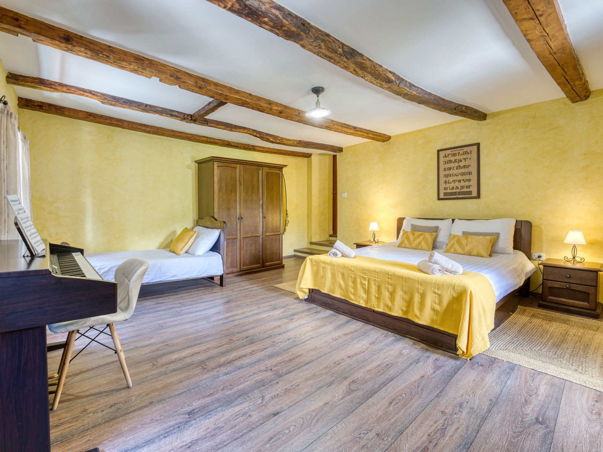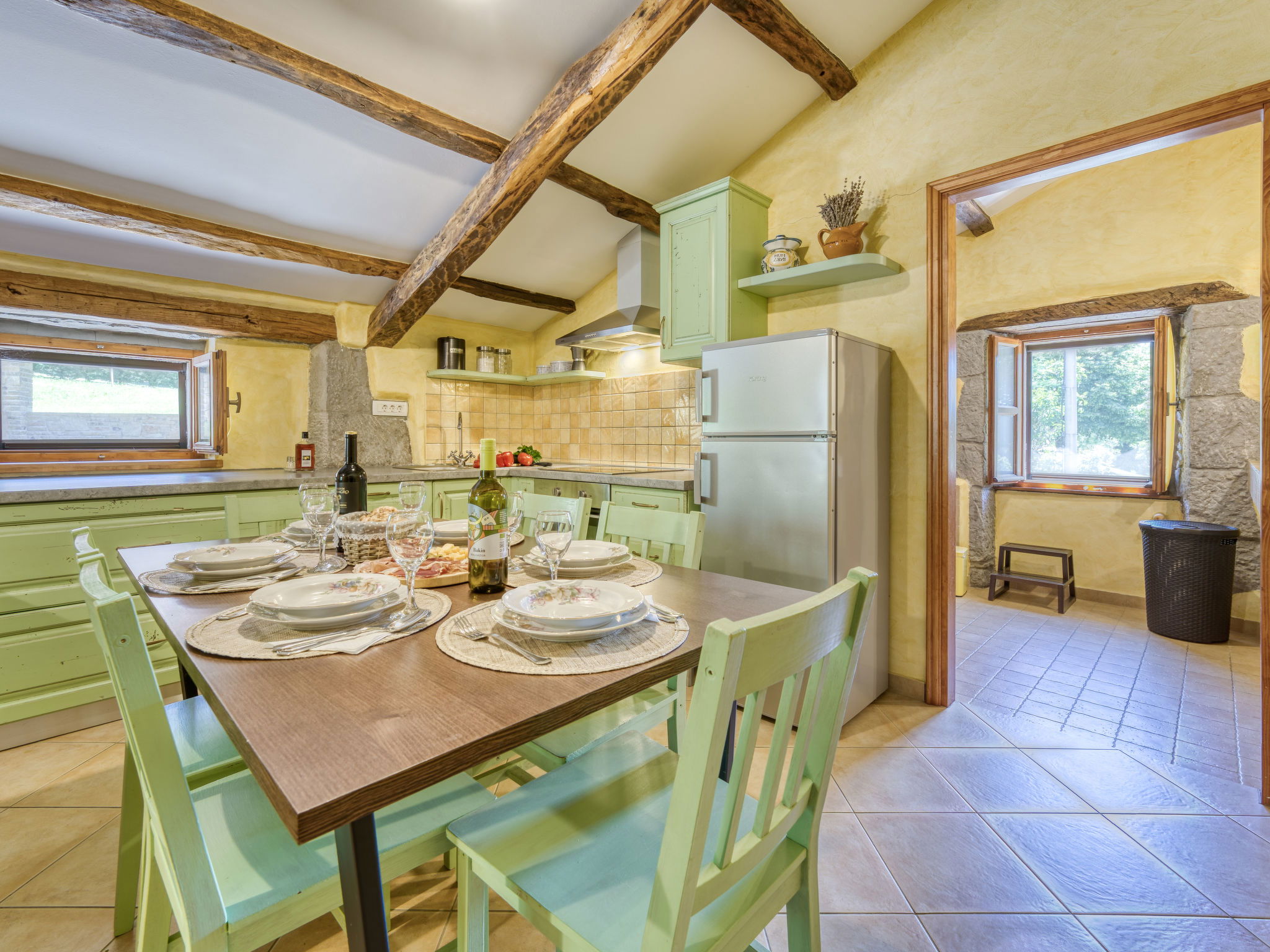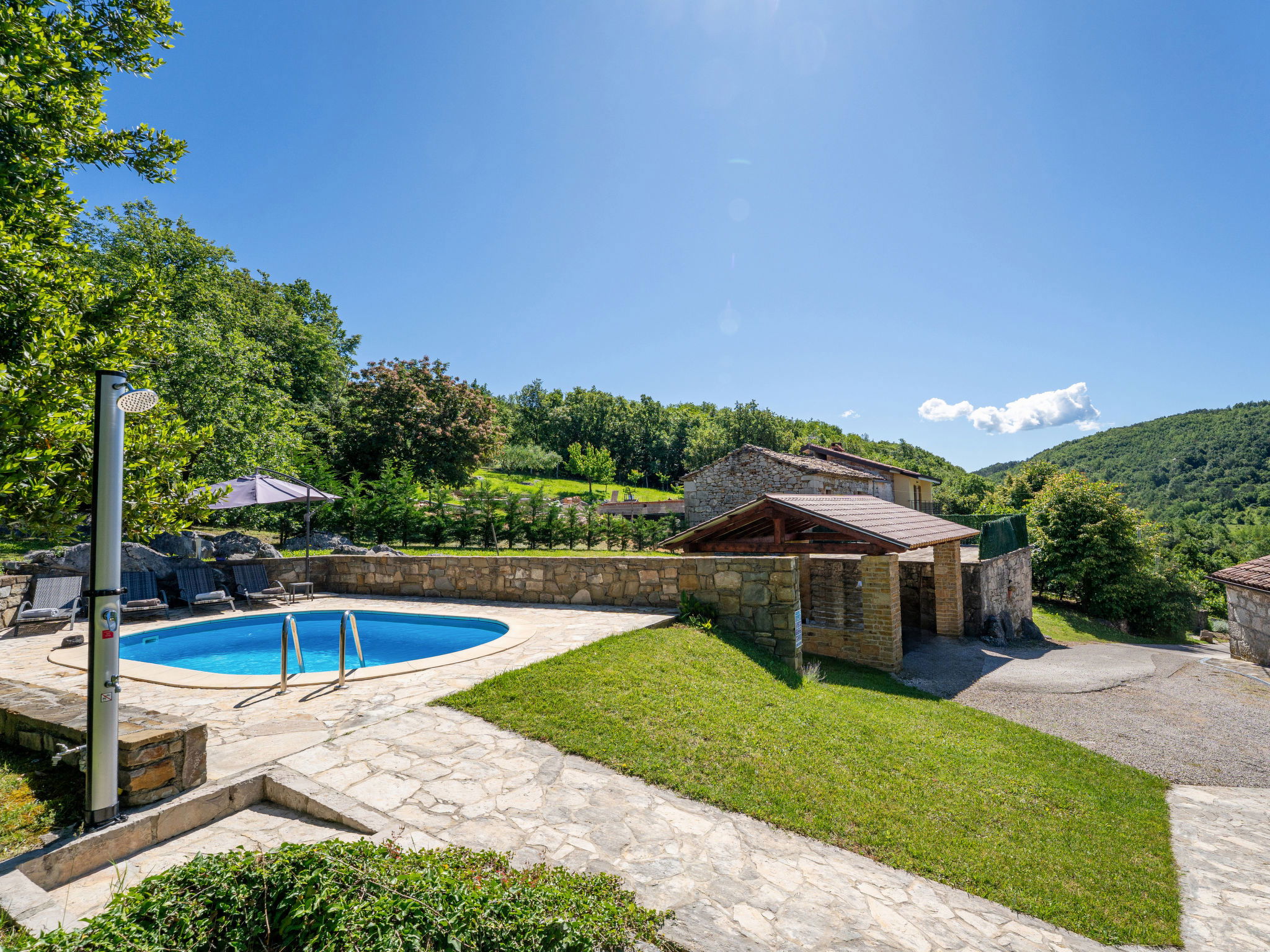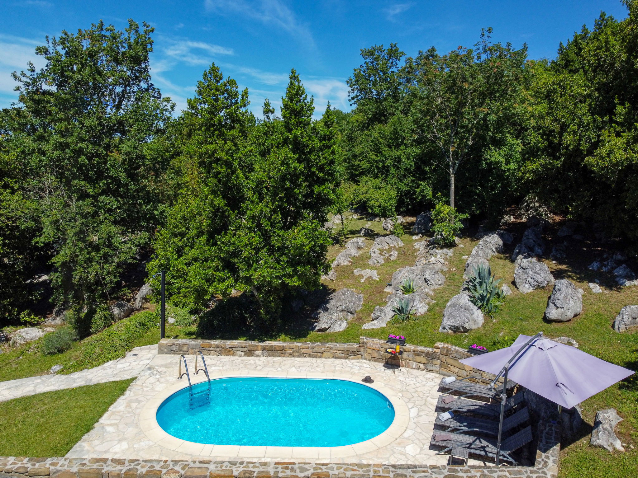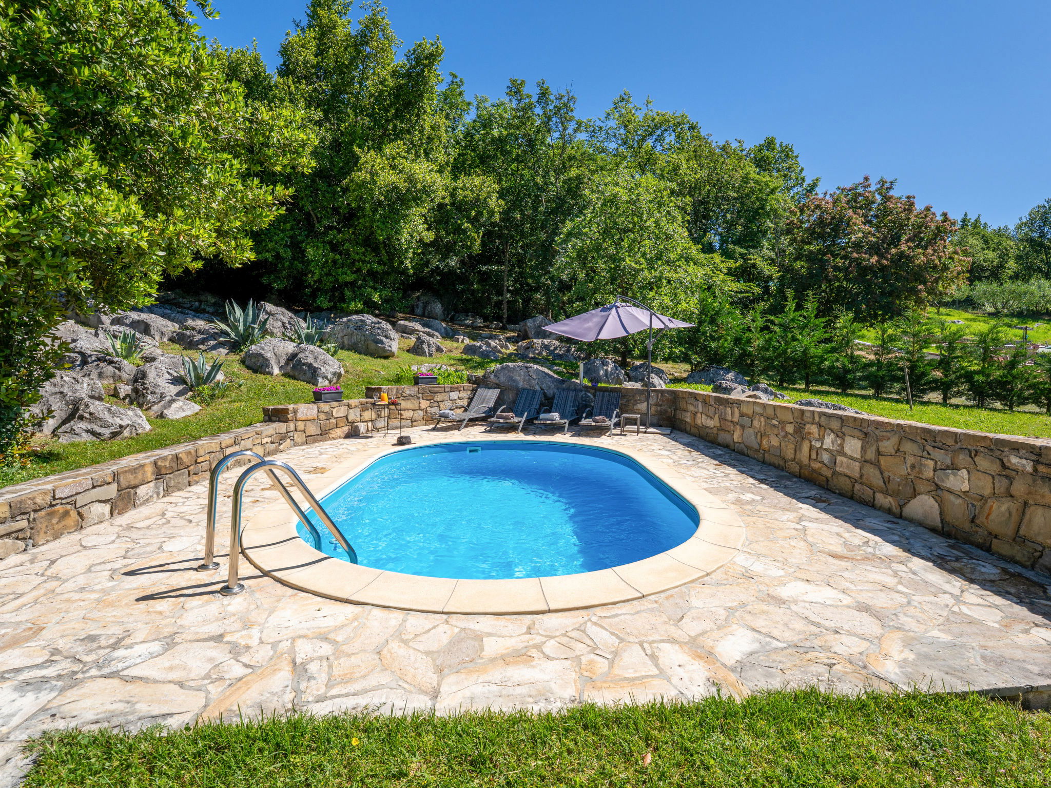 Semi-detached house "Kapitani", 2 storeys, surrounded by trees. In the hamlet Brnobići 2.5 km from the centre of Hum, 5 km from the centre of Roč, 11 km from the centre of Buzet, in a quiet, sunny, elevated position, 40 km from the sea, in a cul-de-sac, in the countryside. Private: property 900 m2, swimming pool (20 m2, depth 130 cm, seasonal availability: 01.Jun. - 30.Sep.). Barbecue. In the house: internet access, washing machine. Parking at the house on the premises. Shop 5 km, restaurant 2.5 km, bus stop 5.1 km, pebble beach 40 km. Ground floor is closed and not occupied.
