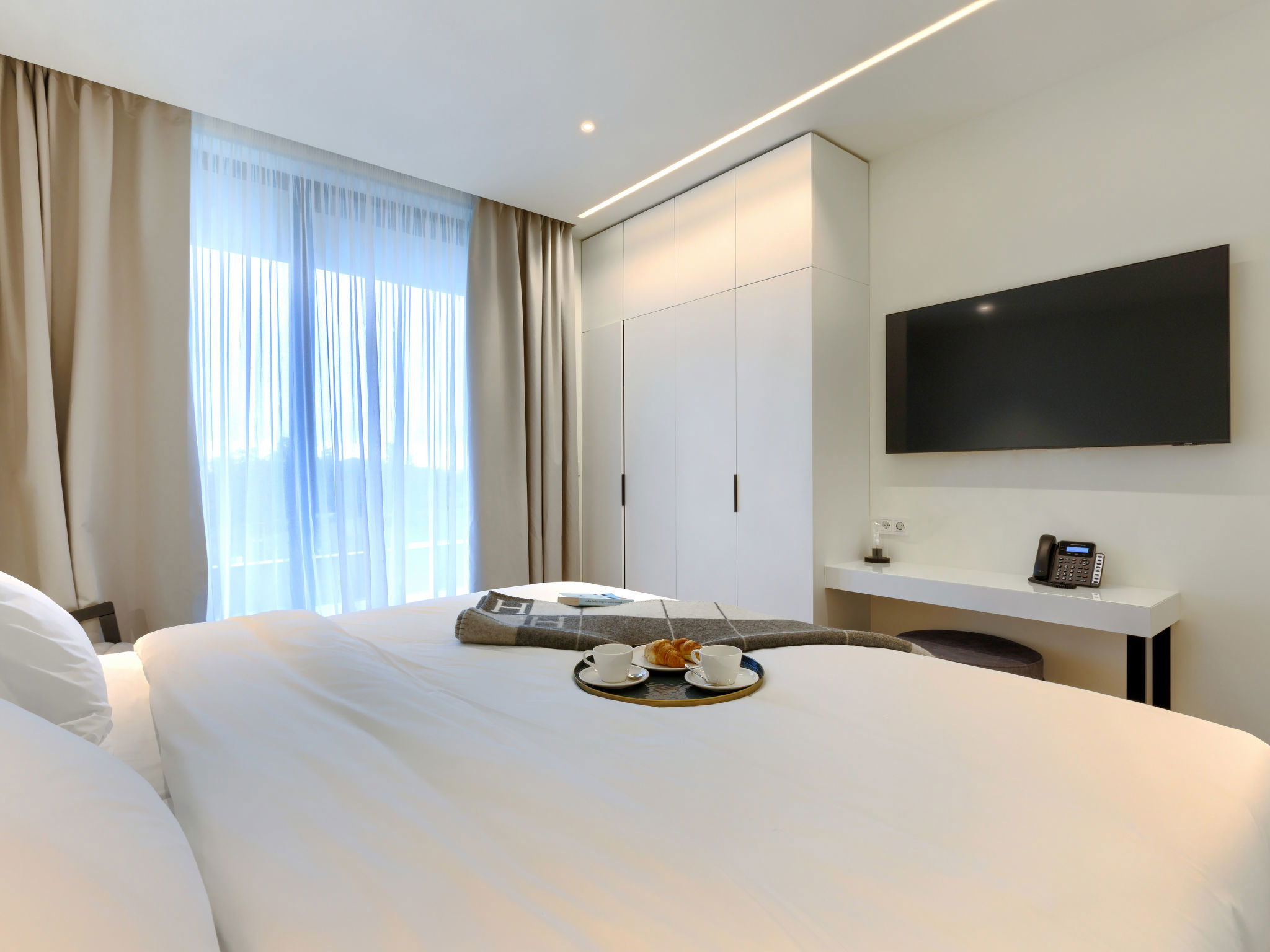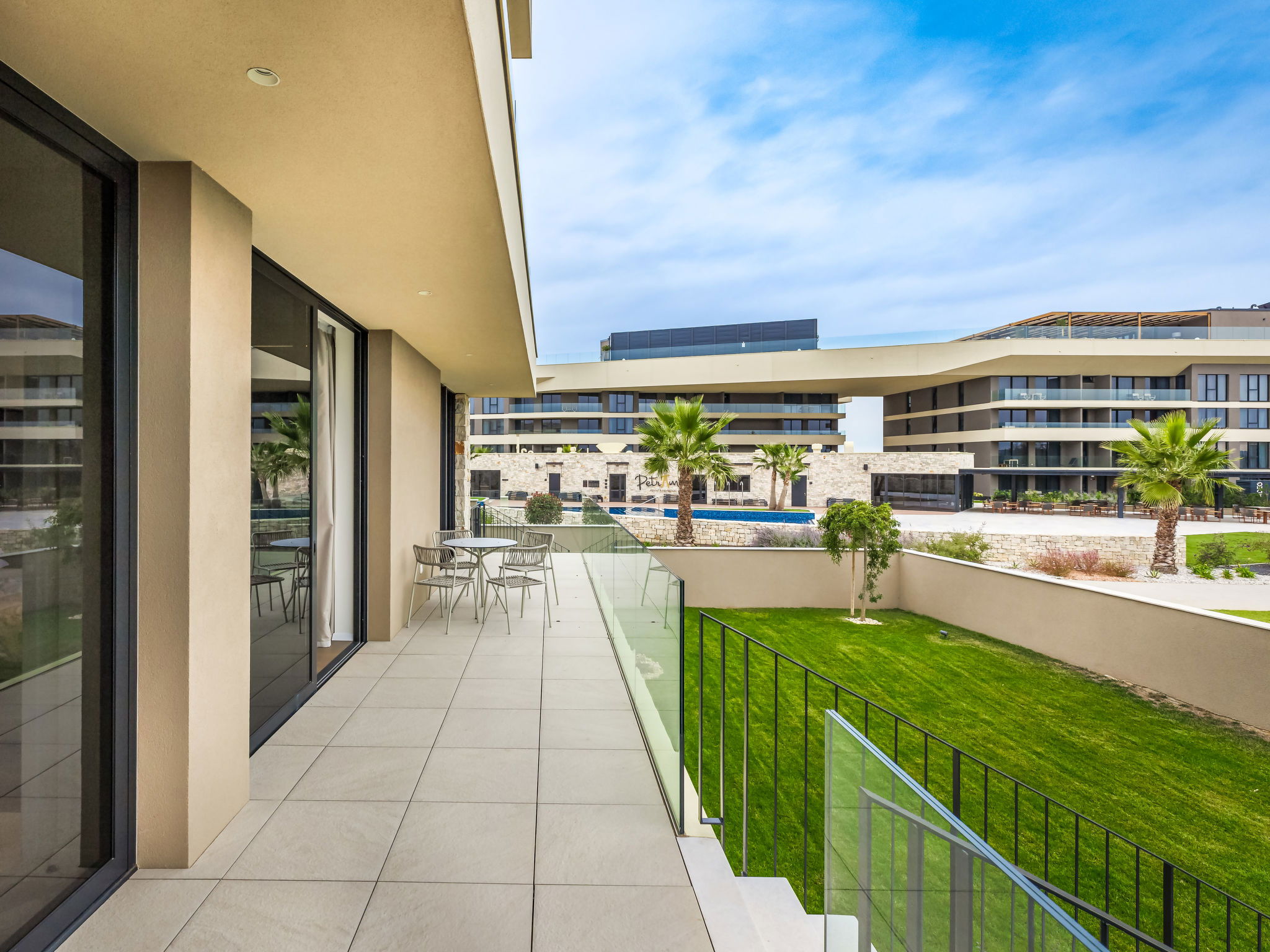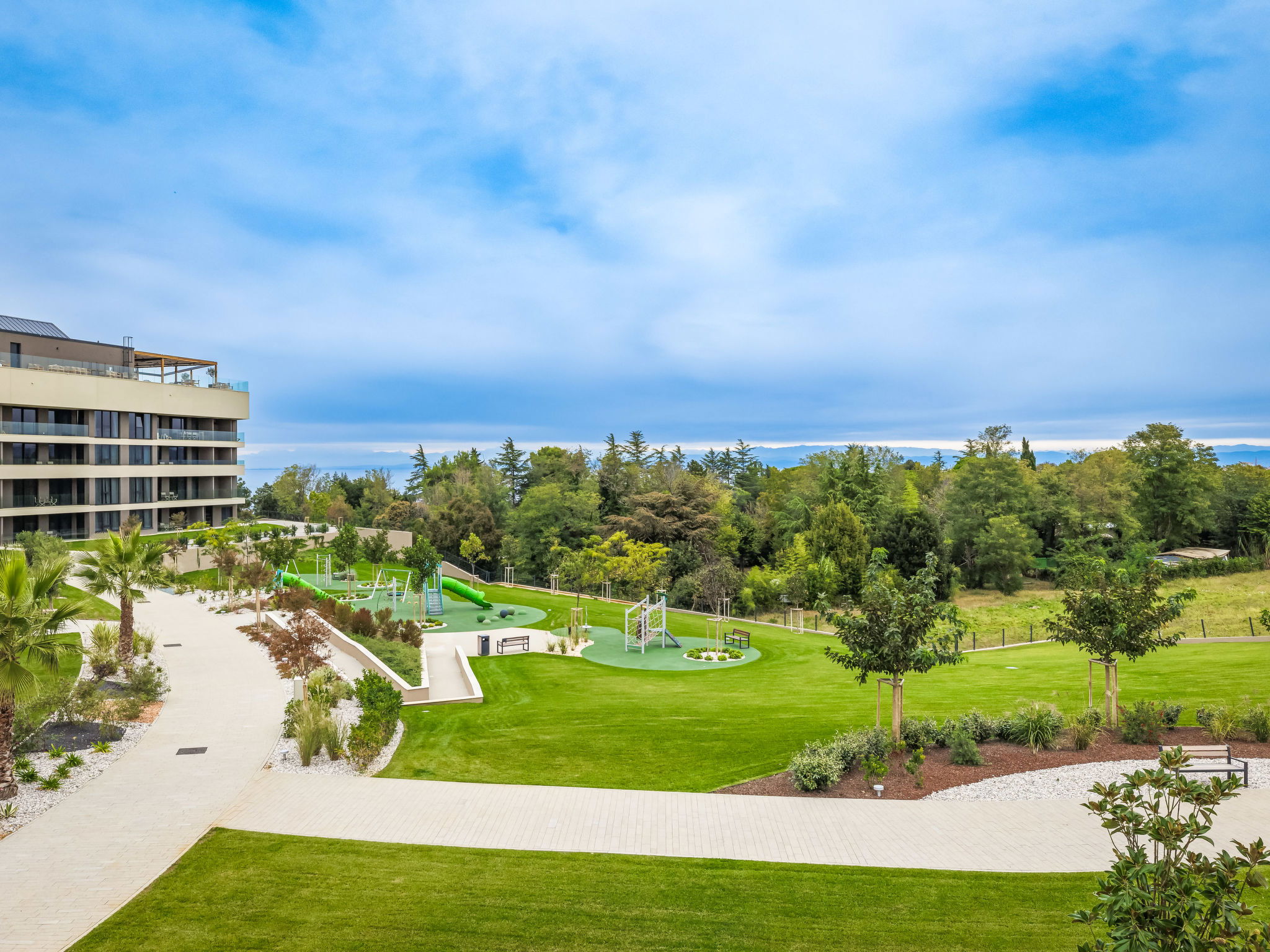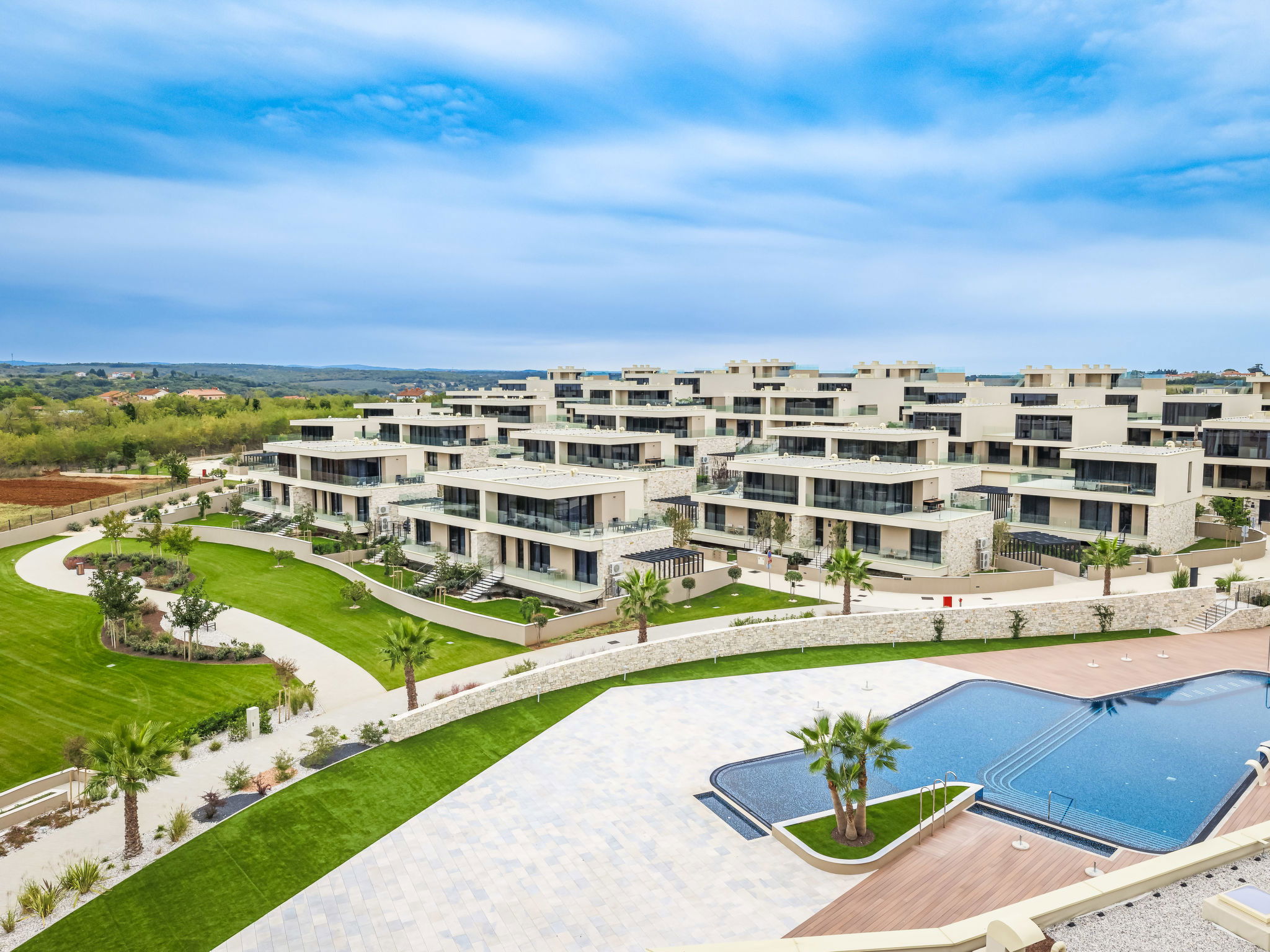 Semi-detached house "Semi-detached Villas Crveni vrh", built in 2023. 1.5 km from the centre of Savudrija, 10 km from the centre of Umag, in a quiet position on a slope, residential area (villas), 500 m from the sea. For shared use: property with lawn, 2 swimming pools, indoor pool (105 m diameter, depth 50 - 140 cm, seasonal availability: 01.Jan. - 31.Dec.) with internal staircase. Unconventional pool shape. Shower/WC in the pool area, children's pool, tennis (extra), children's playground. Private: property (fenced). In the complex: reception, restaurant, bar, bistro, internet access, sauna, fitness room, massage (extra). Hot tub, relaxation room, spa area, playroom, shopping facilities, lift, sun terrace. Parking at the house on the premises. Shop 1 km, supermarket 10 km, bus stop 8 km, railway station 33 km, sandy beach 5 km pebble beach 2 km, rocky beach 500 m. Golf course (18 hole) 2 km, tennis 500 m, walking paths from the house 100 m. Please note: 24hr guard. The photograph shows a typical example. Neighbourhood highly sensitive to noise. Quietness and good behaviour expected.