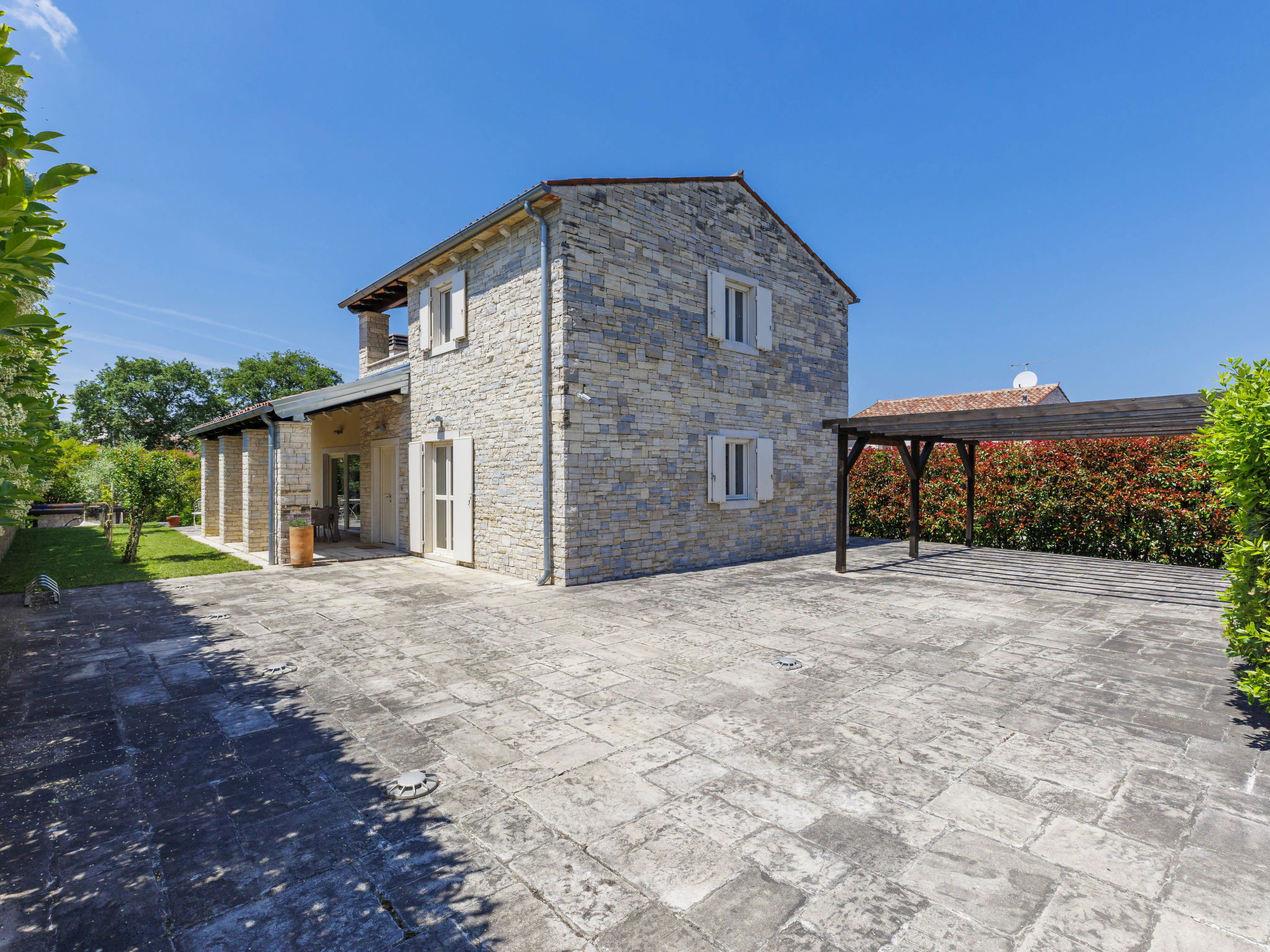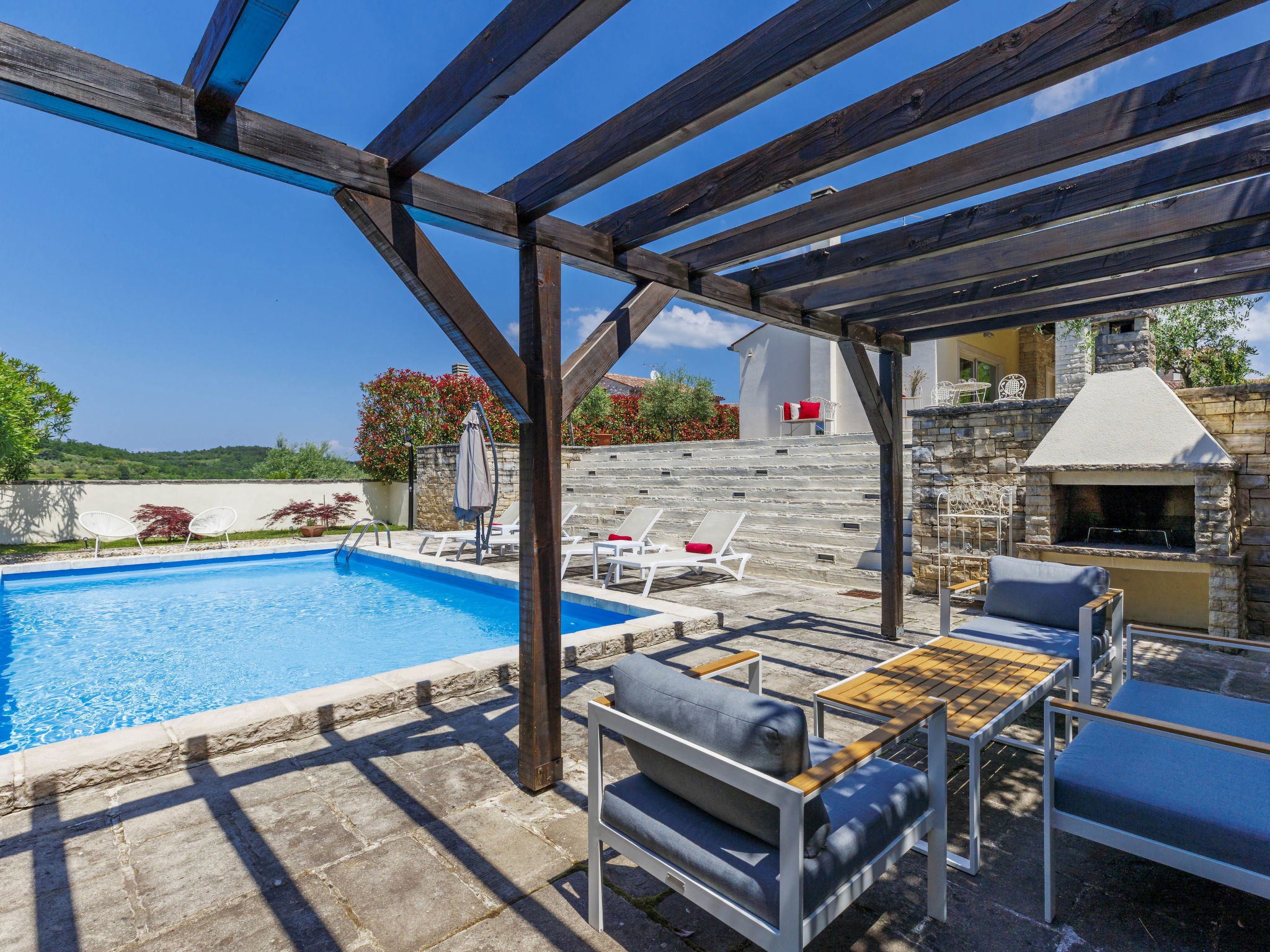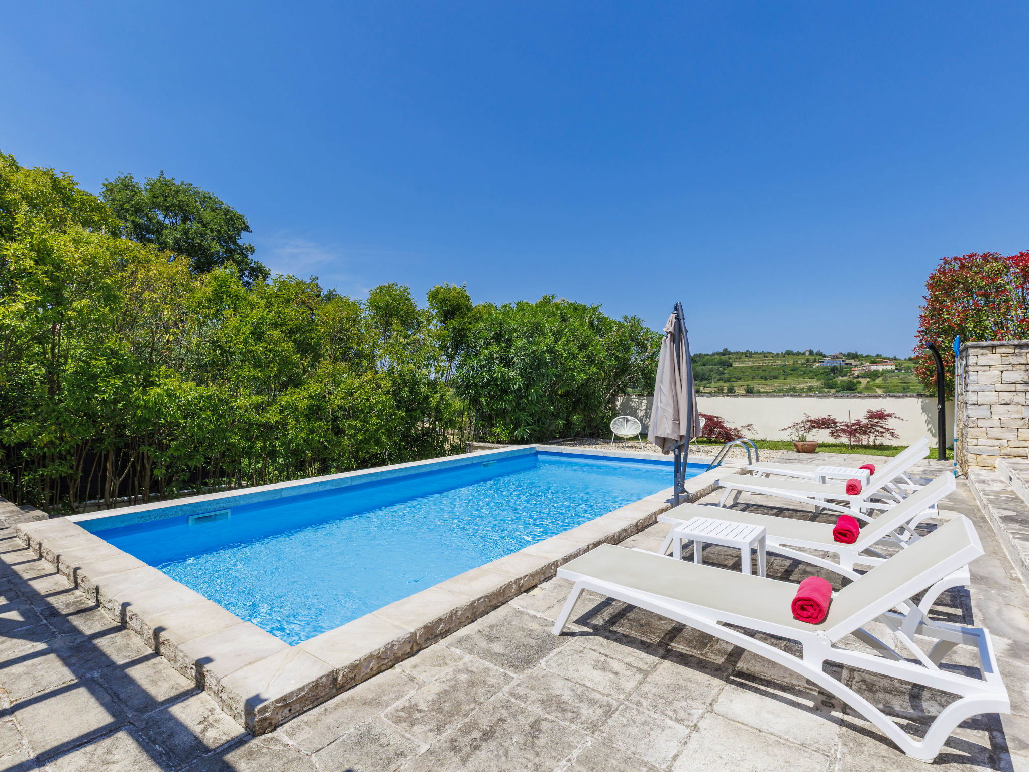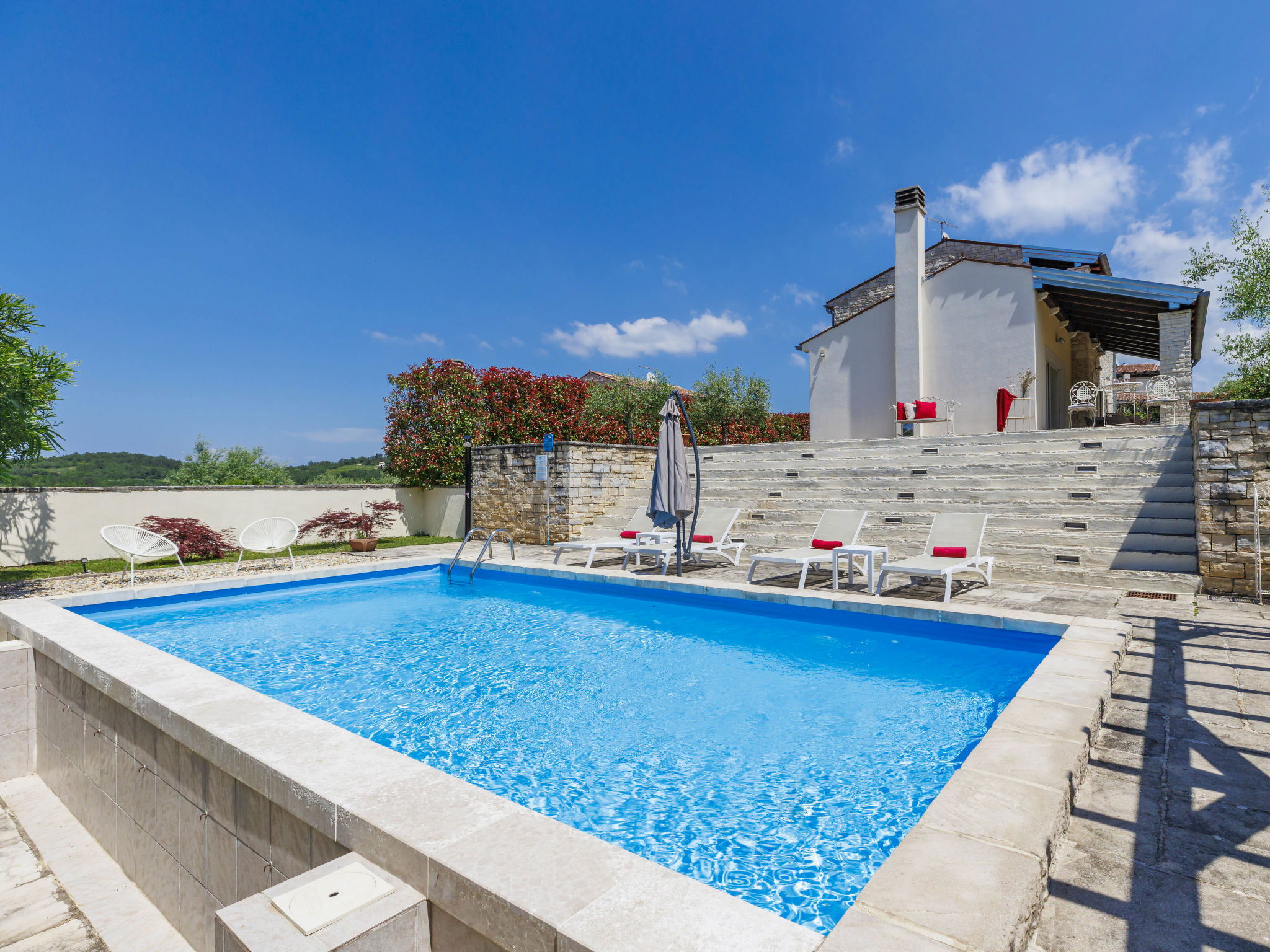 Momjan 5 km from Buje: Single-family house "Villa Samanta", 2 storeys. In a sunny position, 17 km from the sea. Private: property 500 m2 with lawn, swimming pool (8 x 4 m, depth 130 cm, seasonal availability: 01.May. - 30.Sep.) with salt-electrolysis pool-cleaning system. Outdoor shower, pergola (30 m2), garden furniture, barbecue. In the house: internet access, washing machine. Parking (for 2 cars) at the house on the premises. Shop 200 m, restaurant 150 m, bus stop 13.1 km, pebble beach 20 km, concrete beach 20 km. Walking paths from the house 200 m, cycle lane 250 m. Nearby attractions: aquapark 16 km. The owner does not accept any youth groups.