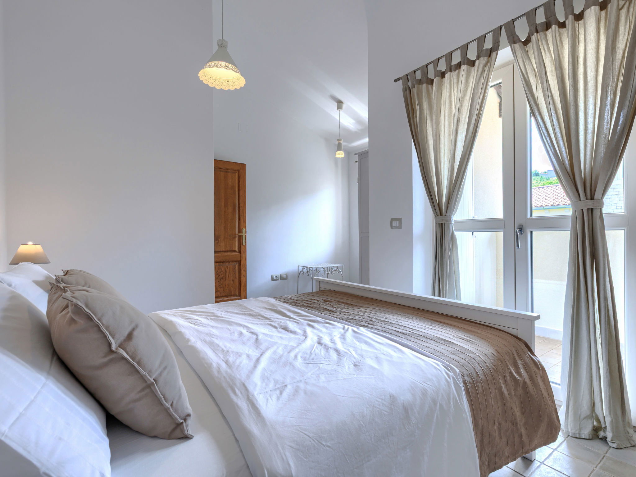 3-room house 120 m2 on 2 levels. Beautiful furnishings: living/dining room with 1 sofabed (120 cm, length 200 cm), satellite TV (flat screen), air conditioning. Exit to the terrace. Open kitchen (oven, dishwasher, 4 ceramic glass hob hotplates, toaster, kettle, microwave, freezer, electric coffee machine). Shower/bidet/WC. Upper floor: 1 room with 1 french bed (160 cm, length 200 cm), air conditioning. 1 room with 1 french bed (160 cm, length 200 cm), air conditioning. Exit to the balcony. Bath/bidet/WC. Forced-air heating. Small balcony 5 m2, terrace 30 m2. Terrace furniture, deck chairs. Facilities: iron, hair dryer. Internet (WiFi, free).