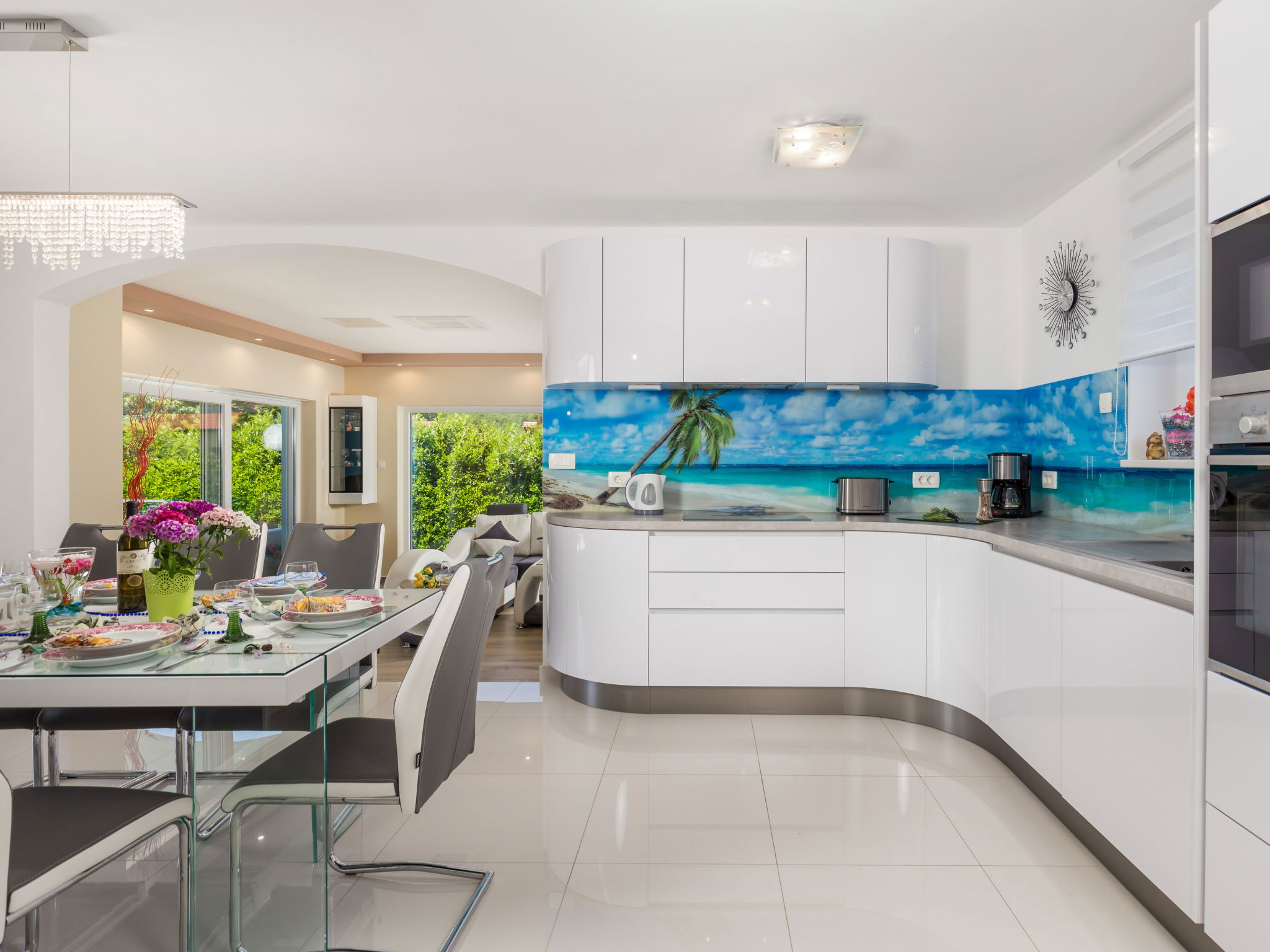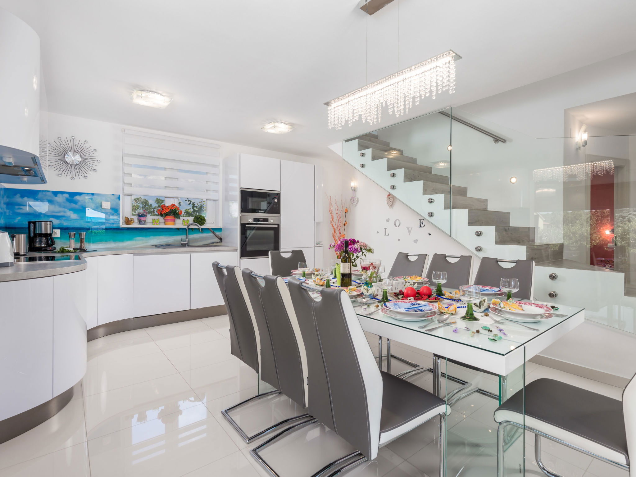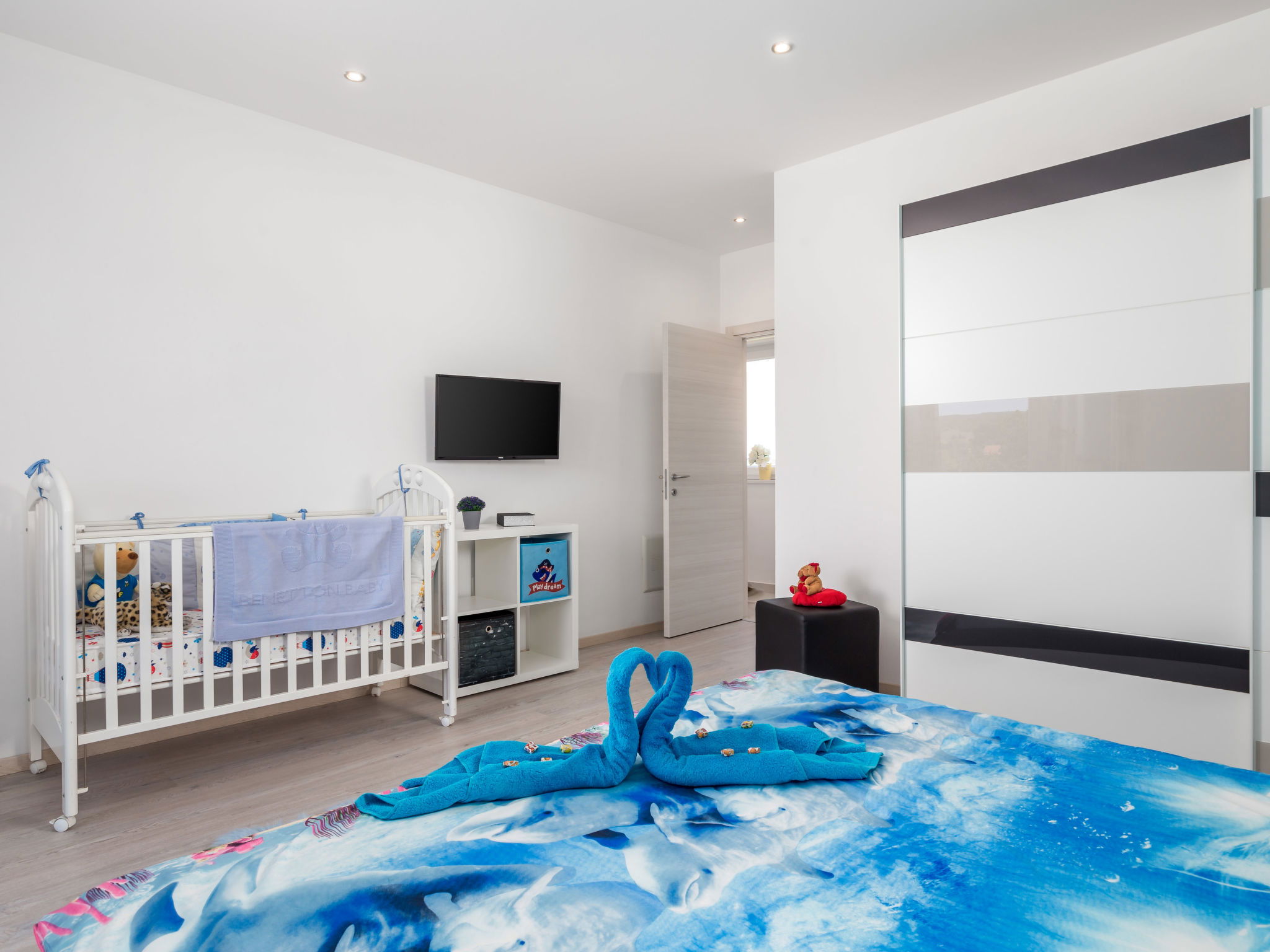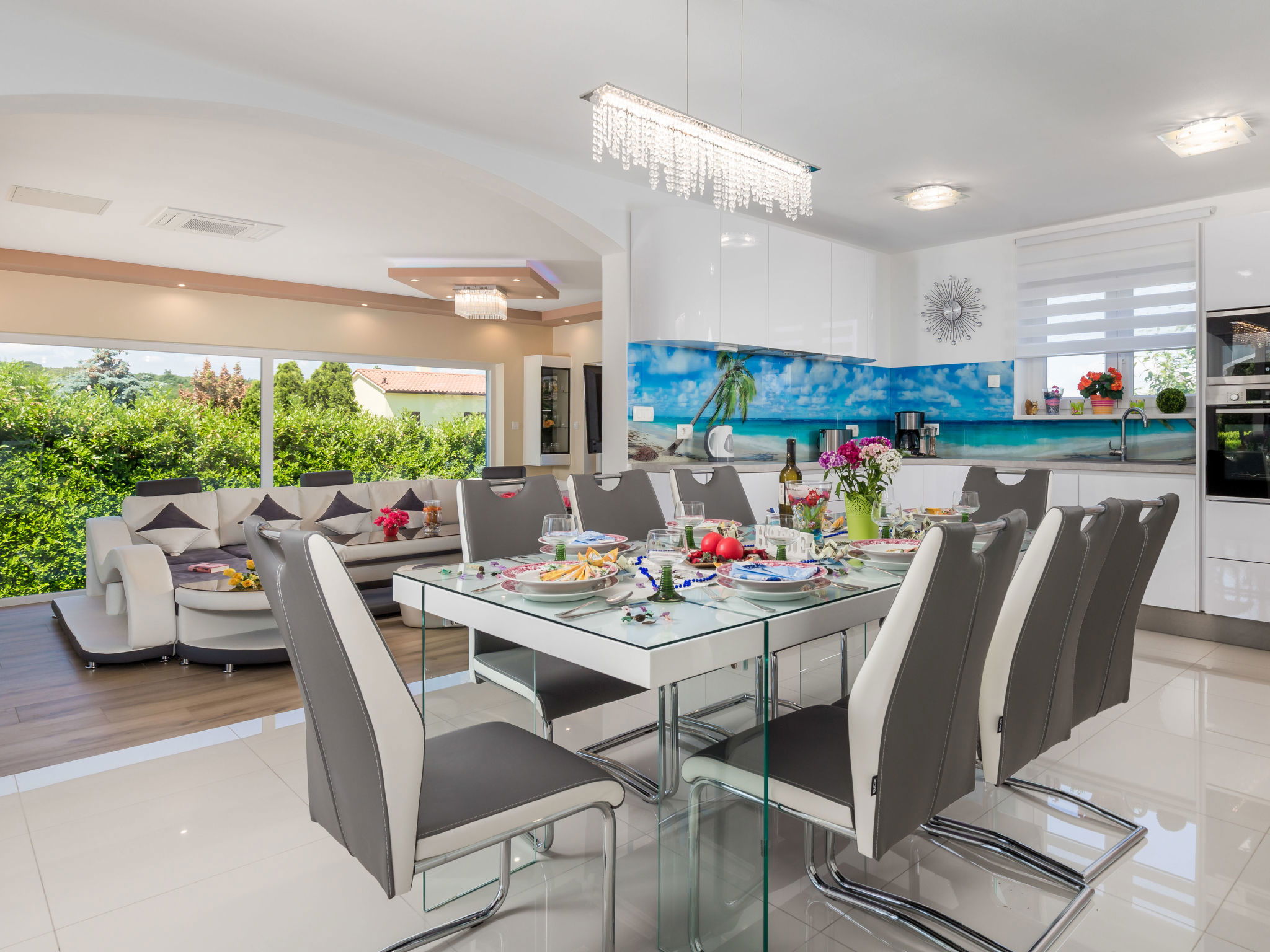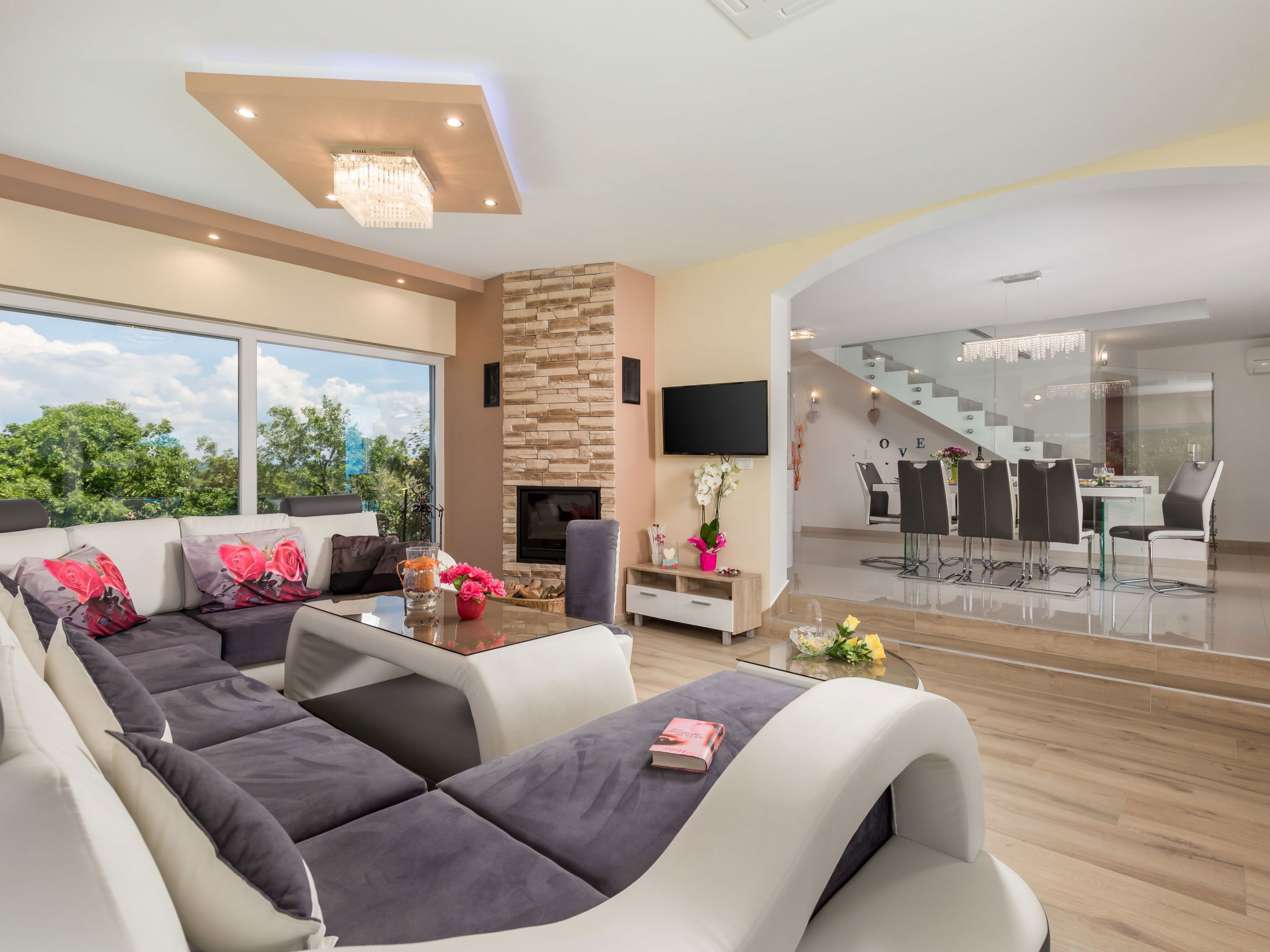 Single-family house "Villa Gabriel", 2 storeys. In the hamlet Kapelica 5 km from the centre of Labin, 10 km from the centre of Rabac, 40 km from the centre of Pula, 9 km from the sea. Private: property 900 m2 (fenced) with lawn and wildlife garden, swimming pool (28 m2, depth 130 cm, seasonal availability: 06.May. - 07.Oct.). Unconventional pool shape. Outdoor shower, table tennis, patio (10 m2) (slide, swing). In the house: internet access, table football, washing machine. Motor access to the house (50 m via unmade road). Parking (for 3 cars) on the premises. Shop 5 km, supermarket 5 km, bus stop 5.5 km, pebble beach 10 km, rocky beach 10 km. Marina 10 km.