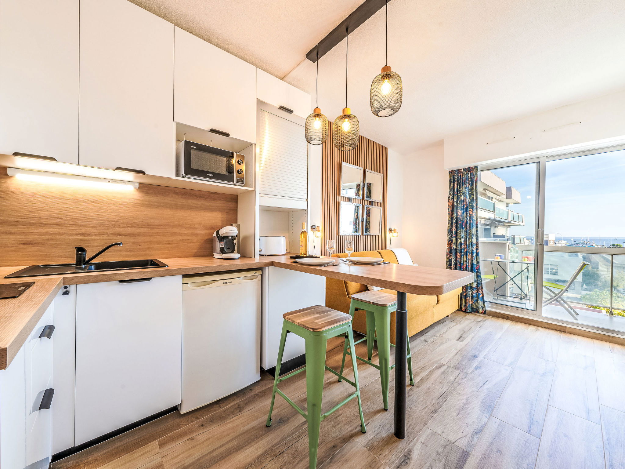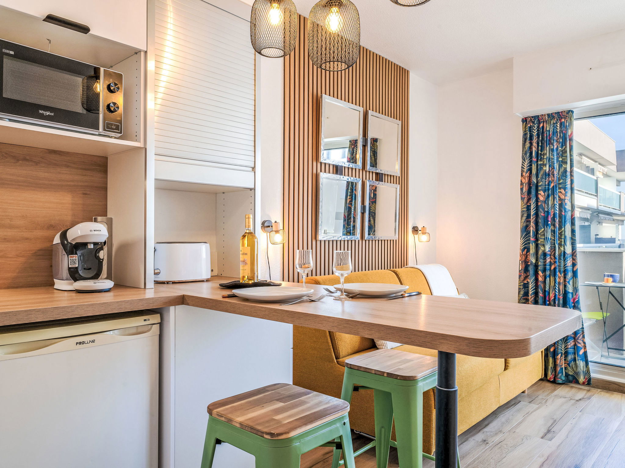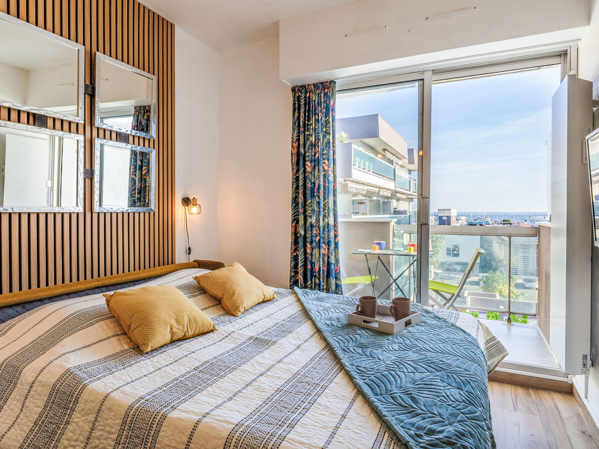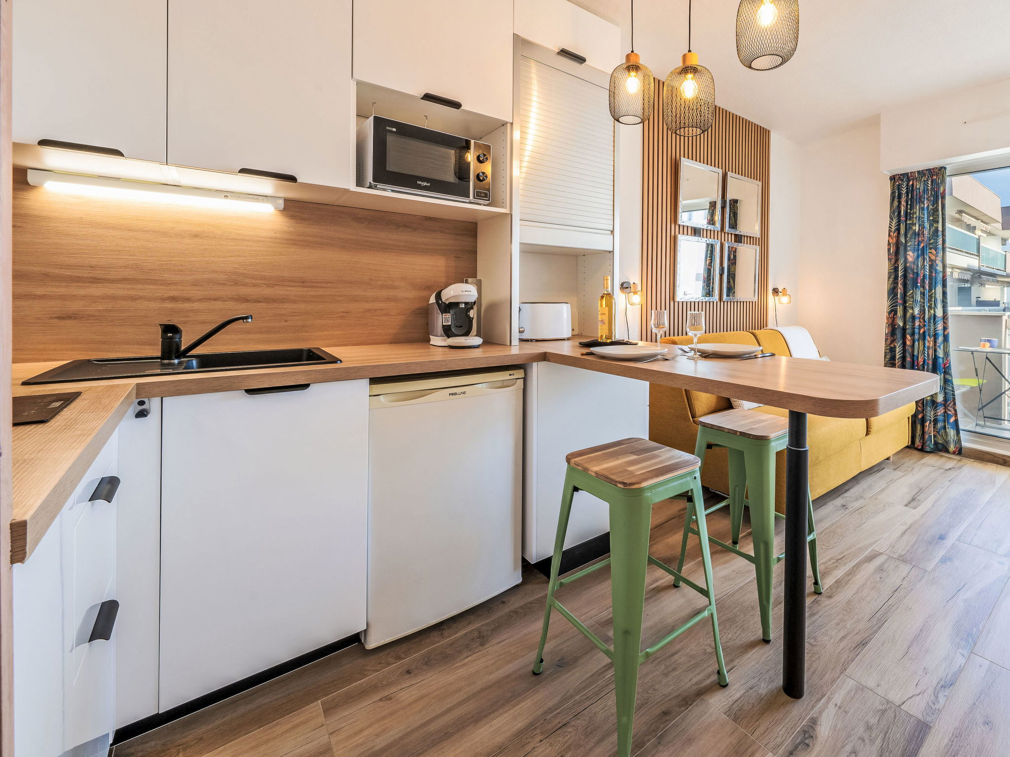1-room studio 20 m2 on 4th floor. Renovated in 2025, beautiful and tasteful furnishings: living/dining room with 1 double sofabed (1 x 140 cm, length 190 cm), TV (flat screen). Exit to the balcony. Open kitchen (dishwasher, 2 induction hot plates, toaster, kettle, electric coffee machine, Capsules for coffee machine (Tassimo) extra, combination microwave). Shower/WC. Electric heating. Balcony 5 m2, north facing position. Balcony furniture. Partial view of the sea. Facilities: hair dryer. Internet (WiFi, free). Parking space n 368 (fenced 1 car). Please note: smoke alarm. Offer by a private individual according to Art. 155, IV of CGI. 33009003339EA