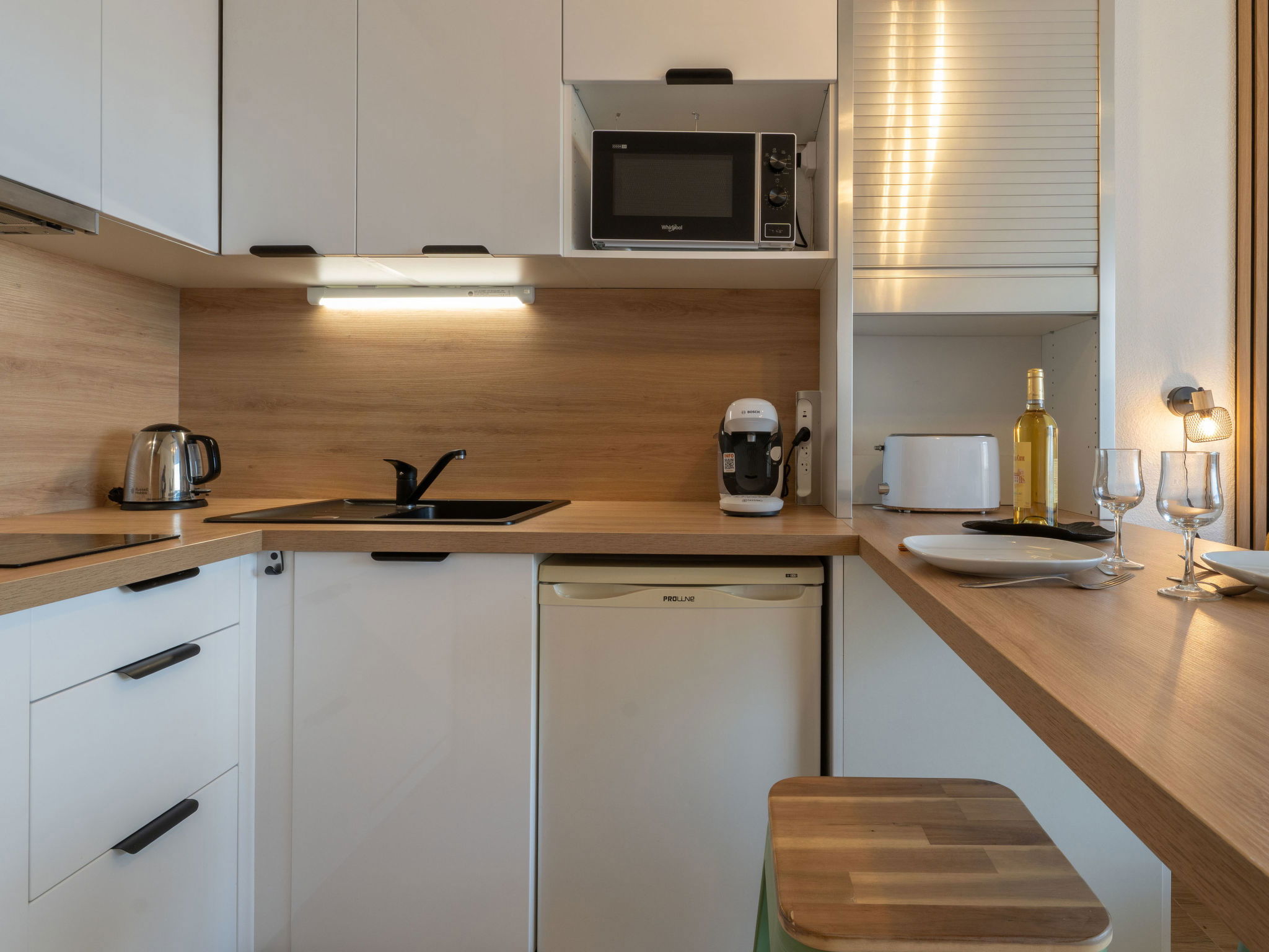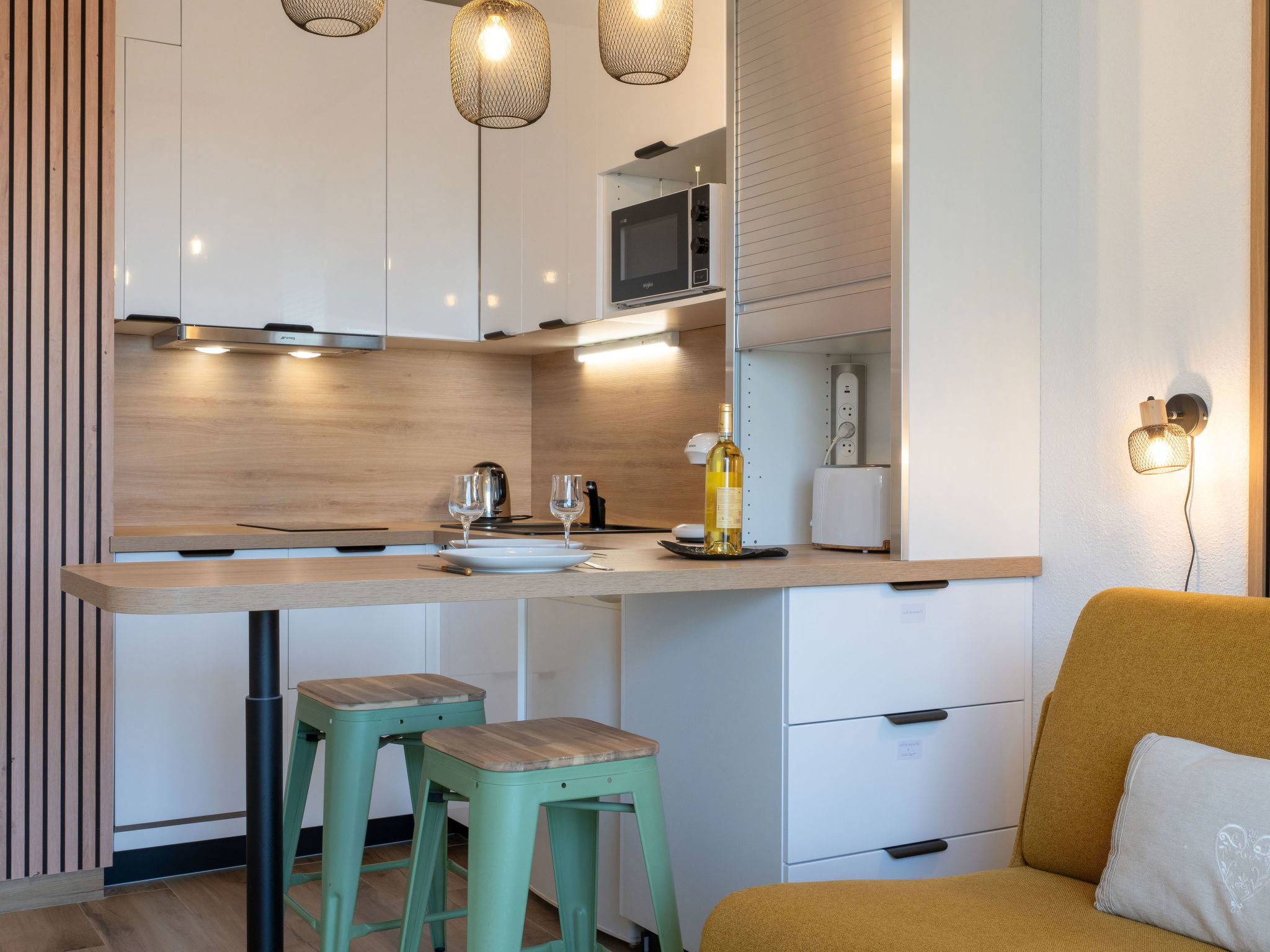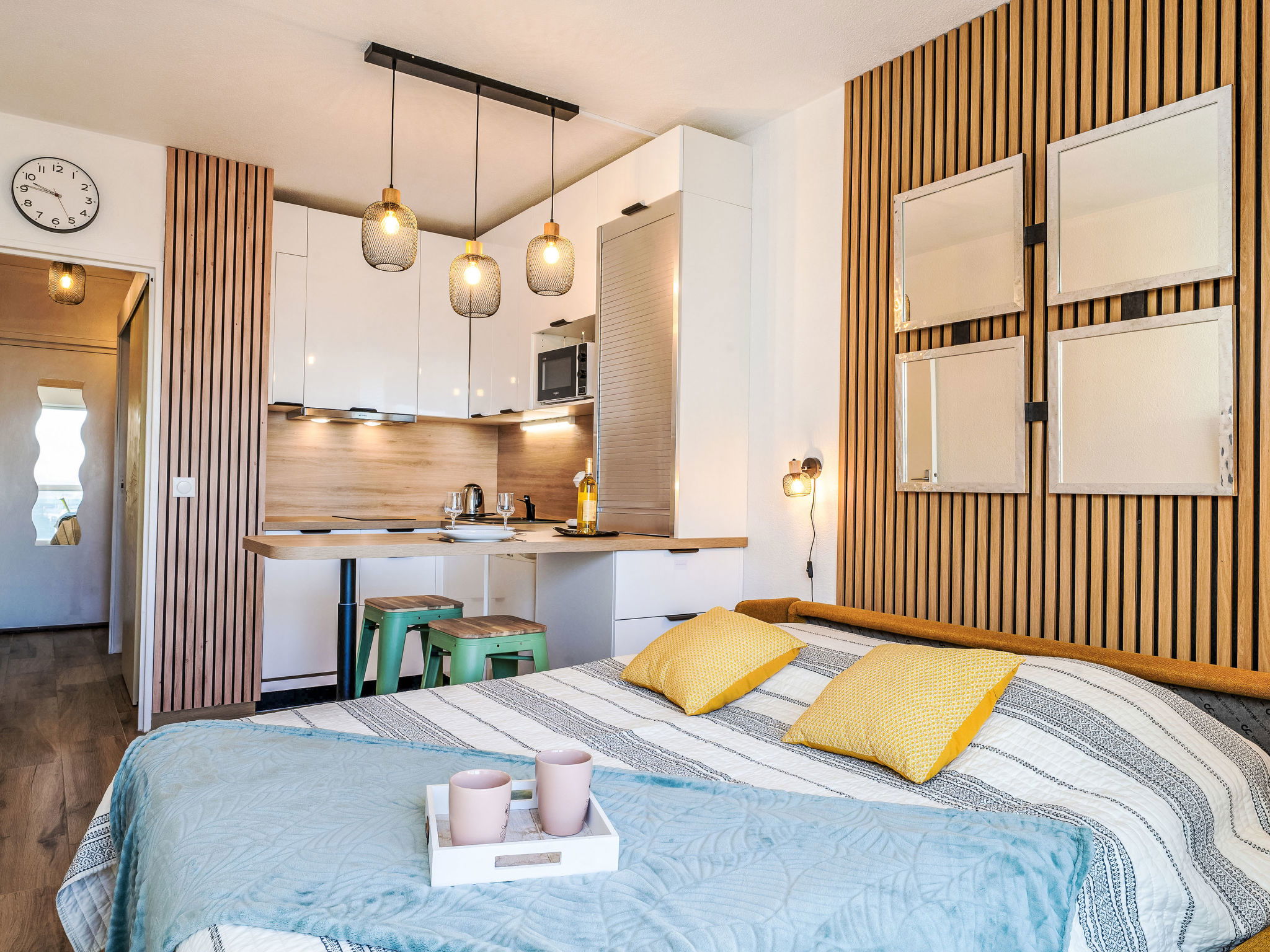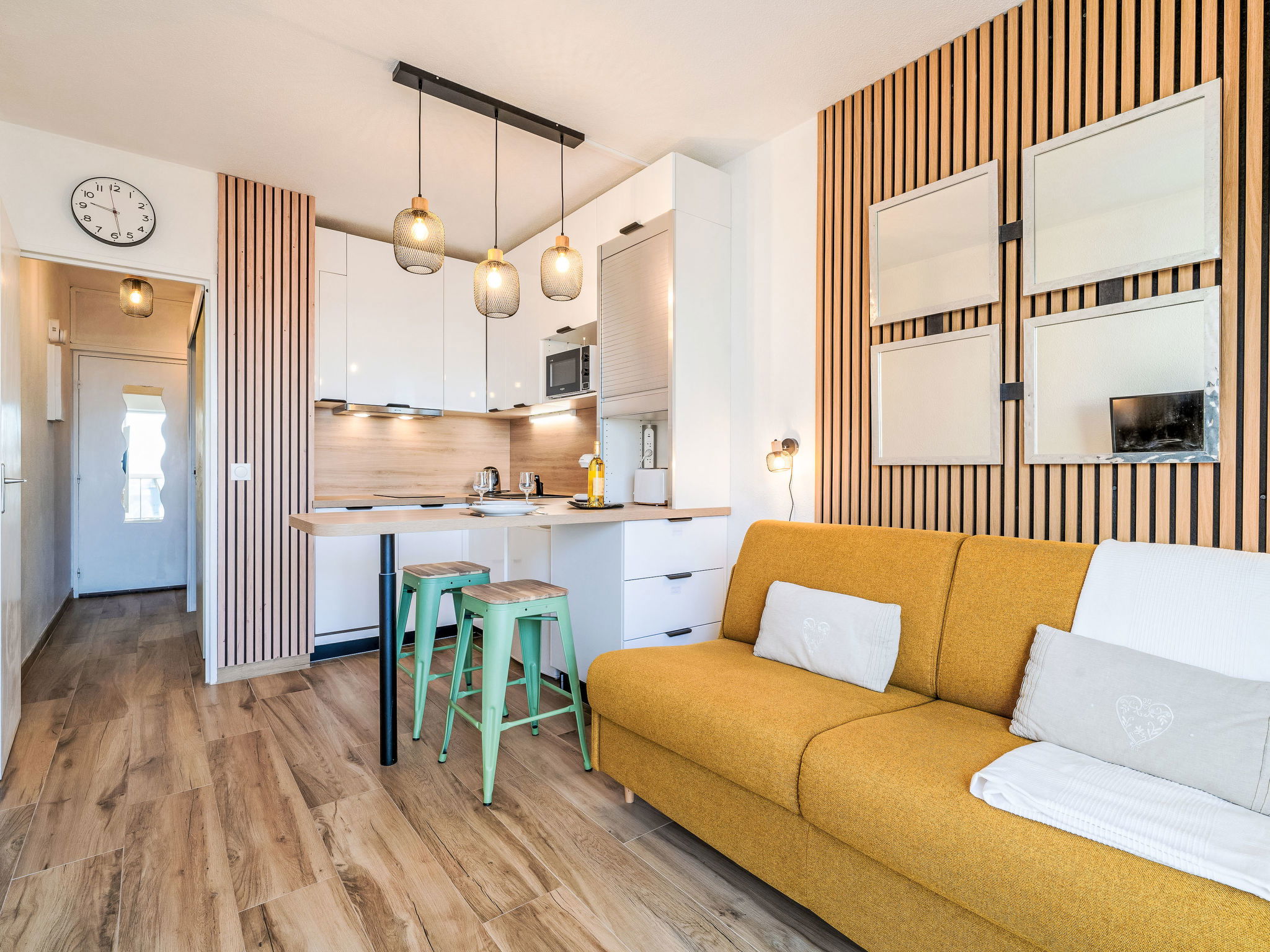 1-room studio 20 m2 on 4th floor. Renovated in 2025, beautiful and tasteful furnishings: living/dining room with 1 double sofabed (1 x 140 cm, length 190 cm), TV (flat screen). Exit to the balcony. Open kitchen (dishwasher, 2 induction hot plates, toaster, kettle, electric coffee machine, Capsules for coffee machine (Tassimo) extra, combination microwave). Shower/WC. Electric heating. Balcony 5 m2, north facing position. Balcony furniture. Partial view of the sea. Facilities: hair dryer. Internet (WiFi, free). Parking space n 368 (fenced 1 car). Please note: smoke alarm. Offer by a private individual according to Art. 155, IV of CGI. 33009003339EA