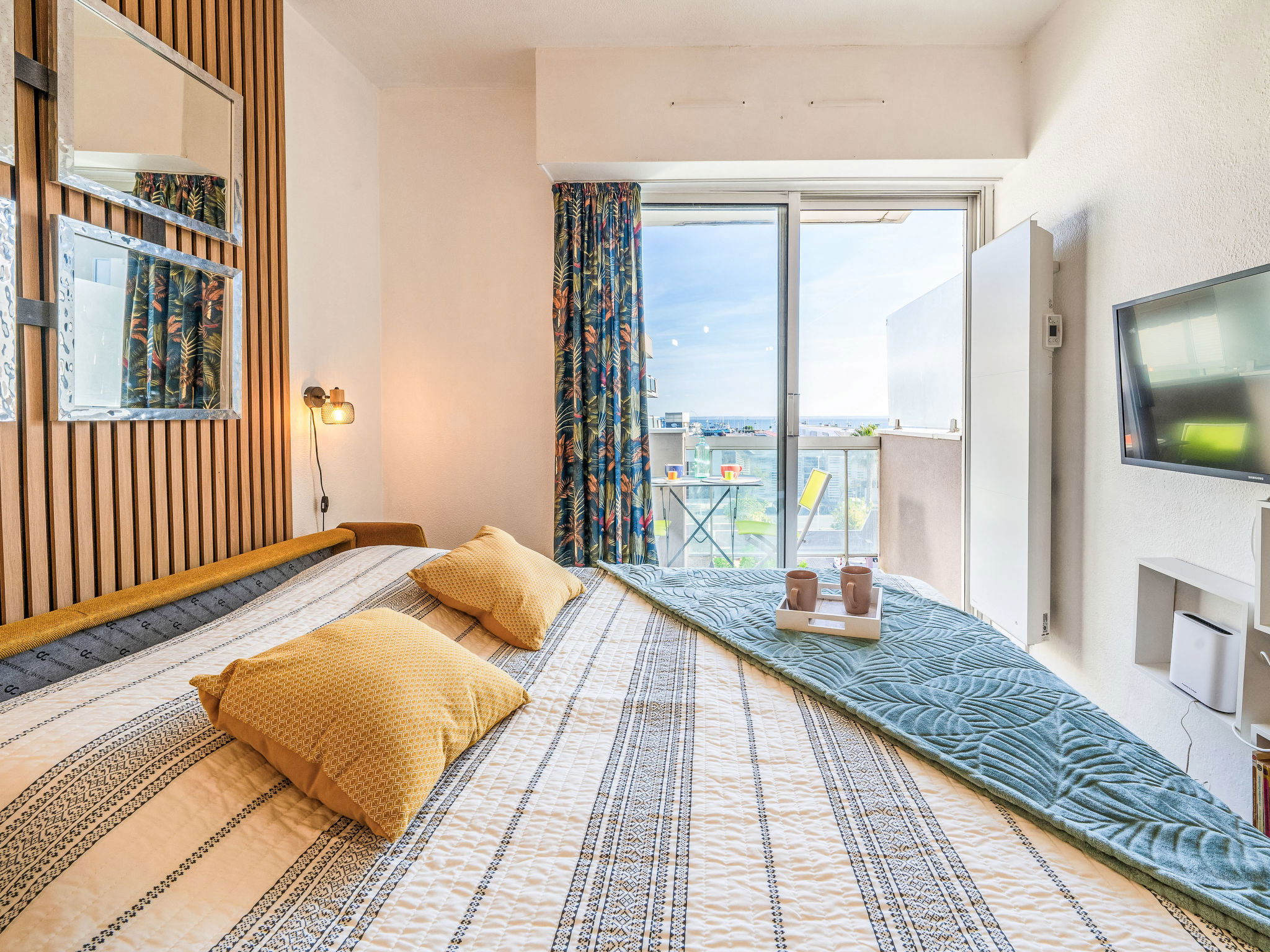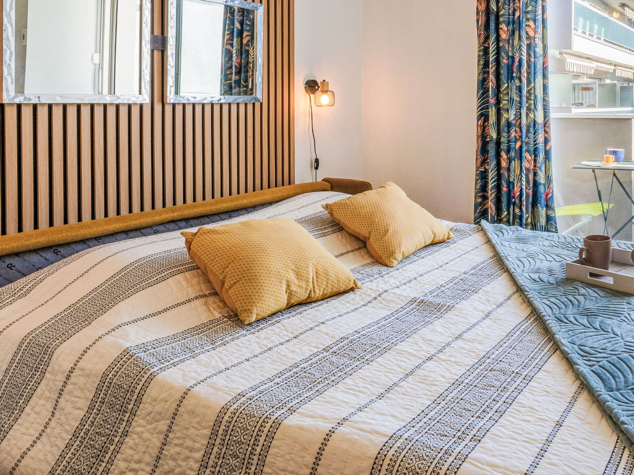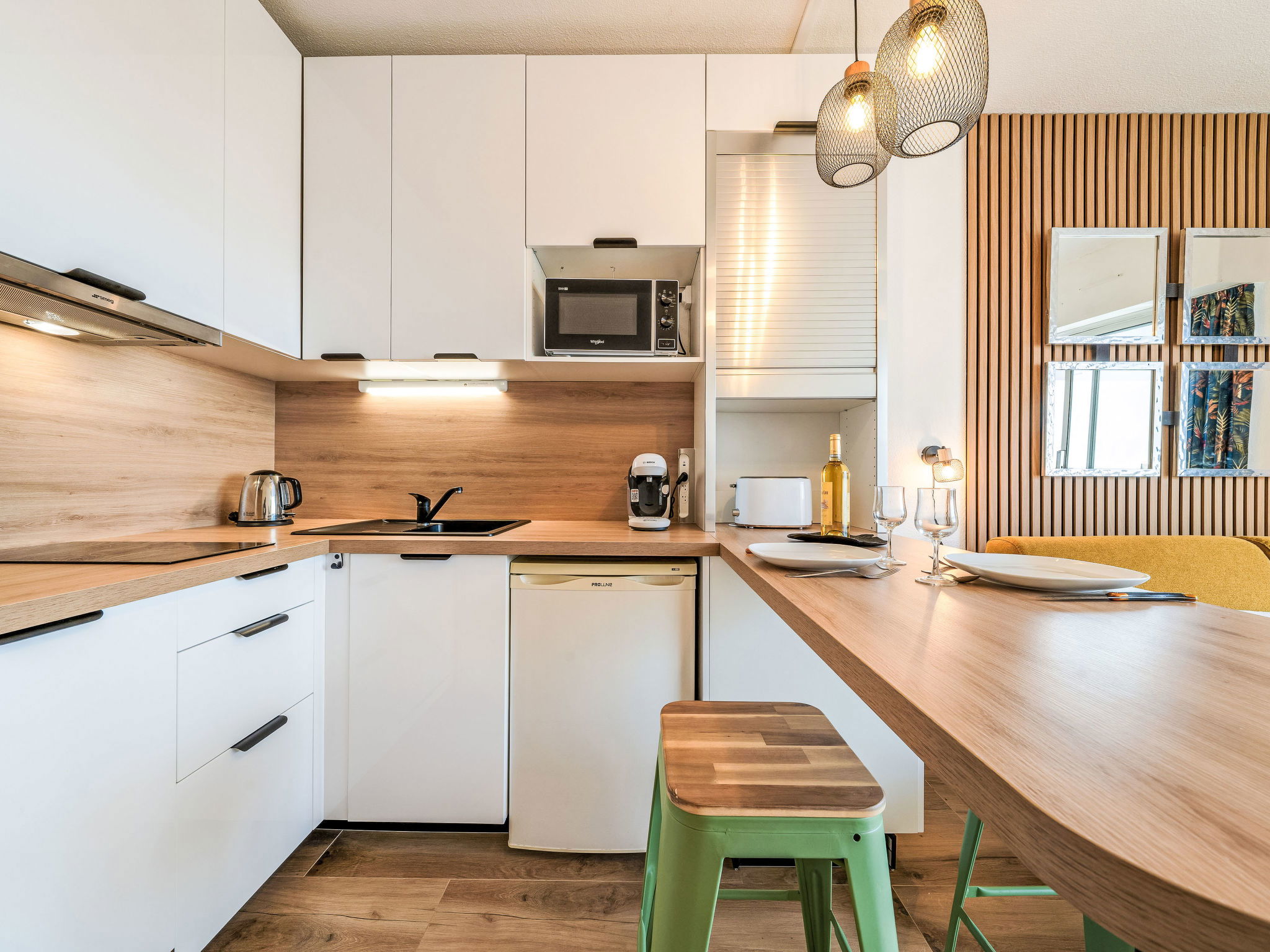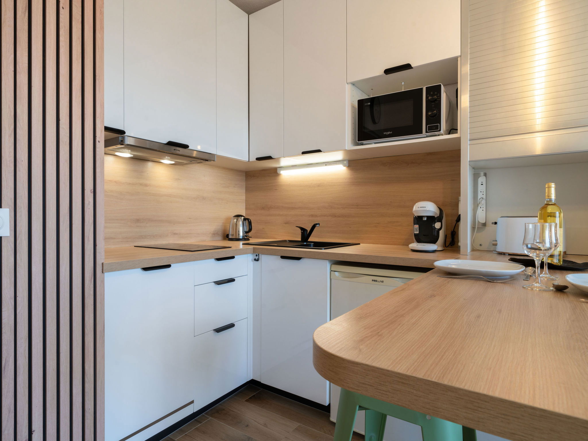 1-room studio 20 m2 on 4th floor. Renovated in 2025, beautiful and tasteful furnishings: living/dining room with 1 double sofabed (1 x 140 cm, length 190 cm), TV (flat screen). Exit to the balcony. Open kitchen (dishwasher, 2 induction hot plates, toaster, kettle, electric coffee machine, Capsules for coffee machine (Tassimo) extra, combination microwave). Shower/WC. Electric heating. Balcony 5 m2, north facing position. Balcony furniture. Partial view of the sea. Facilities: hair dryer. Internet (WiFi, free). Parking space n 368 (fenced 1 car). Please note: smoke alarm. Offer by a private individual according to Art. 155, IV of CGI. 33009003339EA