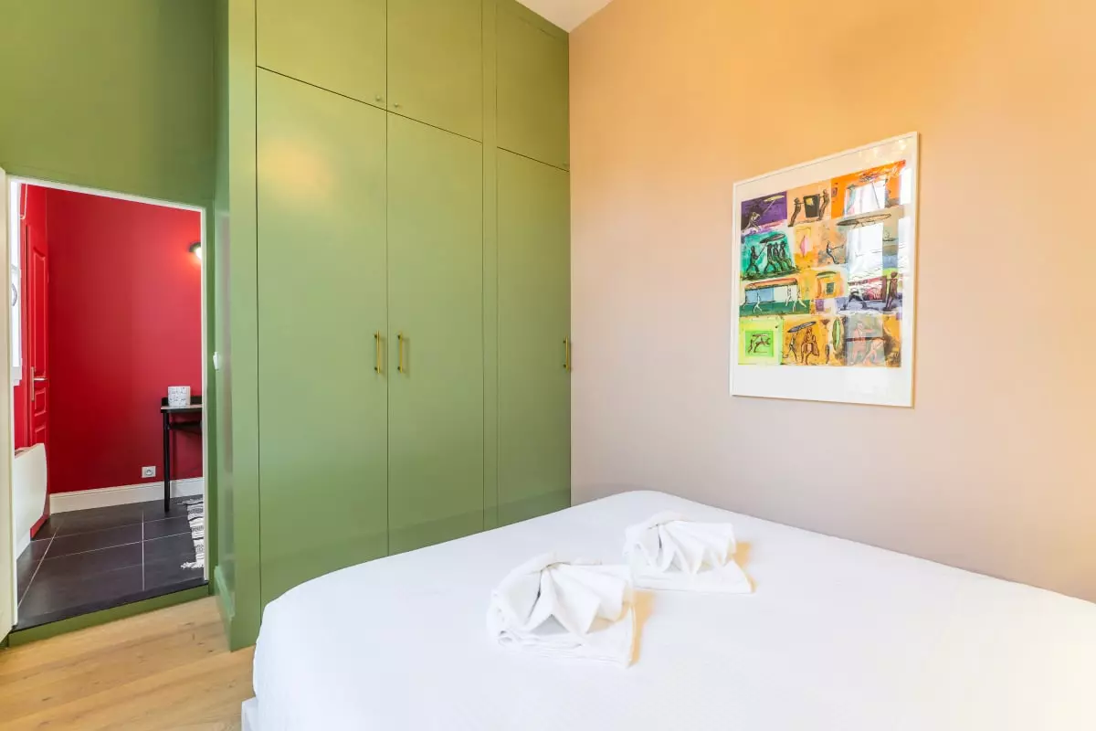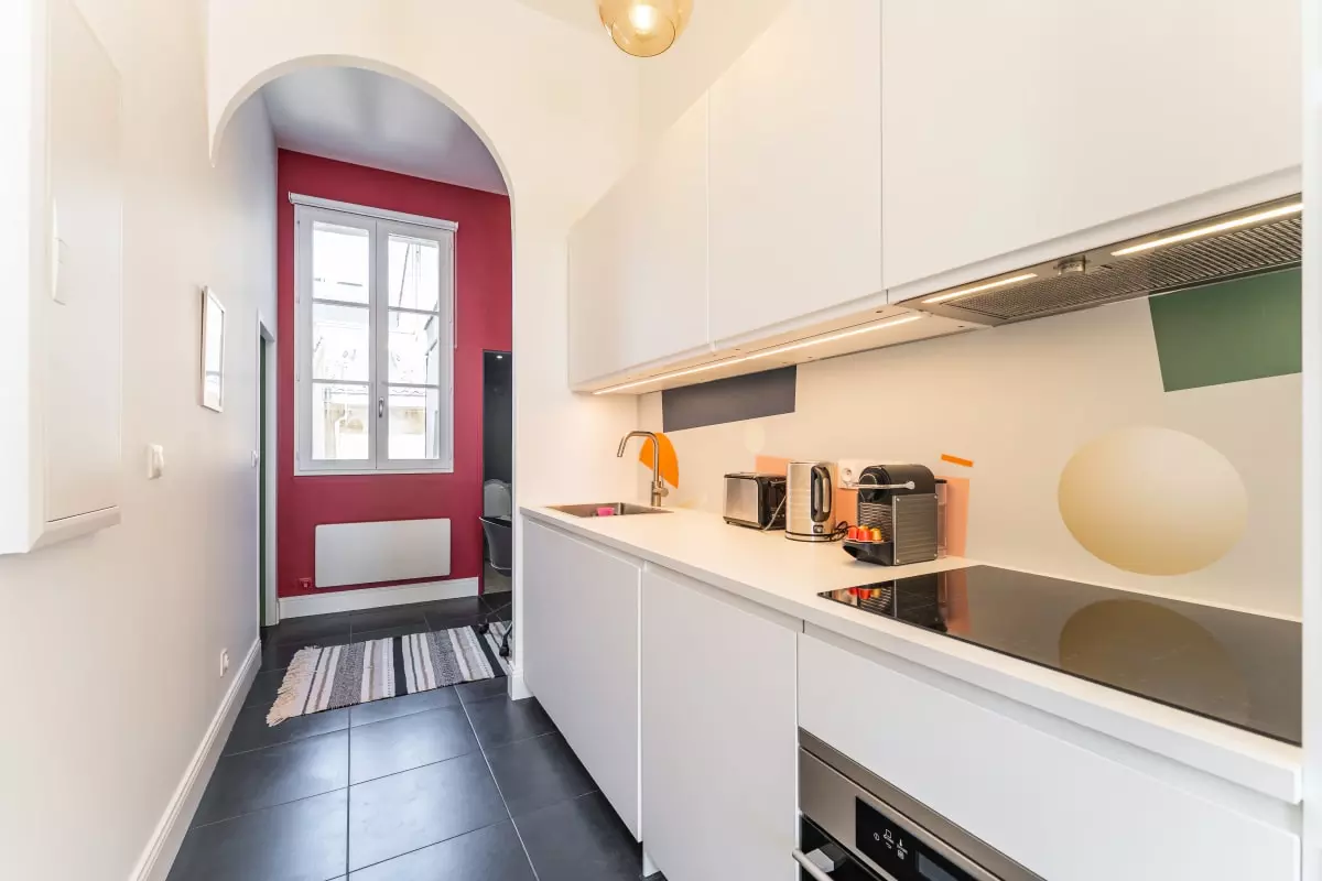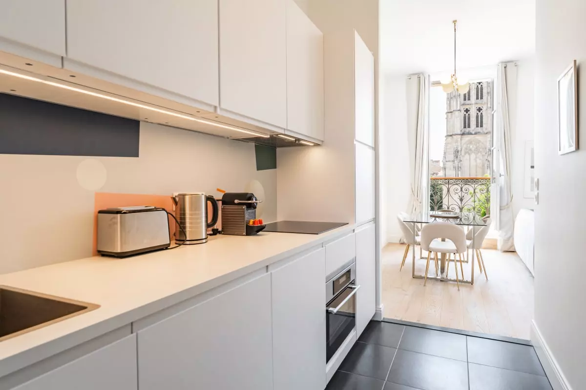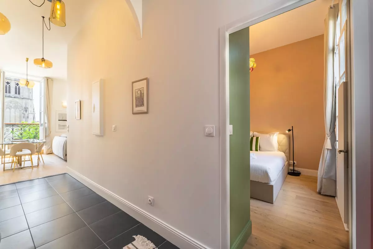 Located on Place Pey Berland, in the heart of Bordeaux, this apartment boasts an exceptional location with a balcony offering breathtaking views of the cathedral. It features a bedroom with an en-suite bathroom, a bright living room with a sofa bed and TV, and a fully equipped kitchen. You'll also appreciate the comfort of air conditioning and the convenience of a parking space.