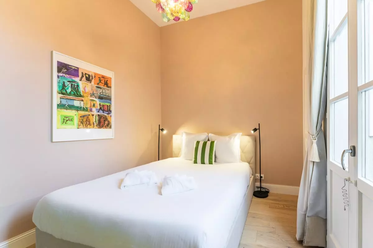 The living room combines old-world charm with modern comfort, featuring tasteful decor, a comfortable sofa bed, and a private balcony overlooking the square. You'll also enjoy air conditioning for optimal comfort throughout the year.