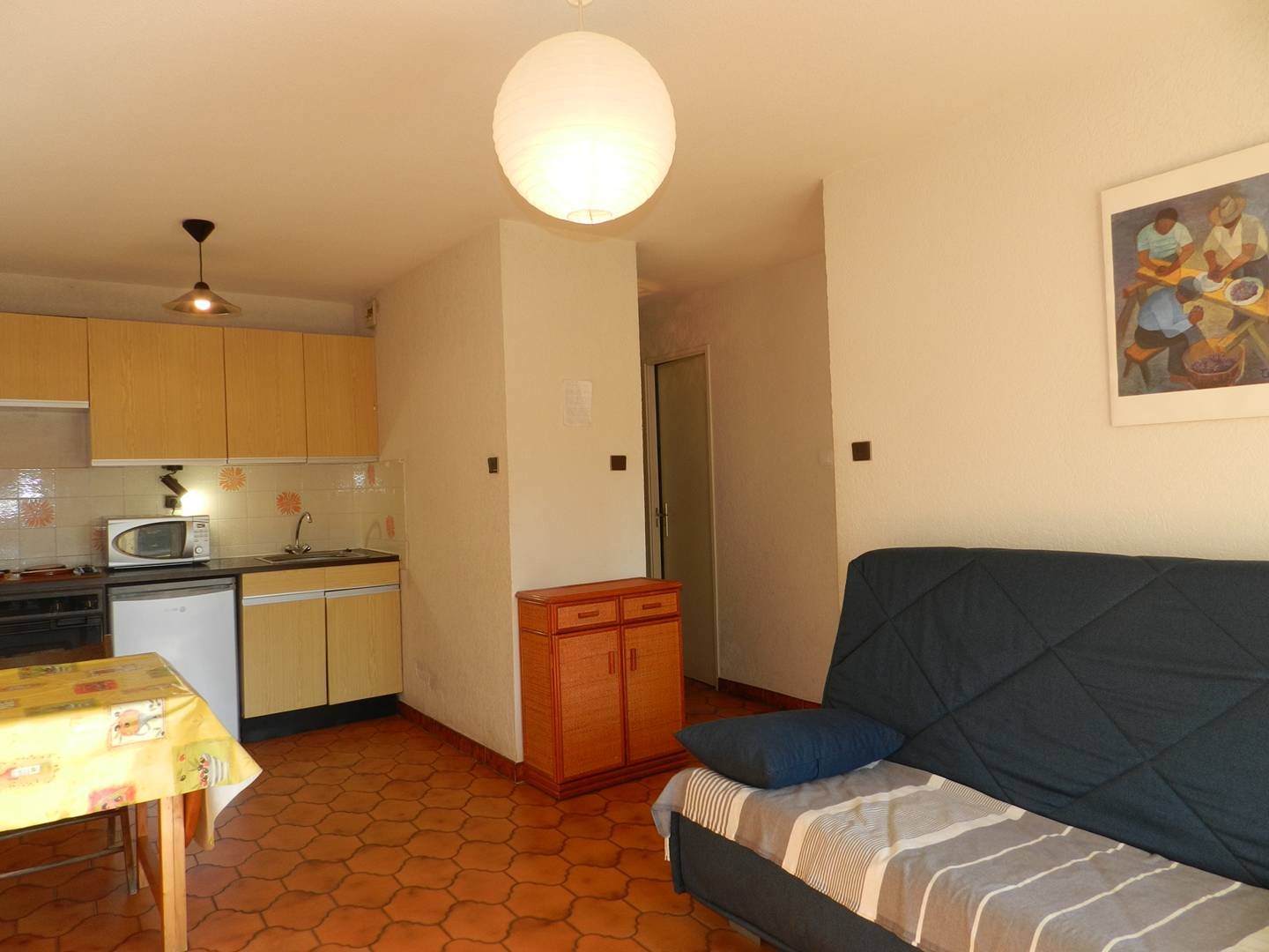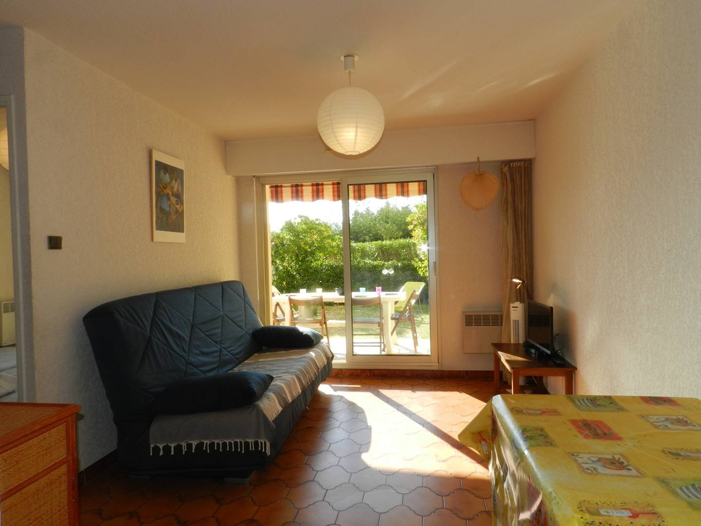 This ground floor holiday rental offers a large, welcoming terrace with a small garden, a living room with a sofa bed, a bedroom with two single beds, a fully equipped kitchen area opening onto the living room, a bathroom and a separate toilet.