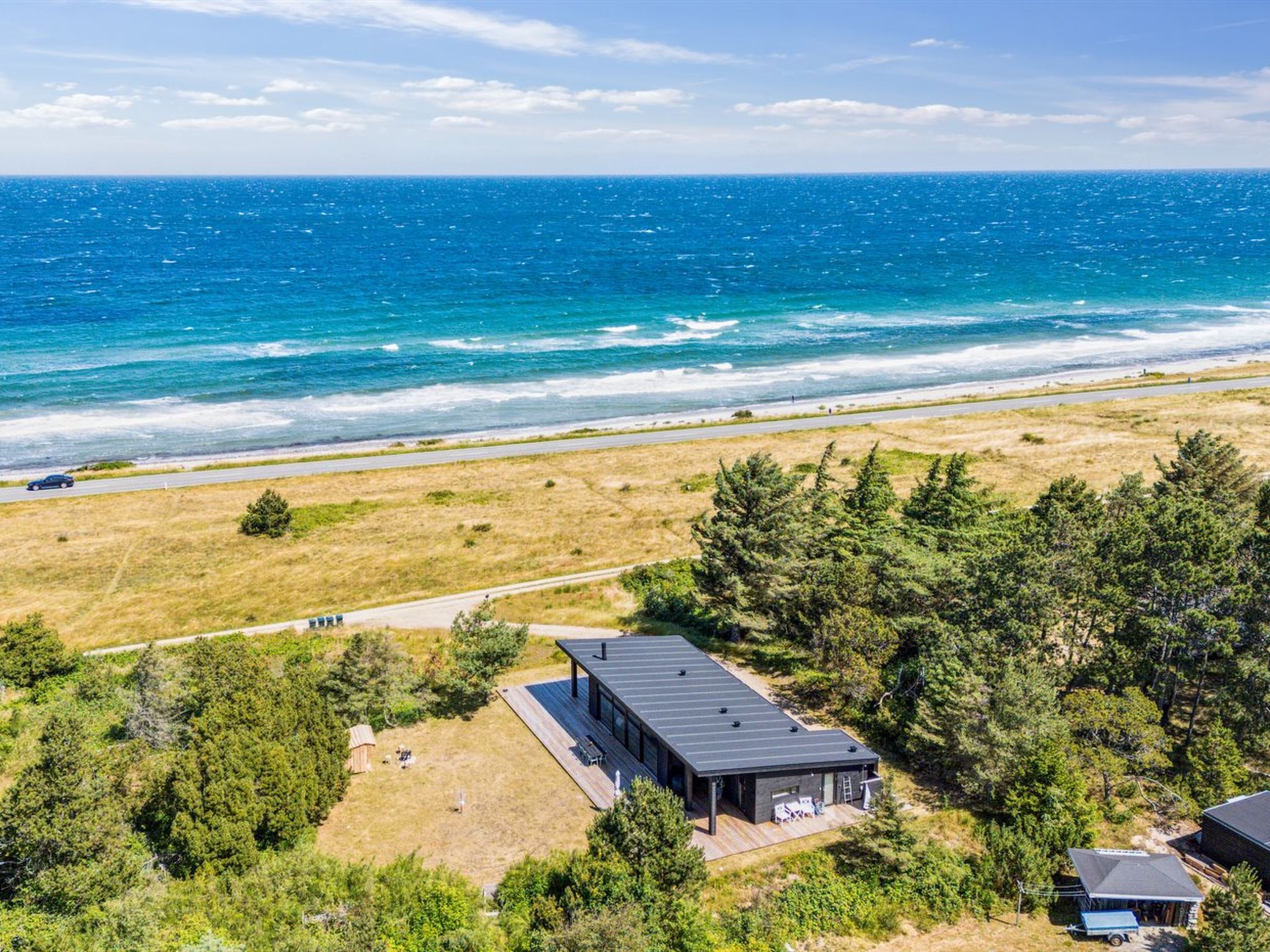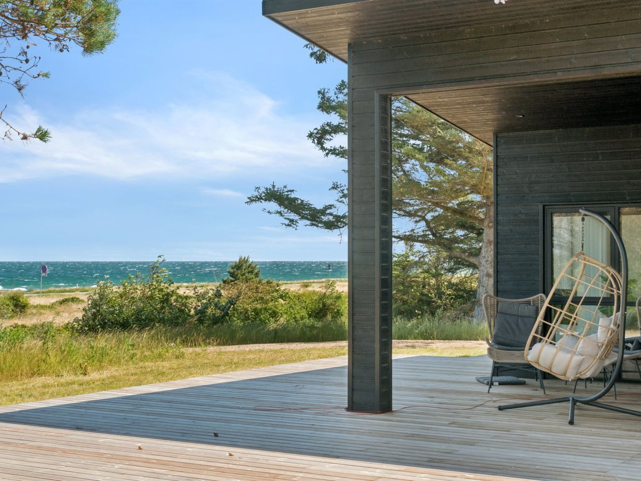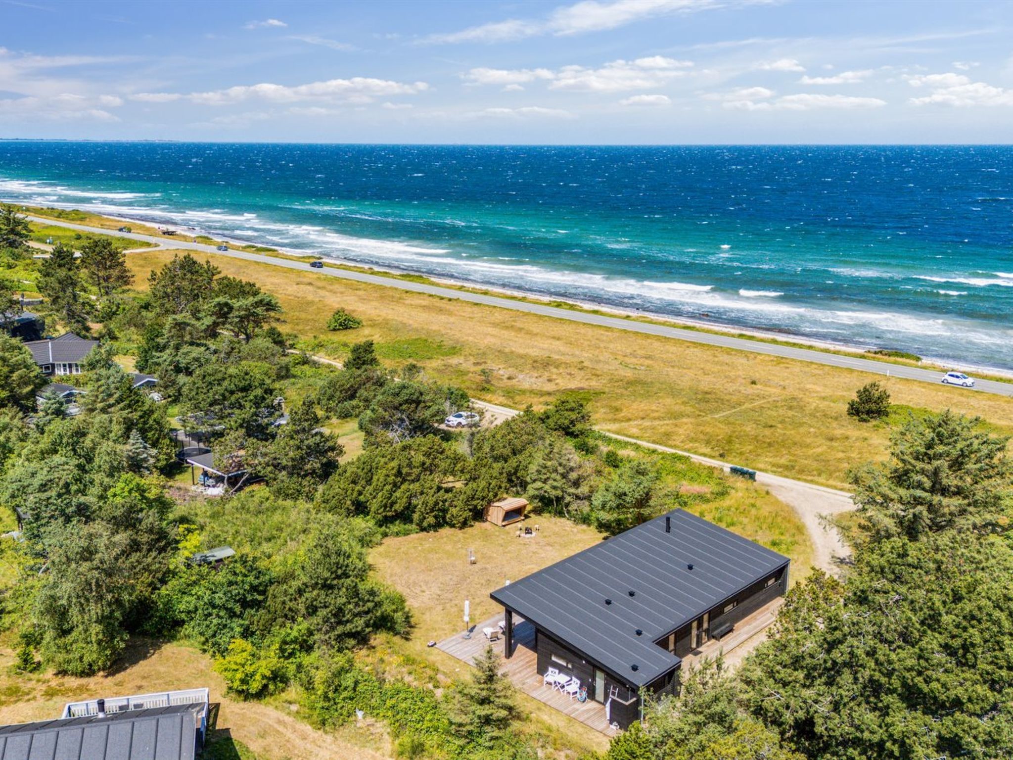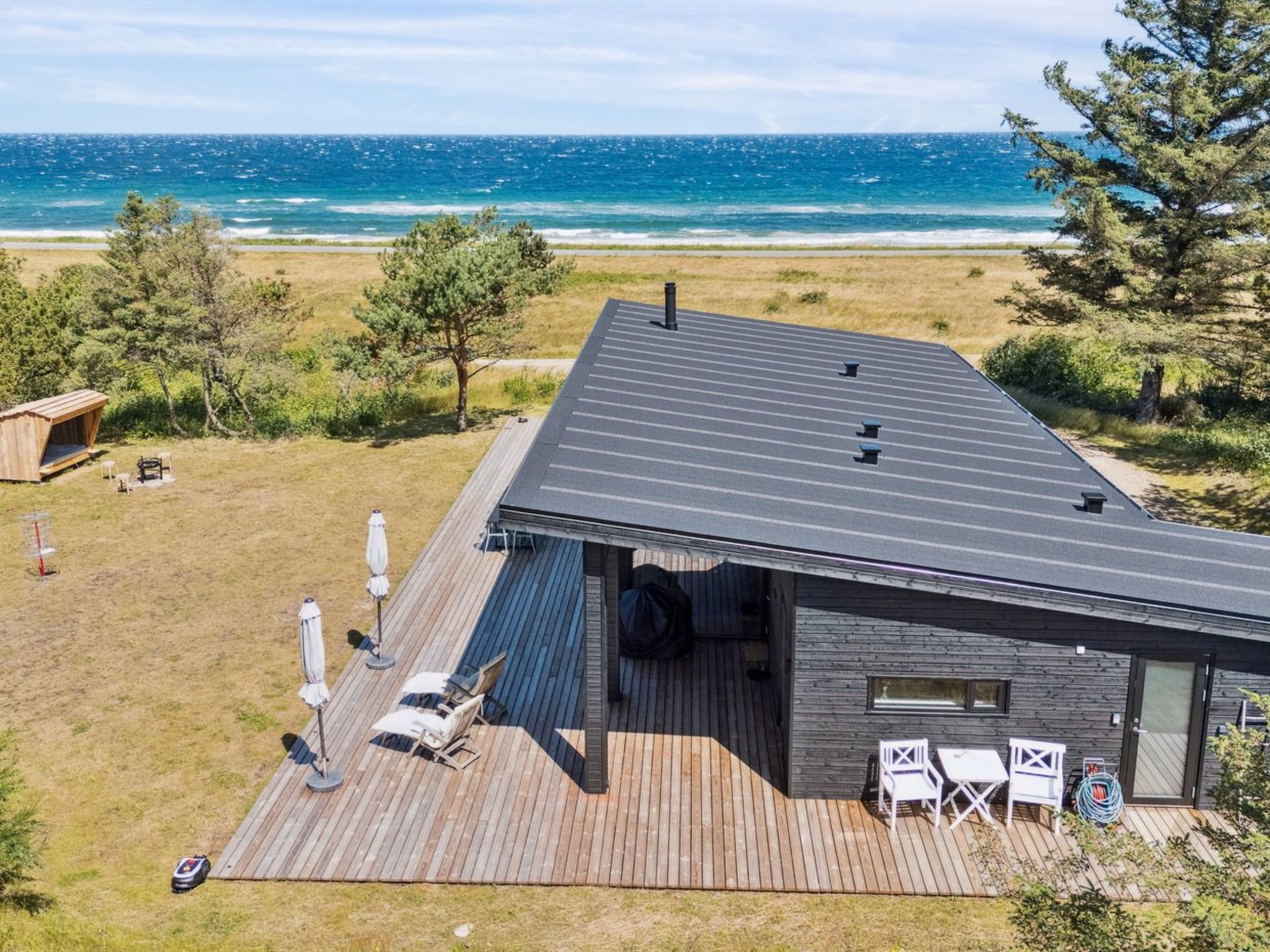 Single-family house, built in 2024. 75 m from the sea. Private: natural state property 2'453 m2. Outdoor shower, terrace (145 m2), barbecue. In the house: sauna, washing machine, tumble dryer. Parking at the house. Grocery 4.6 km. Golf course 9.5 km. The owner does not accept any youth groups.