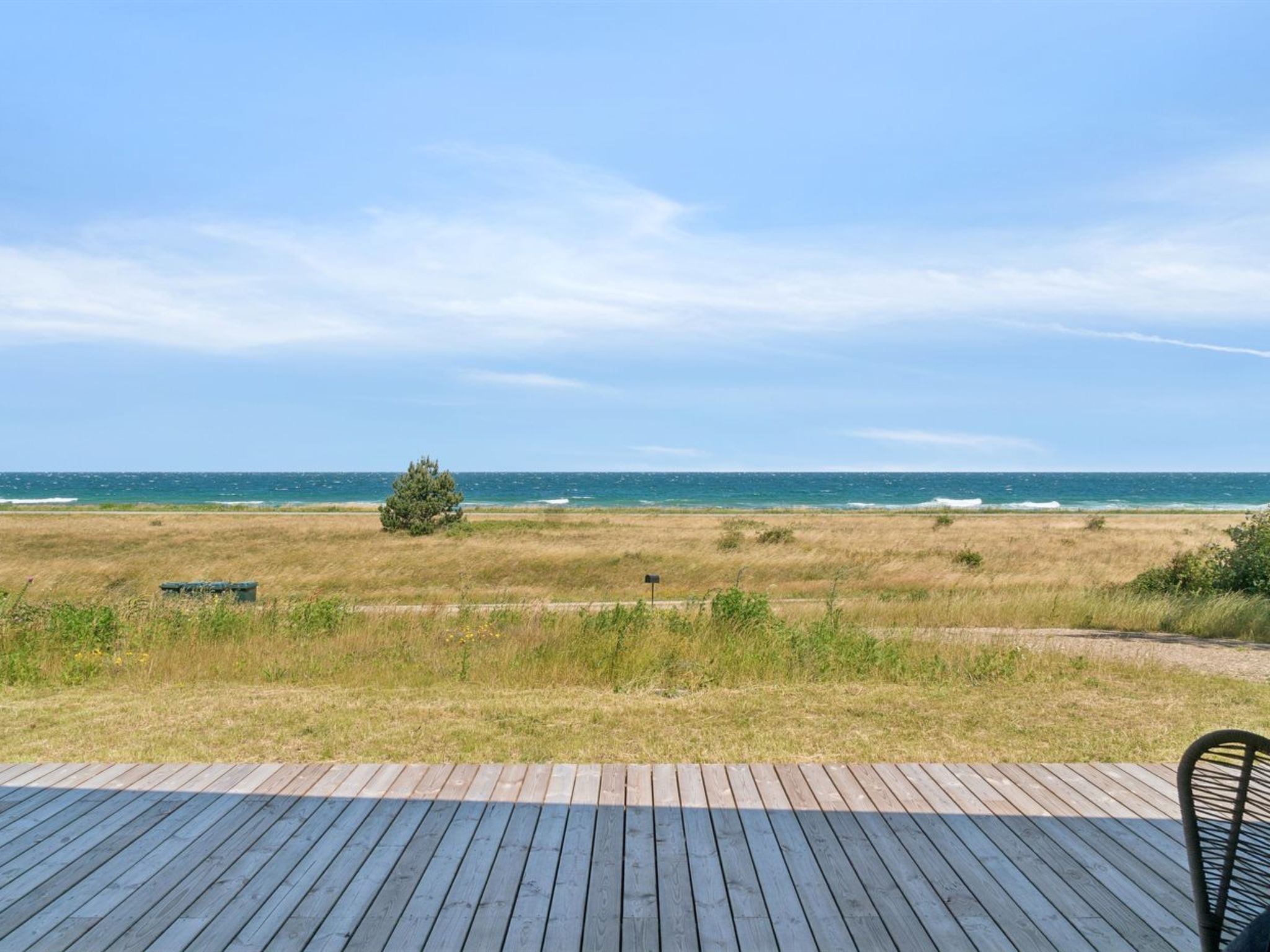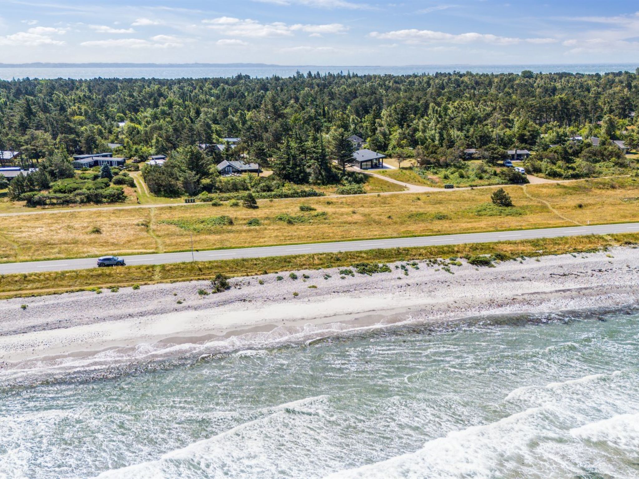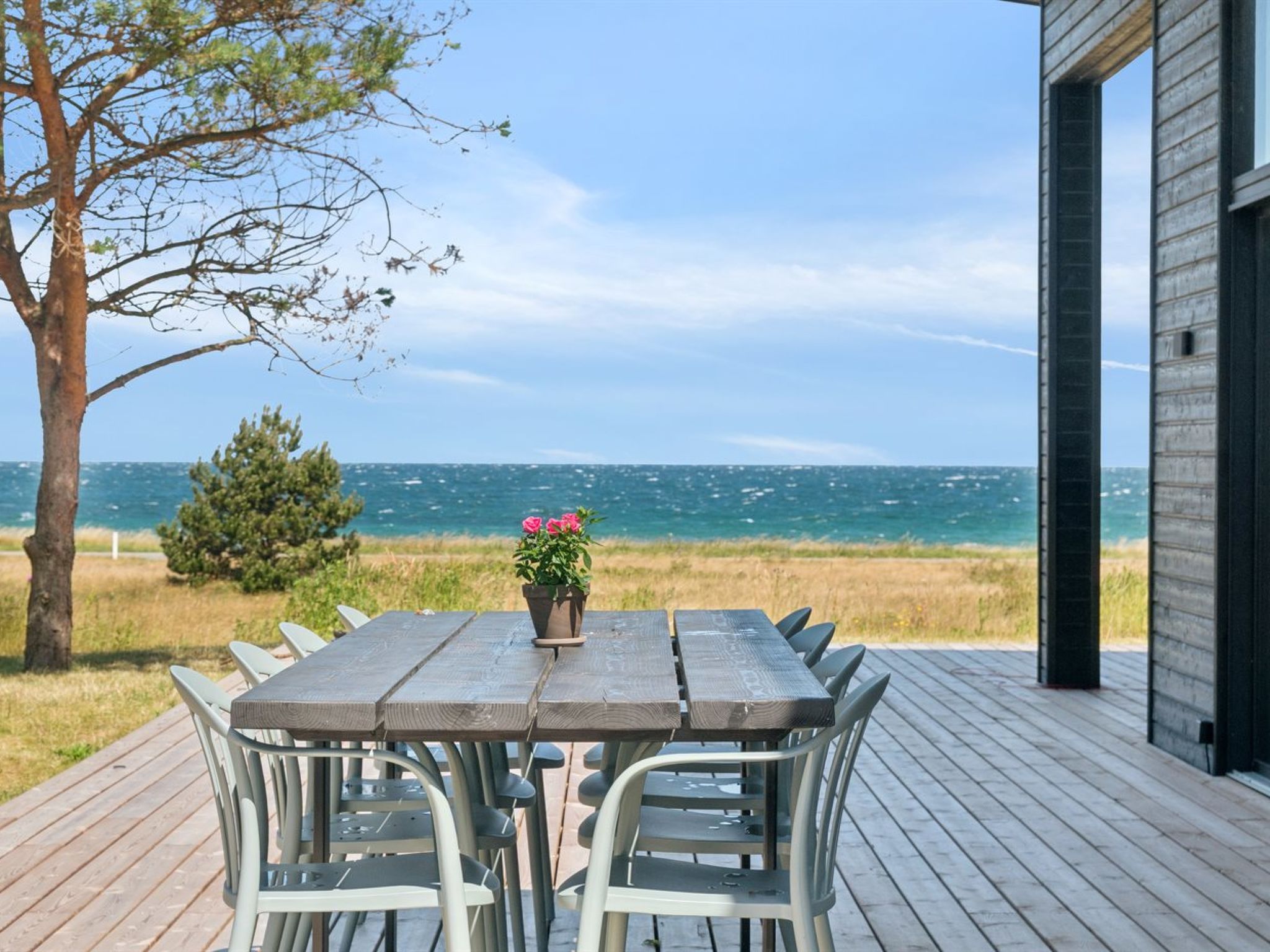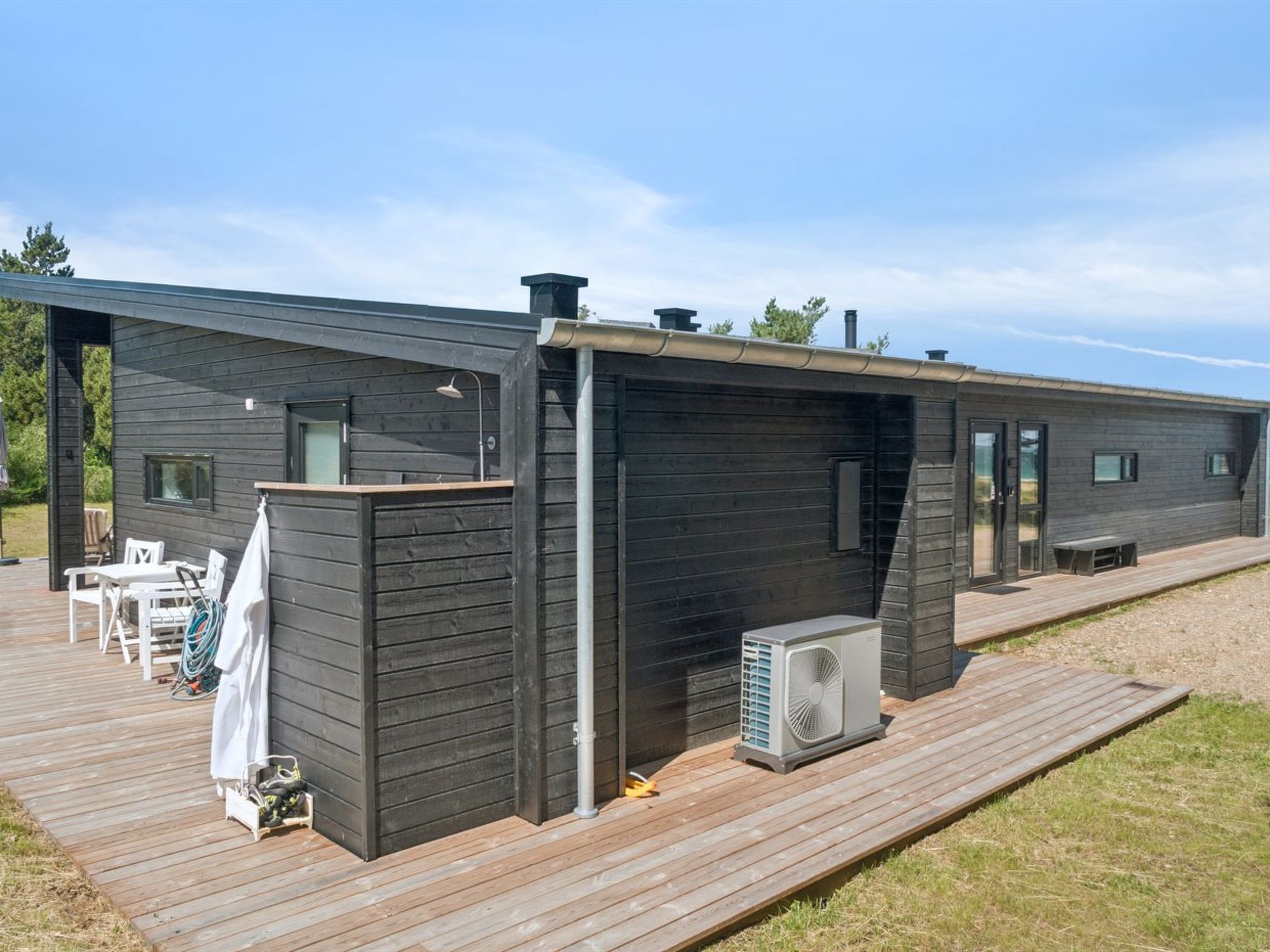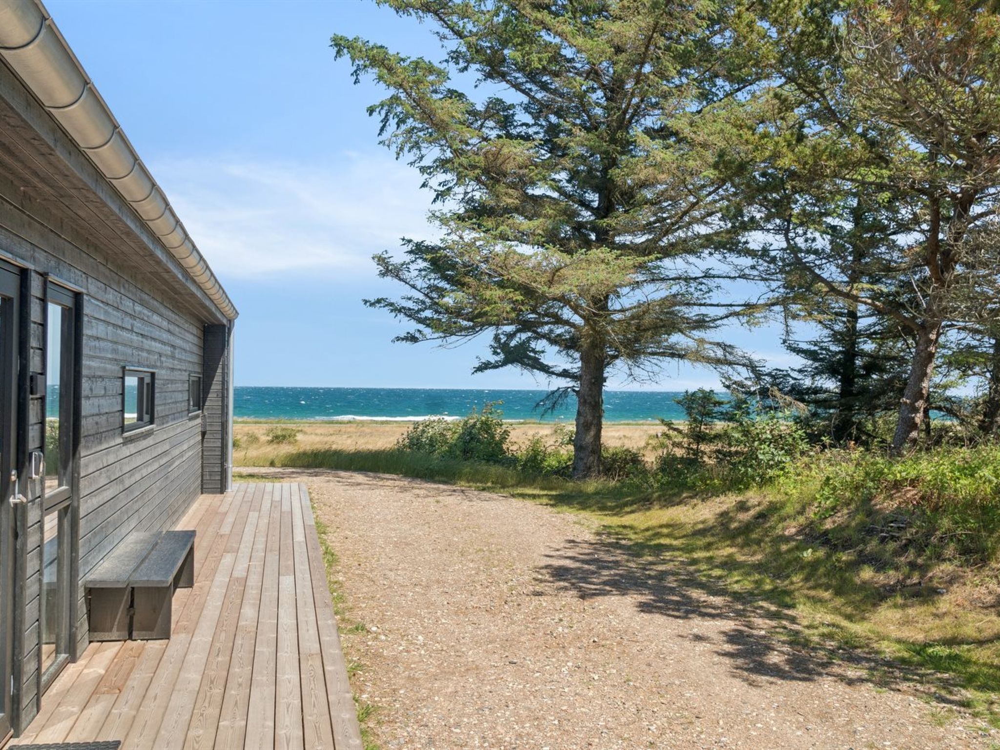 Single-family house, built in 2024. 75 m from the sea. Private: natural state property 2'453 m2. Outdoor shower, terrace (145 m2), barbecue. In the house: sauna, washing machine, tumble dryer. Parking at the house. Grocery 4.6 km. Golf course 9.5 km. The owner does not accept any youth groups.