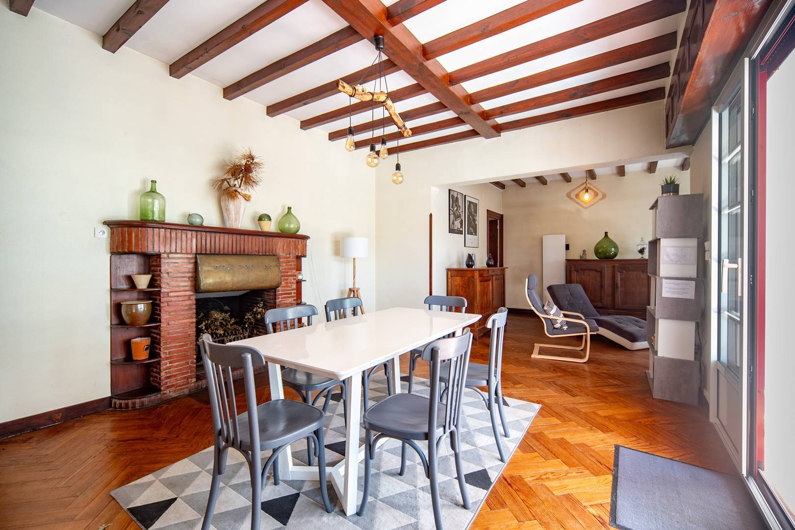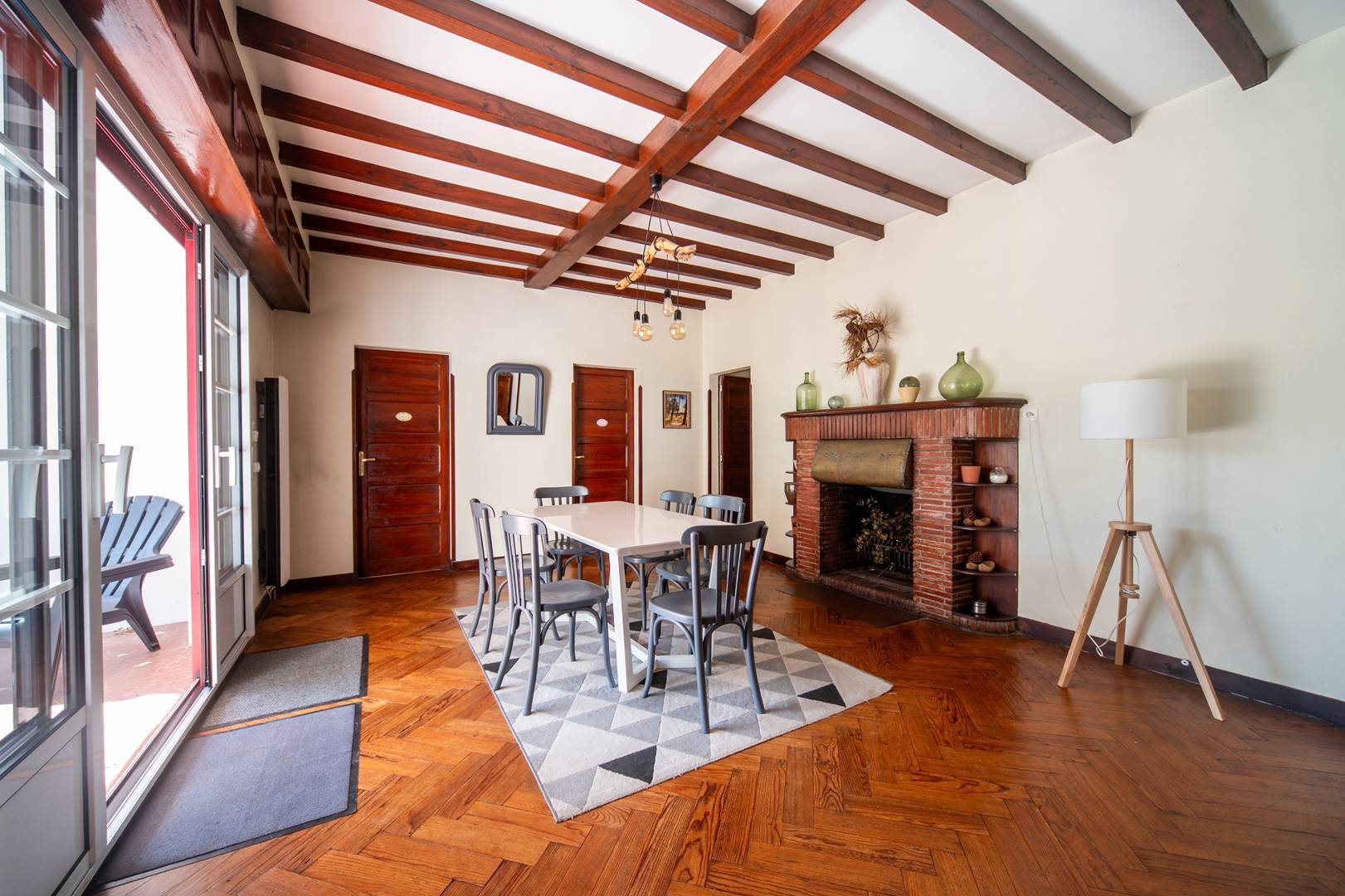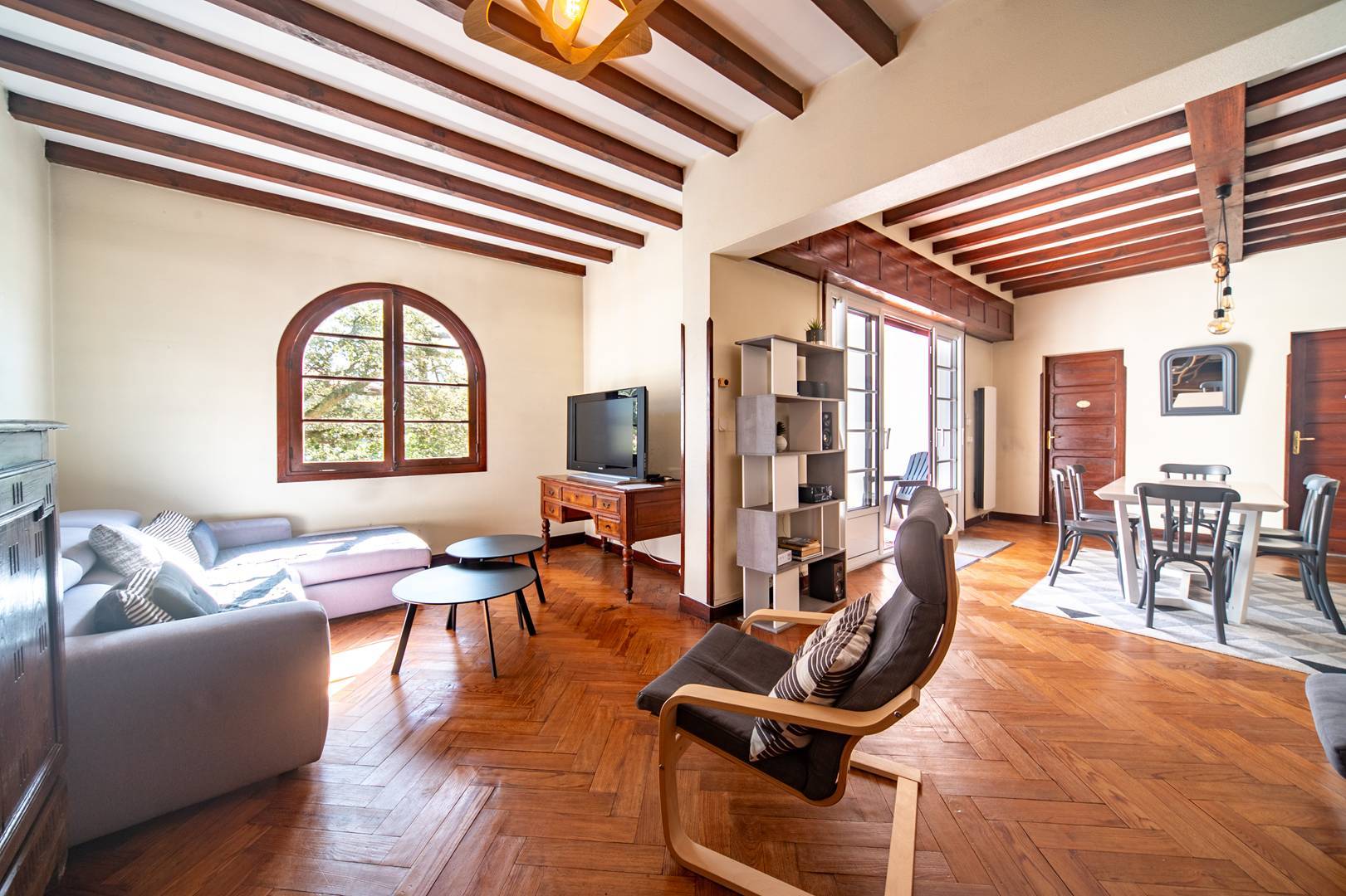 L-shaped main living room/lounge (3.99x4.62 and 5.24x3.45) opening onto a front terrace of approximately 9.50m2. Fitted and equipped kitchen (6.40m2): 3 gas hob, fridge-freezer, oven, microwave, dishwasher and washing machine. Adjoining dining room opening onto rear terrace with table, garden chairs, barbecue and deckchairs.