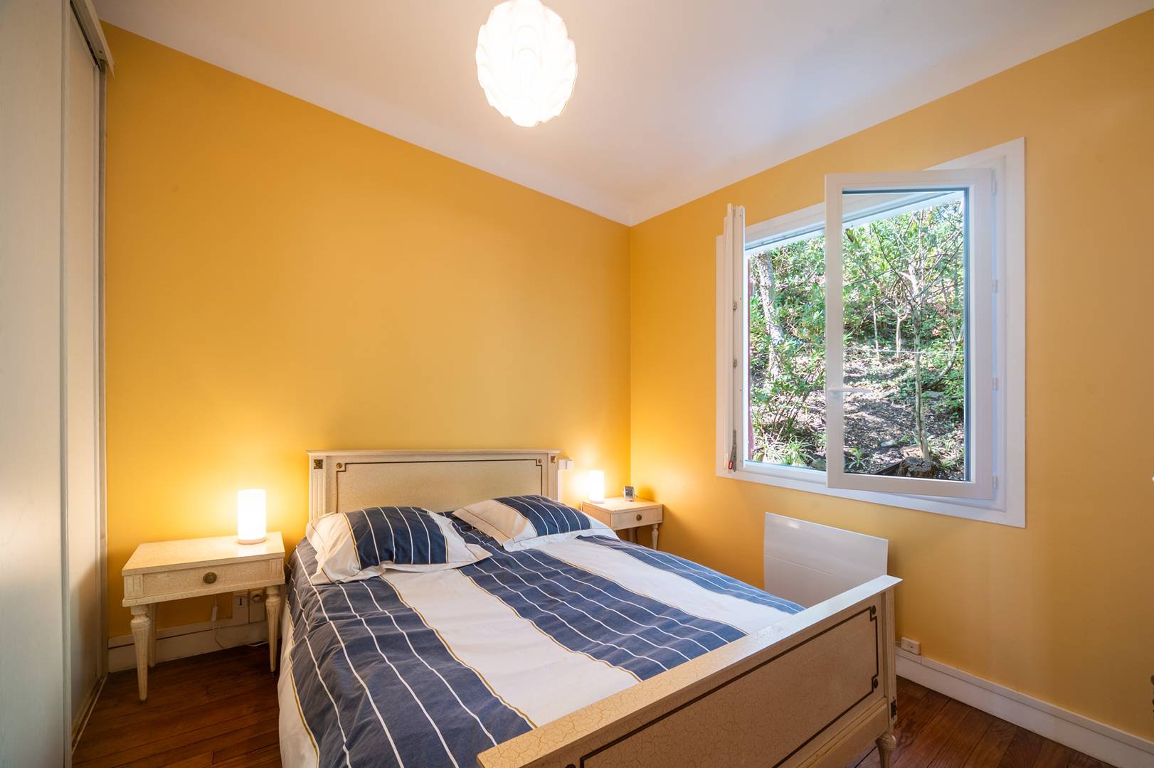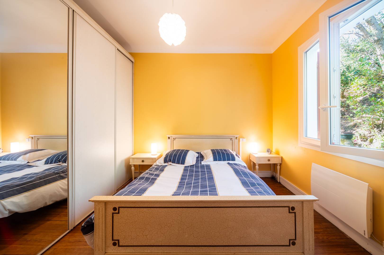 Bedroom 1 (3.68x2.99) overlooking the facade: 1 bed 140 and 1 bed 90. Shower room (2.99x1.83): shower and basin. Cupboards. Separate WC. Bedroom 2 (3.02x3.02): 1 bed 140 and cupboard. Possibility of entering a car in the garden. A large closed room on the ground floor can store bicycles, boards or golf bags.