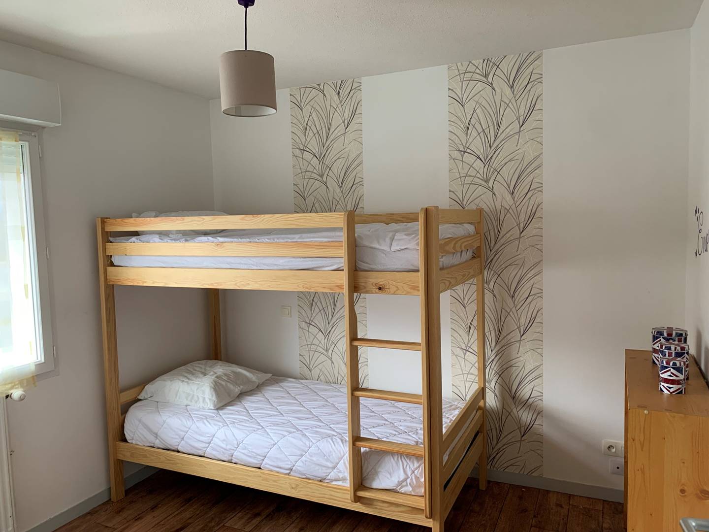 Upstairs, a landing leads to: bedroom 1 with garden view: 1 double bed (140cm), bedroom 2 with garden view: 1 double bed (160cm), bedroom 3 (for children): 1 fold-out sofa bed for 1 person and a mezzanine bed for a child only. Bathroom: bath, washbasin, WC and washing machine.