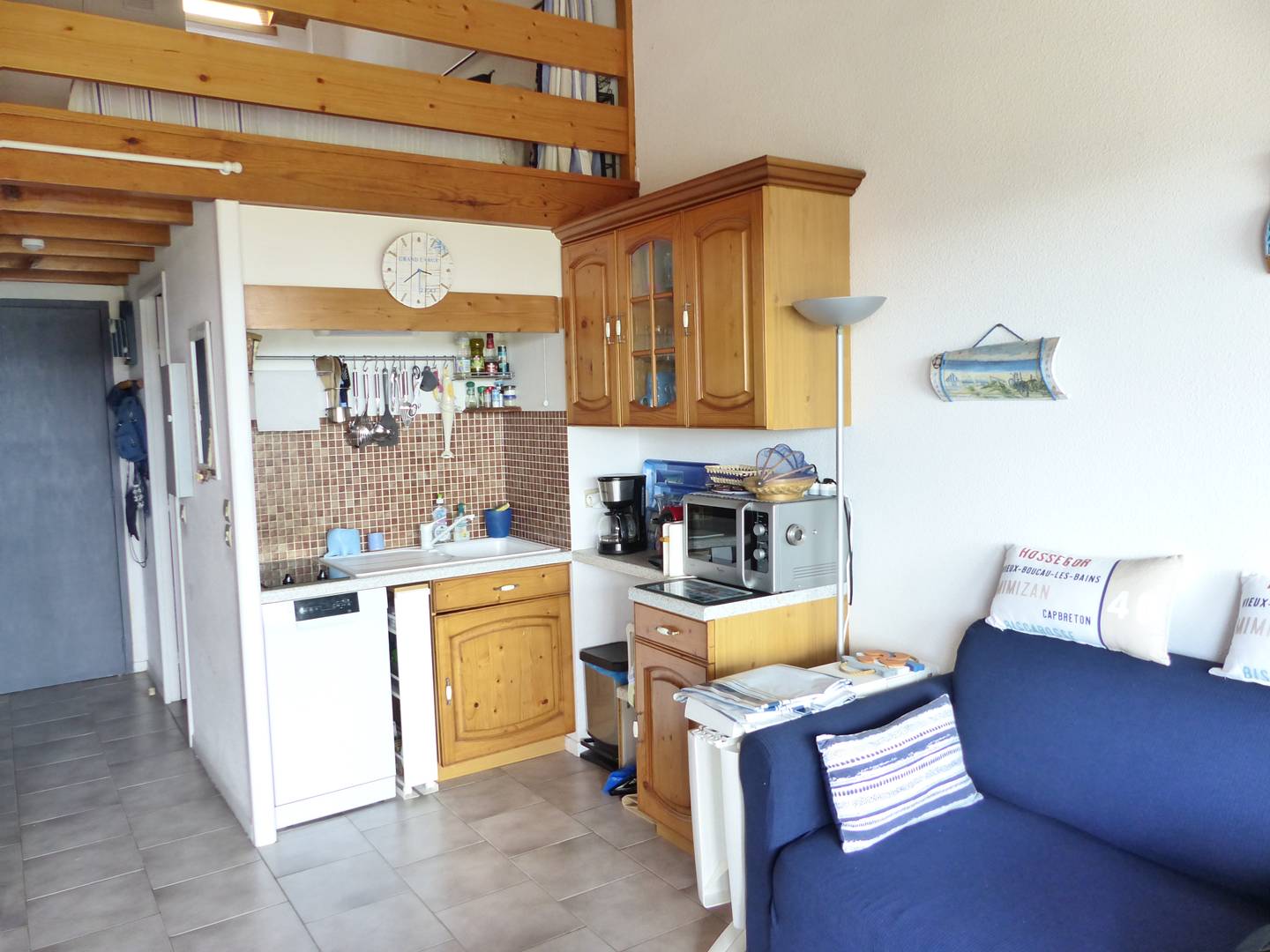 Living room with kitchen area (4.52 X 3.49) opening onto a covered terrace with a beautiful view of the ocean to the South and West: grill oven, ceramic hob with 2 burners, dishwasher and fridge-freezer.