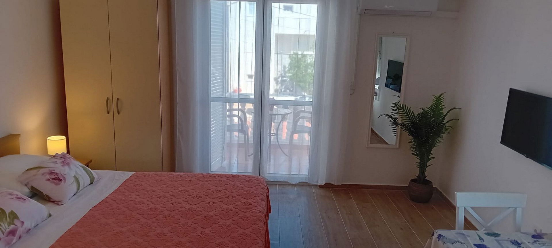 Enjoy the convenience of private outdoor parking and a delightful balcony with outdoor furniture, ideal for enjoying morning coffee or evening relaxation. The studio comes with modern amenities such as air conditioning, WiFi, a flat screen satellite TV, and practical additions like an ironing board and aid kit.