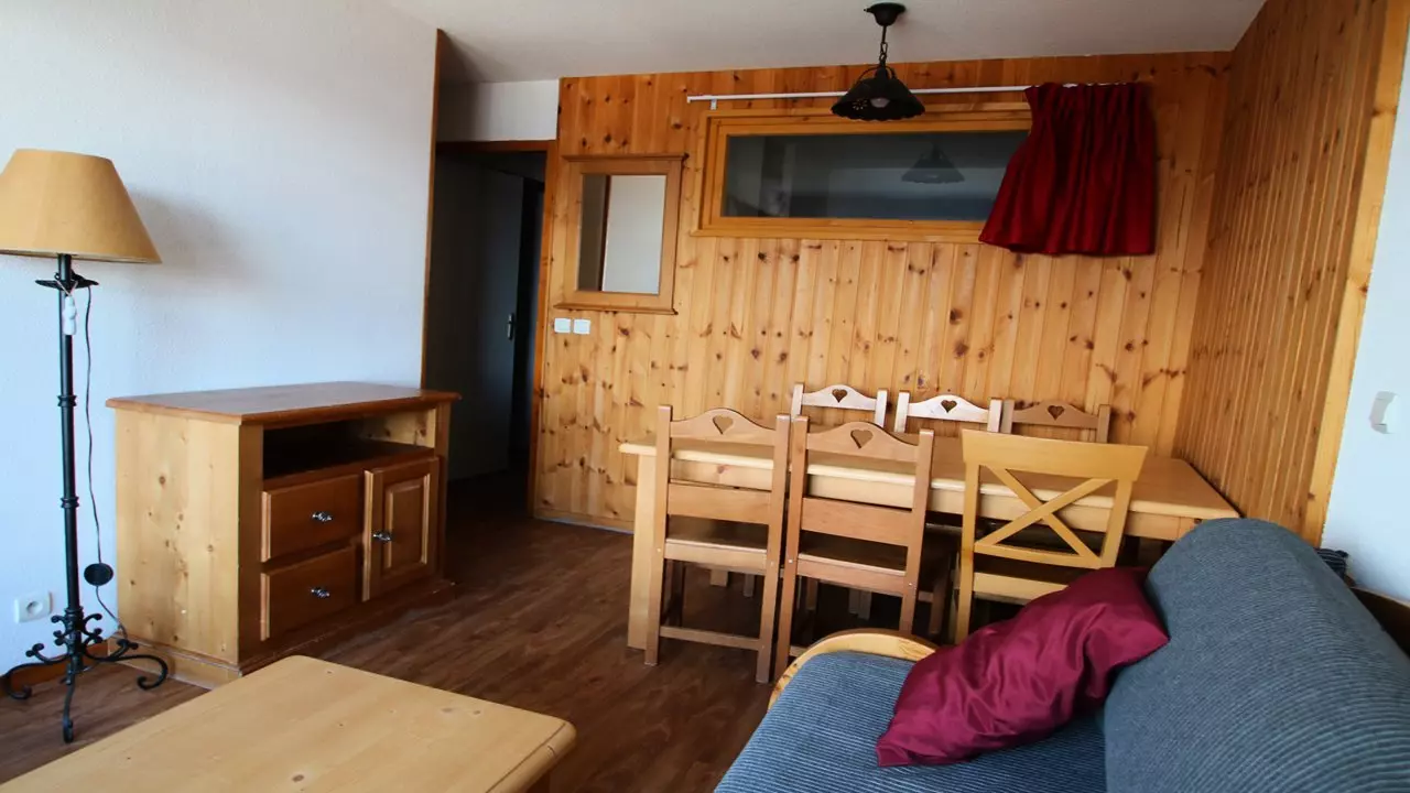 - Living room with convertible sofa bed (2/80x190 or 1/160x190), dining table, flat screen TV and balcony equipped with a table and two chairs.