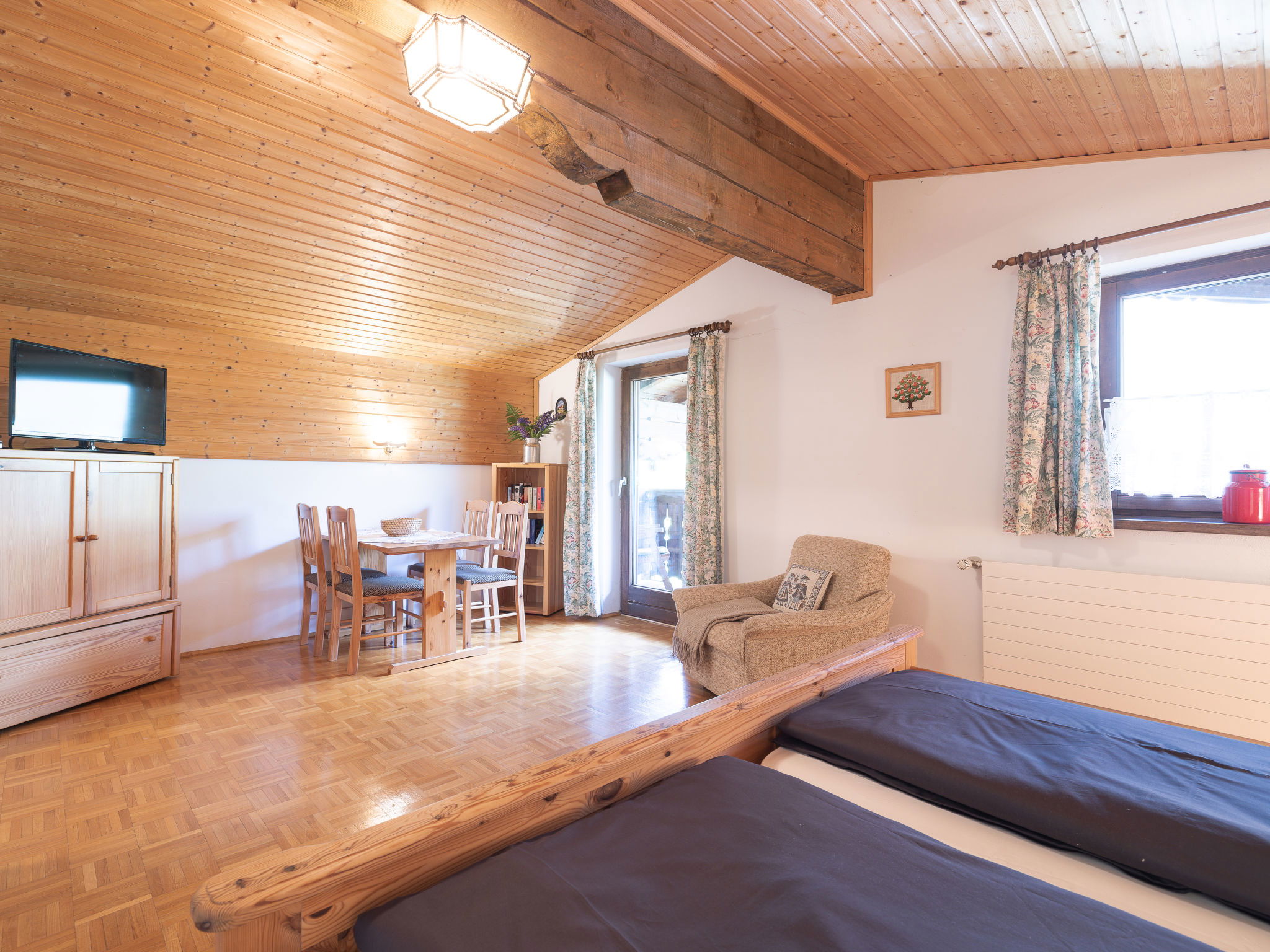 "Studio 3", 1-room studio 30 m2, on the top floor. Practical furnishings: living/sleeping room with 1 double bed, dining table, satellite TV and international TV channels (flat screen). Exit to the loggia. Small kitchenette (4 hot plates, oven, toaster, kettle, electric coffee machine). Shower/WC. Oil heating. Parquet floors. Small balcony. Balcony furniture. Very beautiful panoramic view of the mountains and the valley. Facilities: Internet (WiFi, free). Please note: non-smokers only. Maximum 2 pets/ dogs allowed.