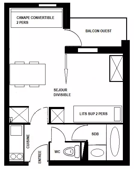 Fully renovated divisible studio with a surface area of approximately 24m², equipped for 4 people, west facing with balcony on level 0 on the entrance side and level 1 on the balcony side.