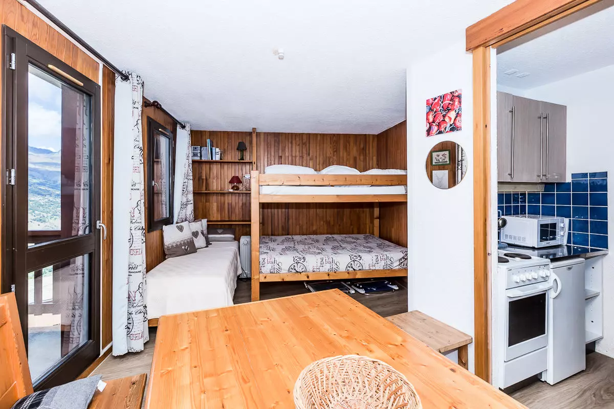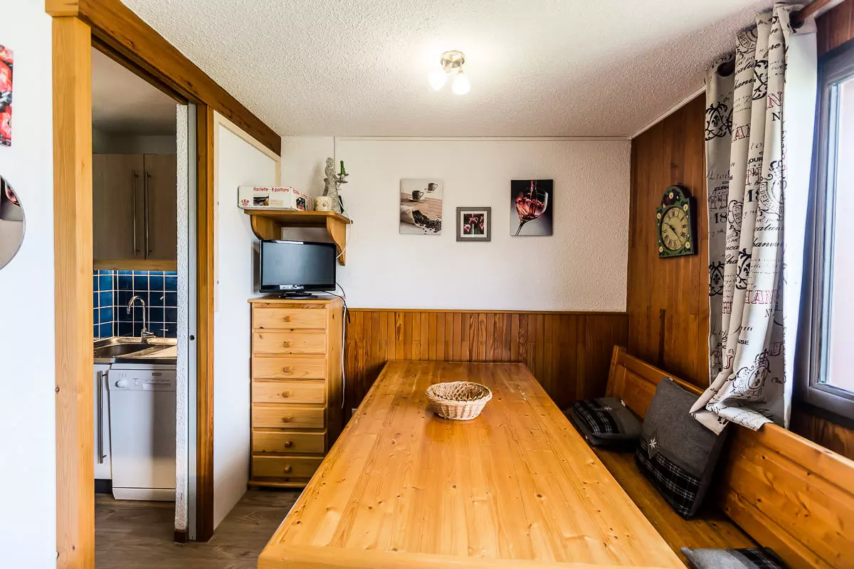 Fully renovated, south/west facing studio for 3 people, measuring approximately 22 m², with a balcony/terrace overlooking the valley and slopes on level -1. Kitchenette: electric stove, refrigerator, dishwasher, microwave, kettle, toaster, raclette grill.