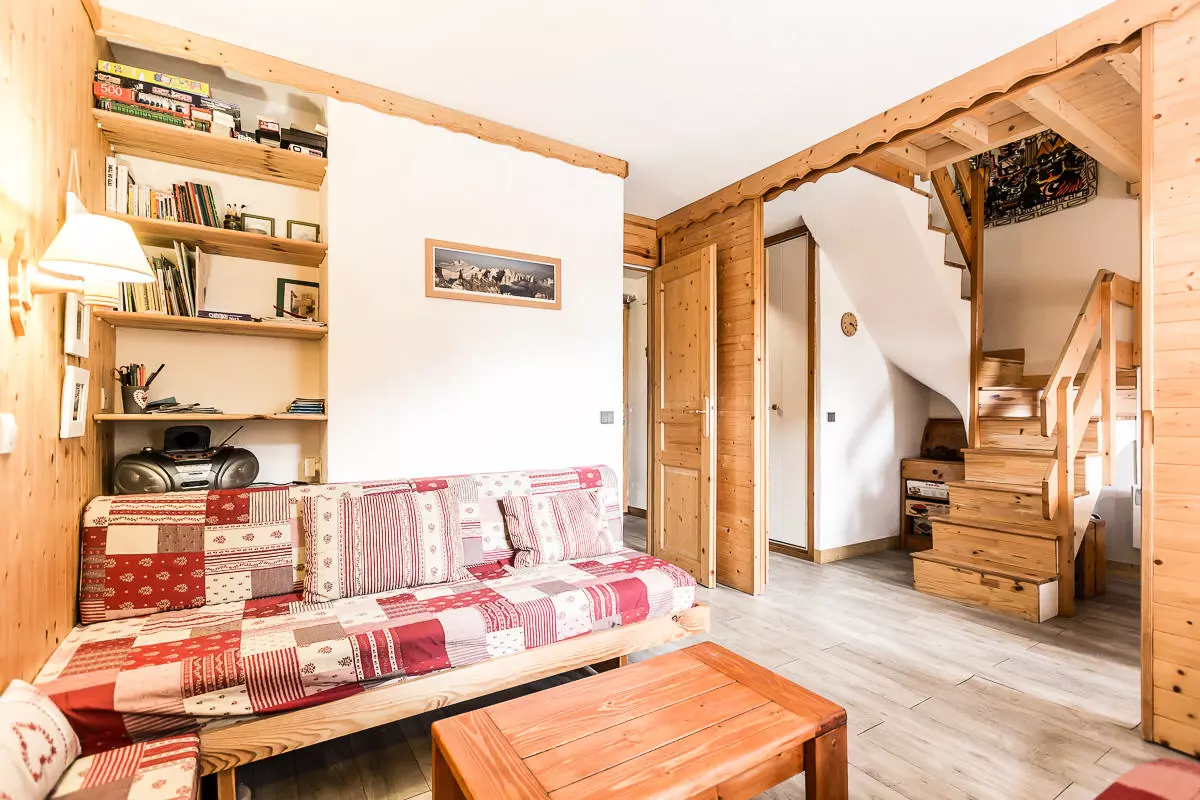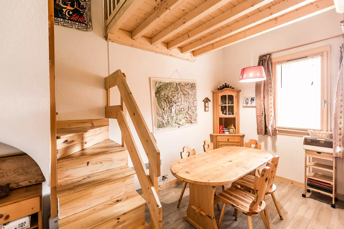 2-room apartment + mezzanine, duplex, equipped for 6 people, approximately 50m² in very good condition, west facing with balcony, mountain view, on level 2. Comprising on level 0: