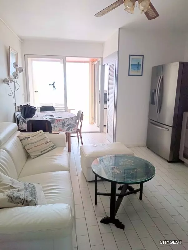 The apartment is dual-aspect, includes a bright living room with an open, fully equipped kitchen (dishwasher, induction hob, fridge-freezer, multifunction oven, microwave, etc.). All of it opens onto a large 12 m² terrace, ideal for your outdoor meals facing the sea!
