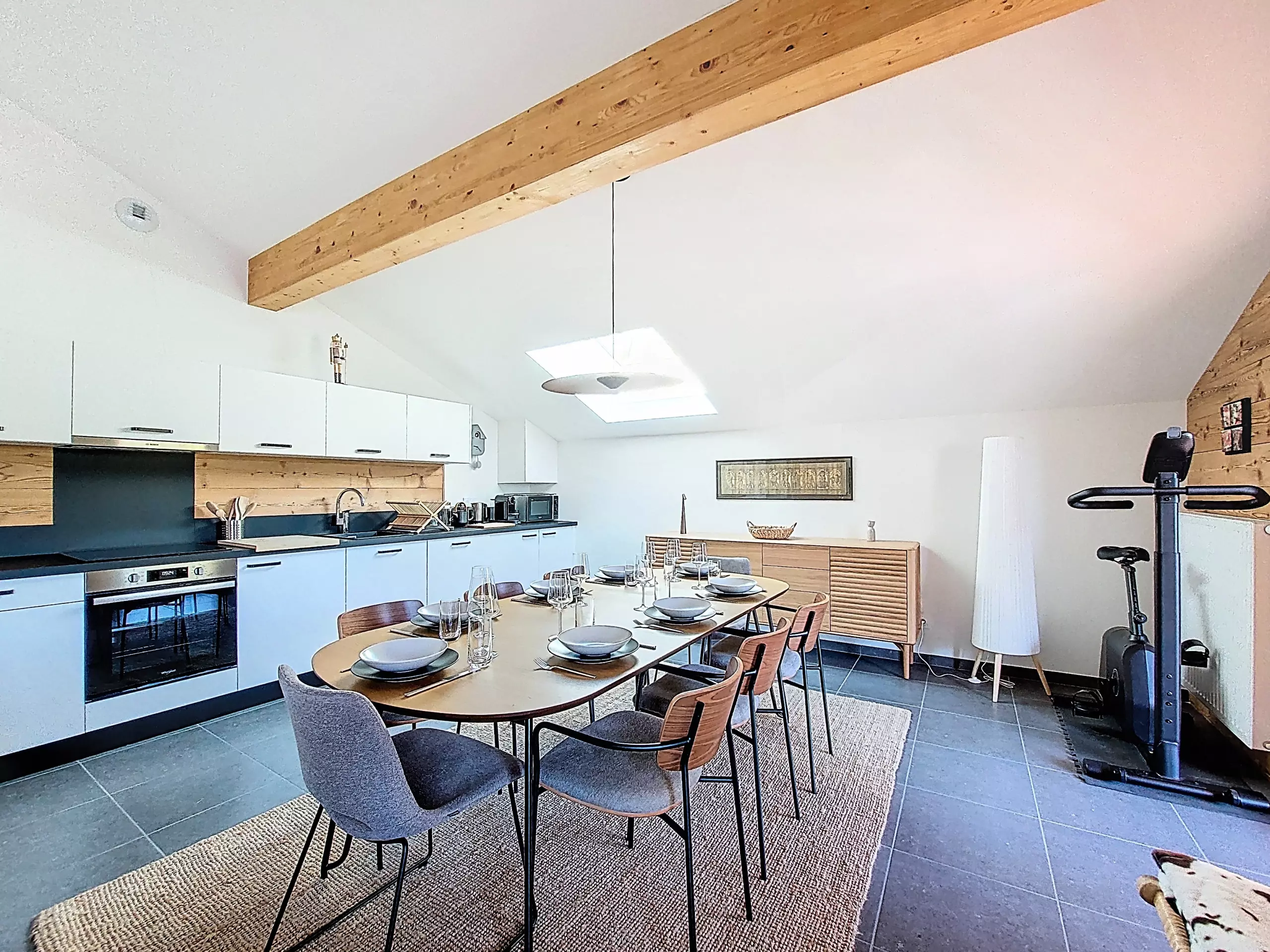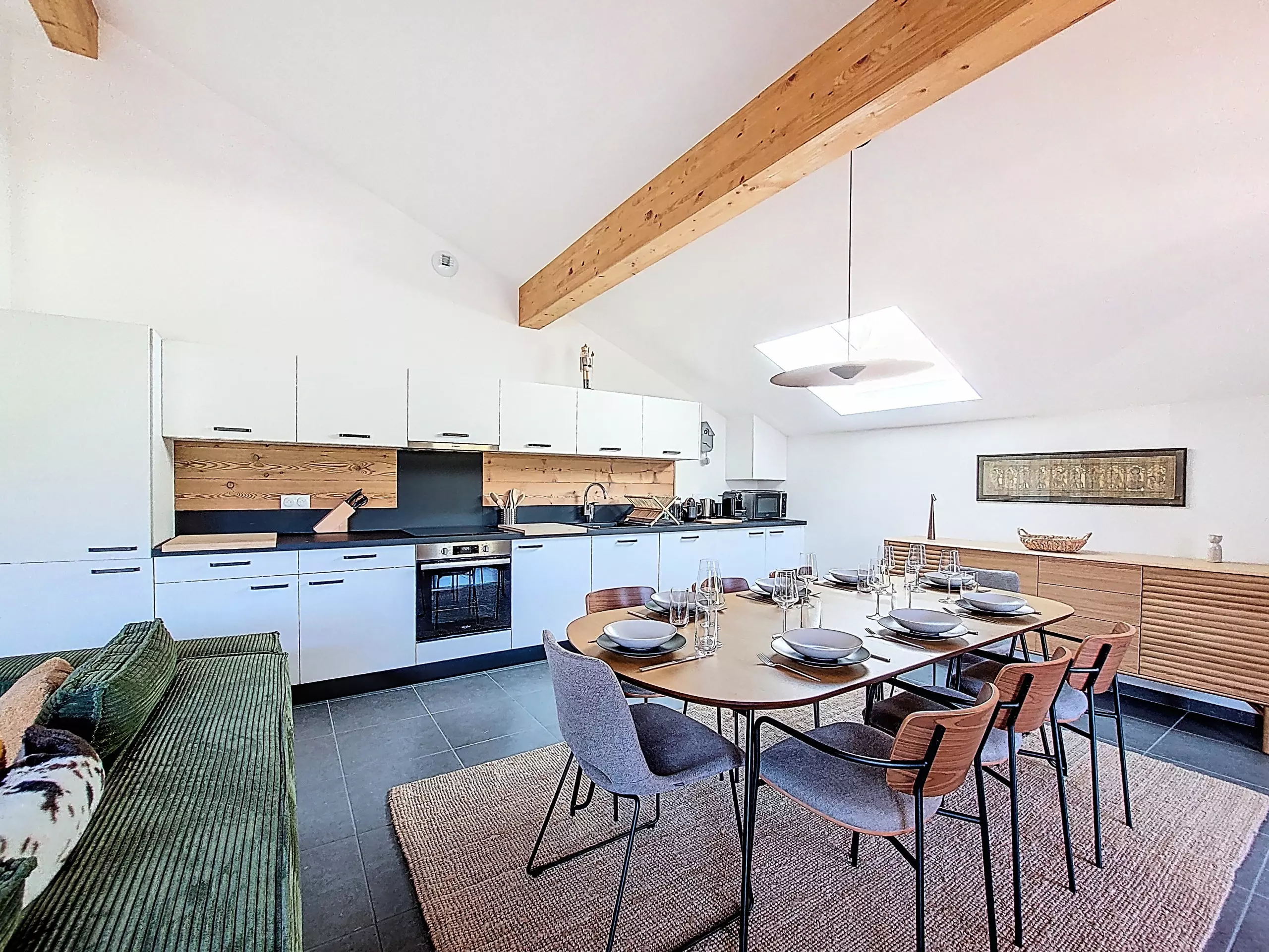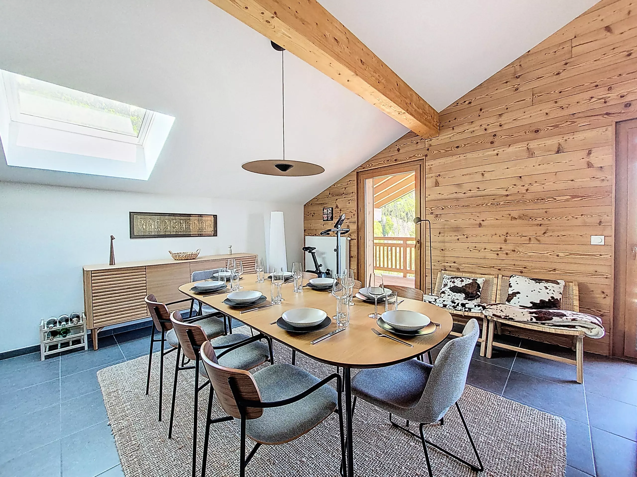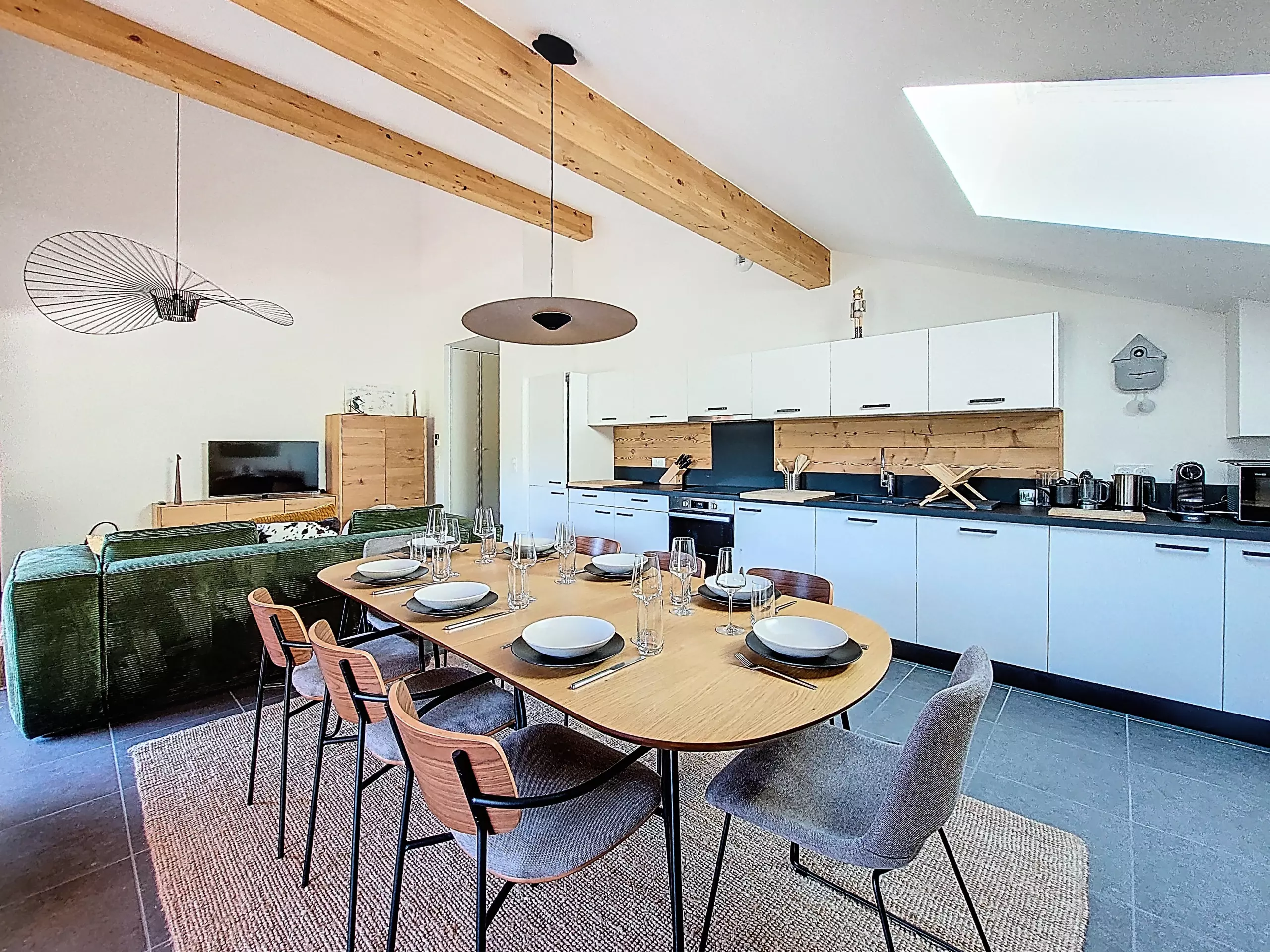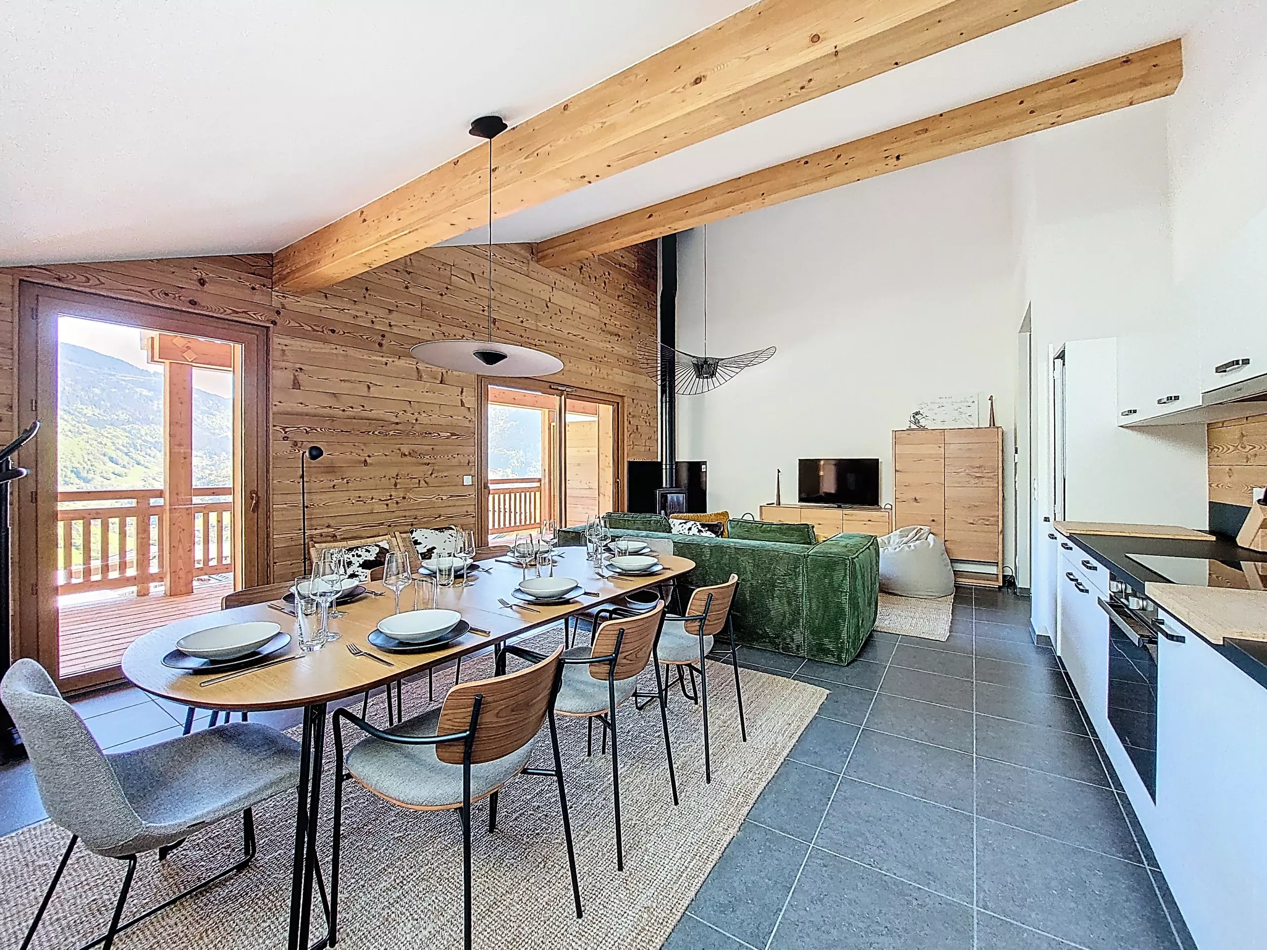 - An 18m² terrace with mountain view, equipped with tables and chairs for eating outside.
