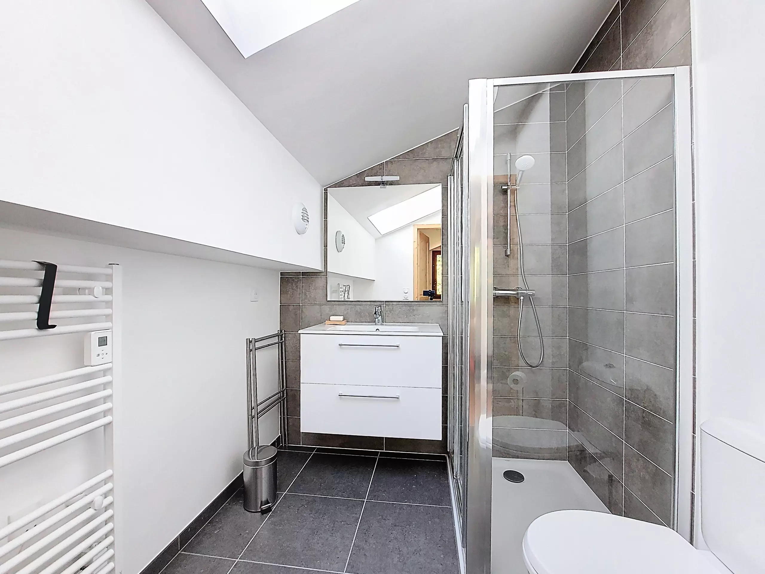 bathroom with 1 shower, 1 sink, 1 WC, 1 towel dryer.