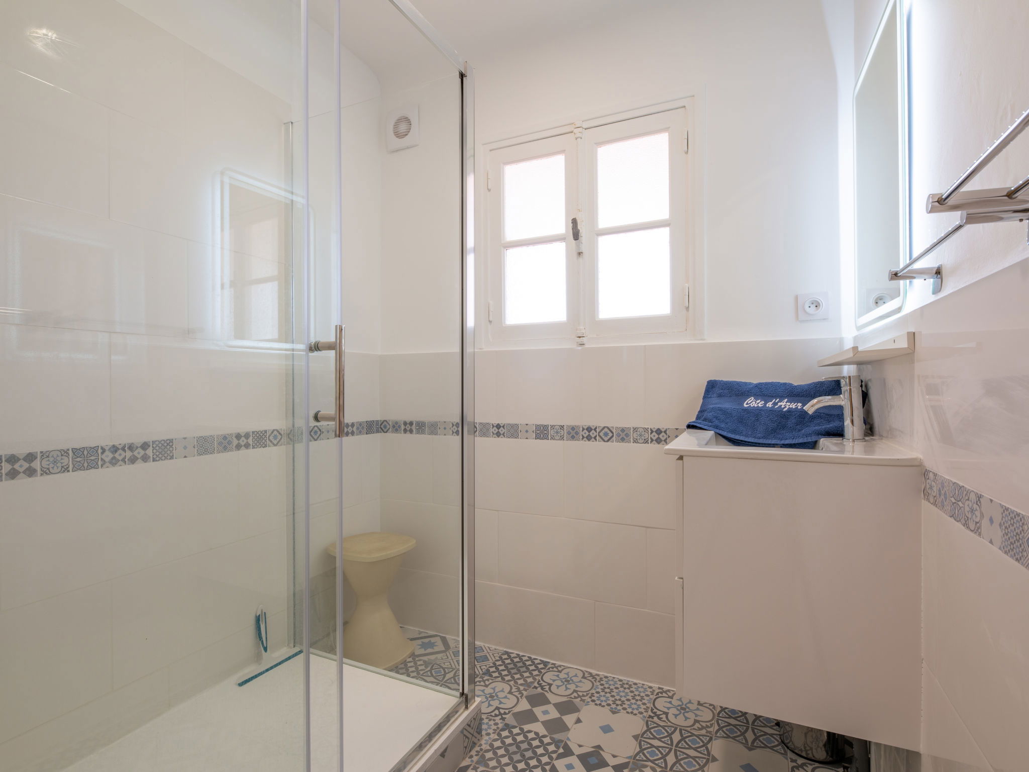 4-room house 70 m2, north-east facing position. Rustic furnishings: living/dining room with open-hearth fireplace (only for decoration), TV (flat screen). Exit to the terrace. 2 rooms, each room with 1 french bed (1 x 140 cm, length 190 cm). Exit to the terrace. 1 room with 1 bed (120 cm, length 190 cm). Large kitchen (oven, dishwasher, 3 ceramic glass hob hotplates, toaster, kettle, freezer, electric coffee machine). Exit to the terrace. Shower, sep. WC. Heating. Large terrace 22 m2 partly, north facing position and, east facing position. Terrace furniture. Marvellous view of the sea. Facilities: washing machine, iron, hair dryer. Internet (WiFi, extra). Parking. Please note: one double bedroom is outside the apartment. Maximum 1 pet/ dog allowed. TV only FR. Smoke alarm. Offer by a private individual according to Art. 155, IV of CGI. 831070026548E