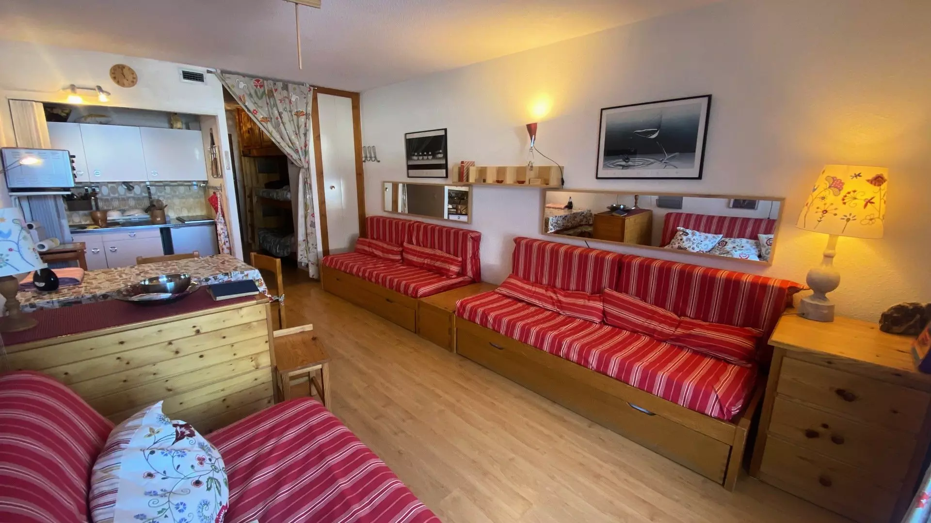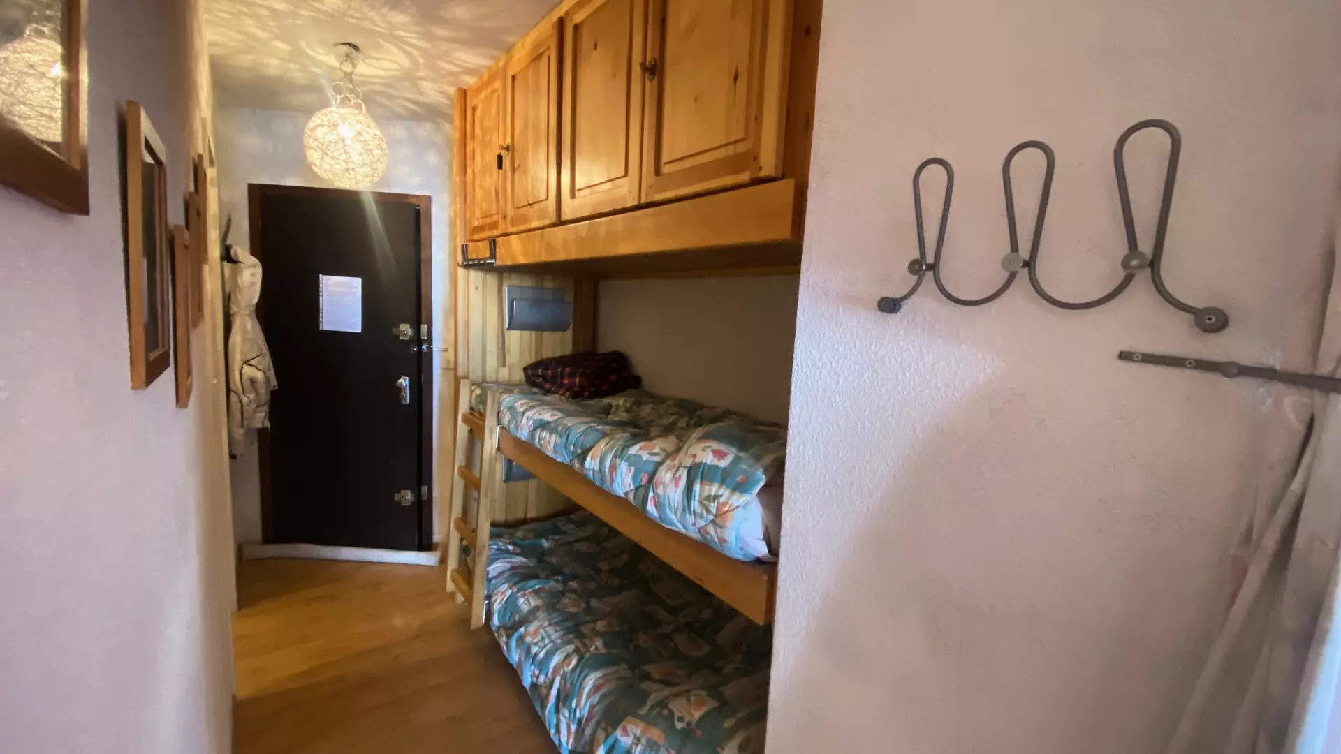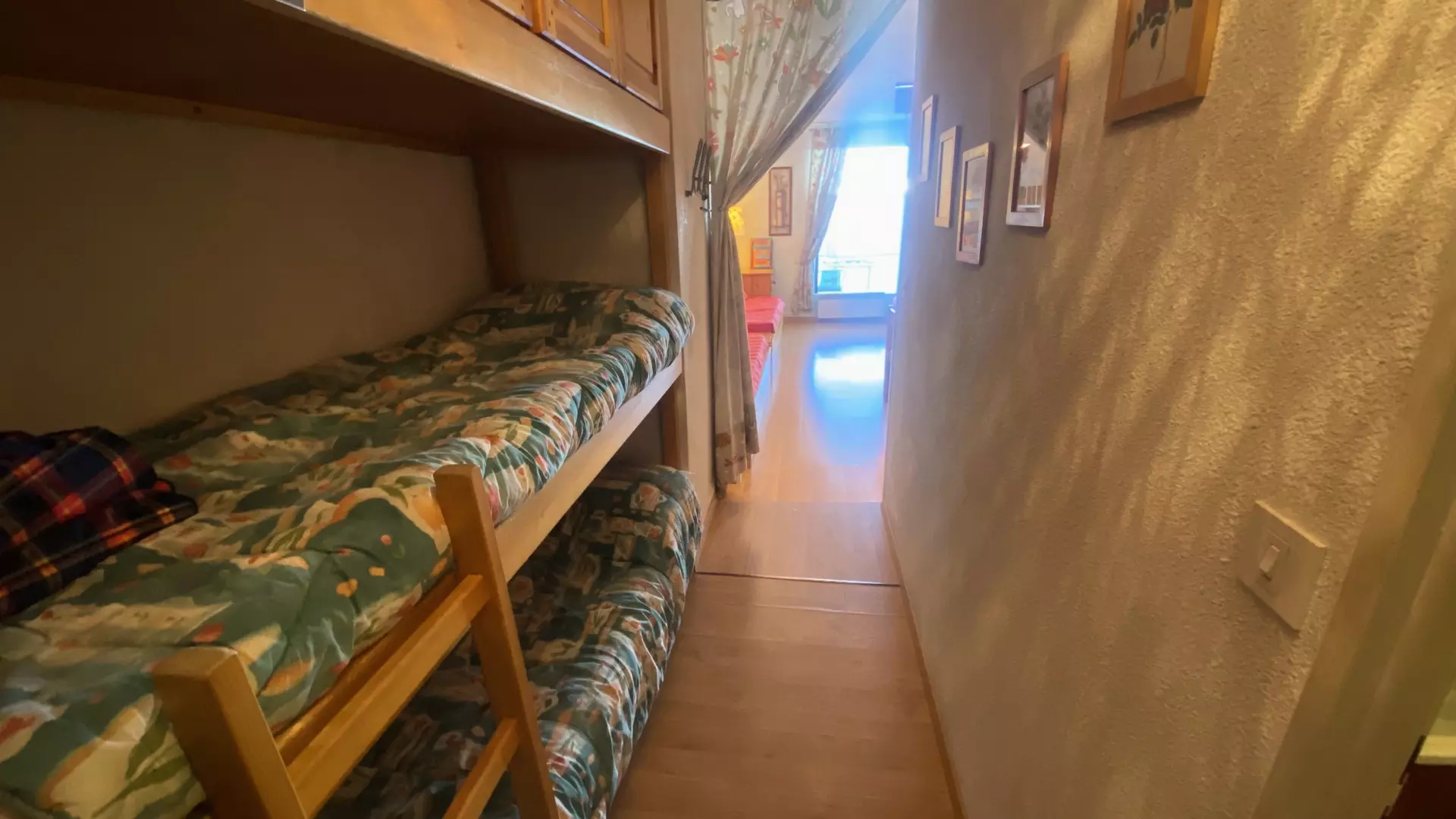 Mountain corner separated from the living room by a curtain: 2 bunk beds + large closet above.