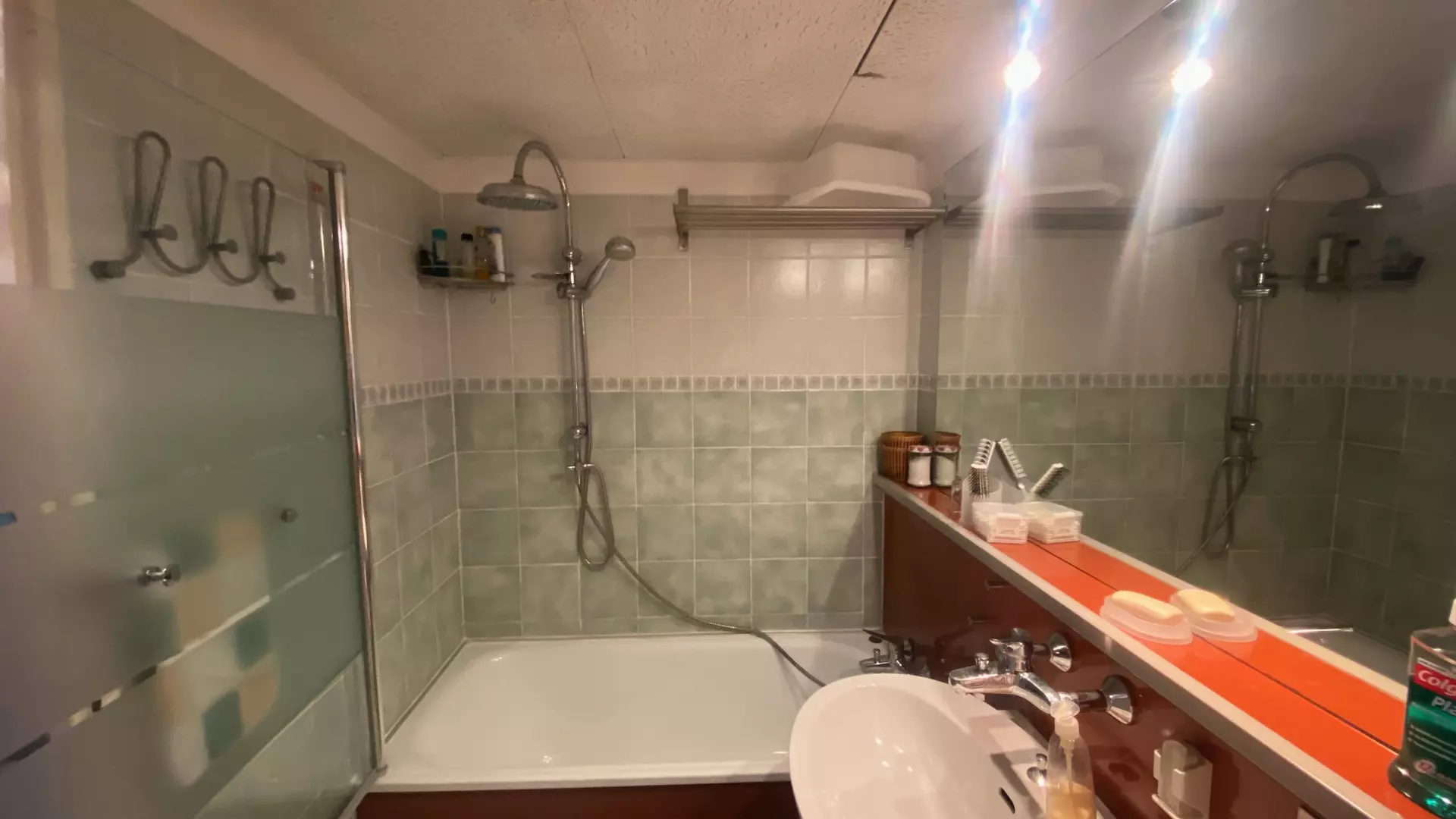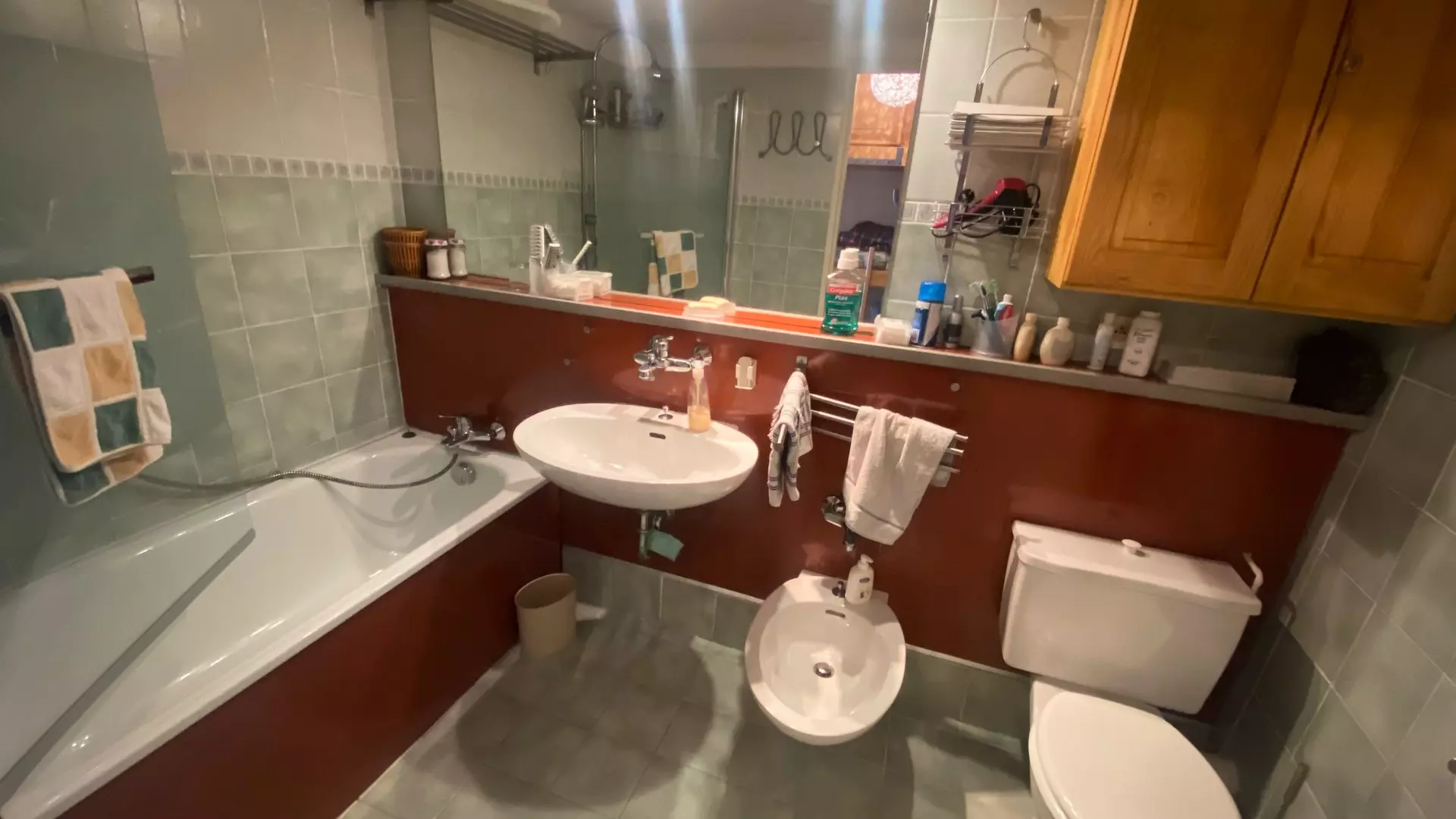 Bathroom: Bathtub with shower screen, bidet, sink, toilet, storage shelves, very large mirror, storage cupboard, towel dryer.