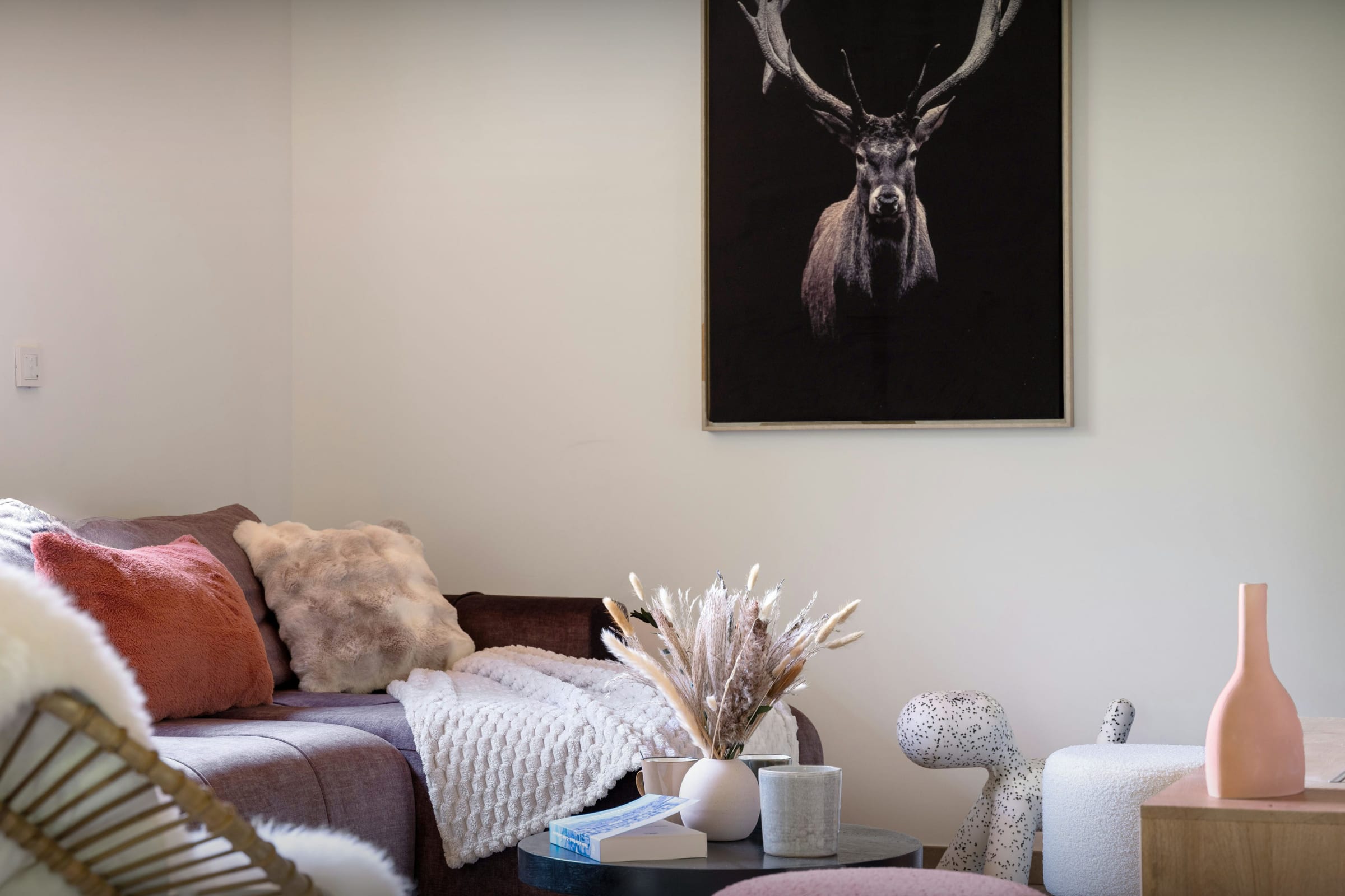The spacious living area includes a cosy lounge with sofa, television and wood-burning stove, a table for meals with family and friends, and a well-equipped open-plan kitchen. There’s a separate laundry room with a washing machine and tumble dryer.