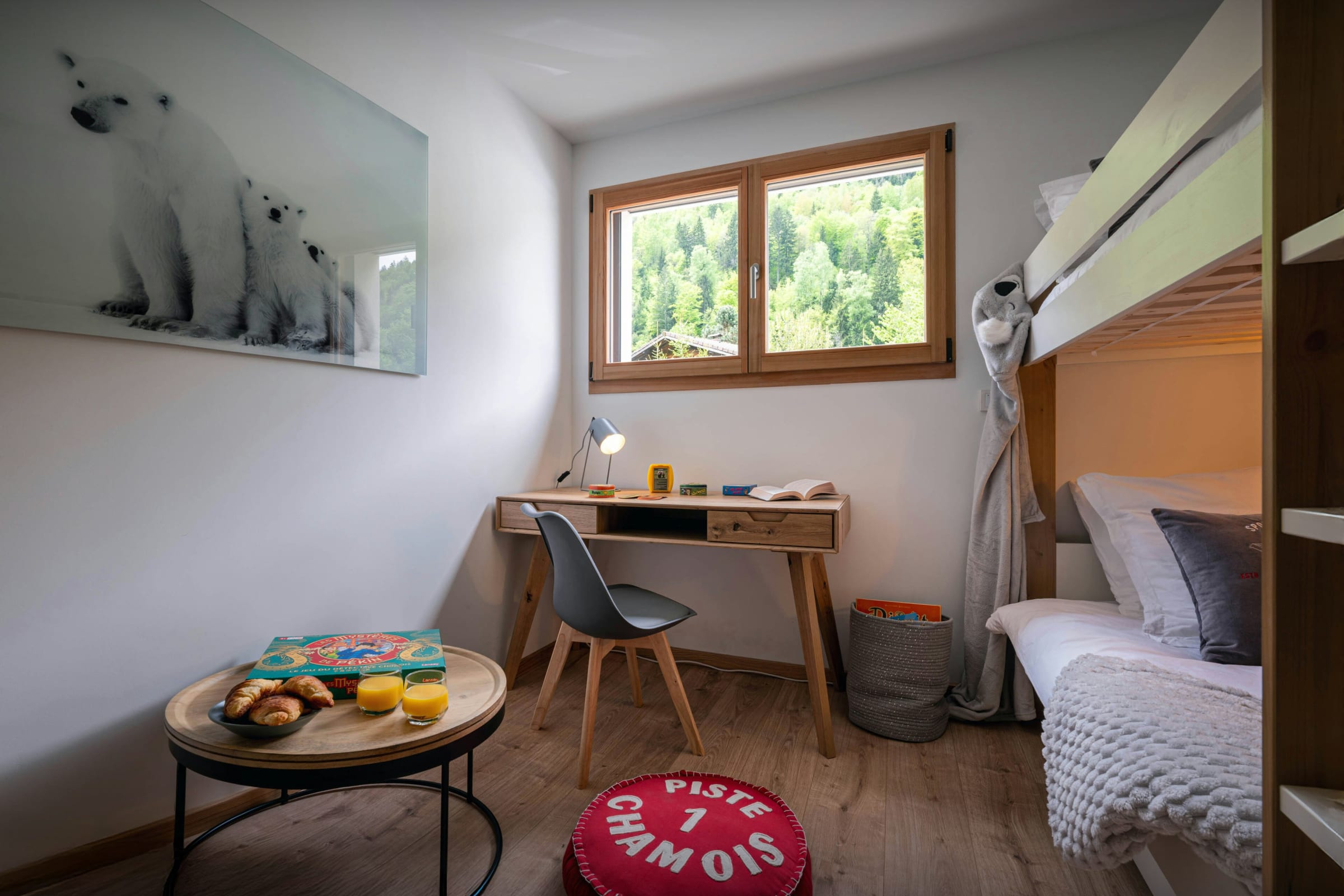 The children's bedroom with bunk beds and desk is on the ground floor, along with a shower room and toilet.