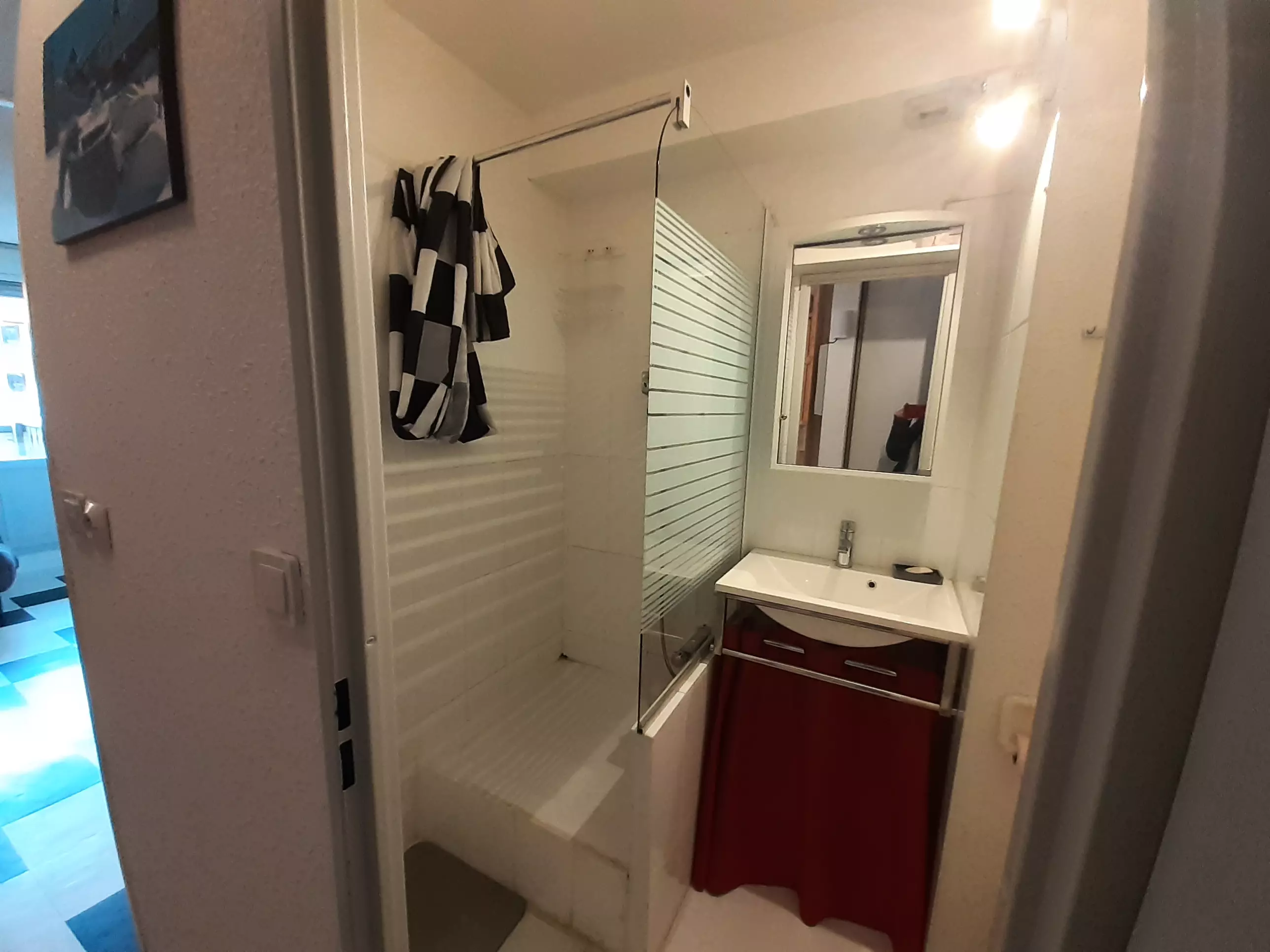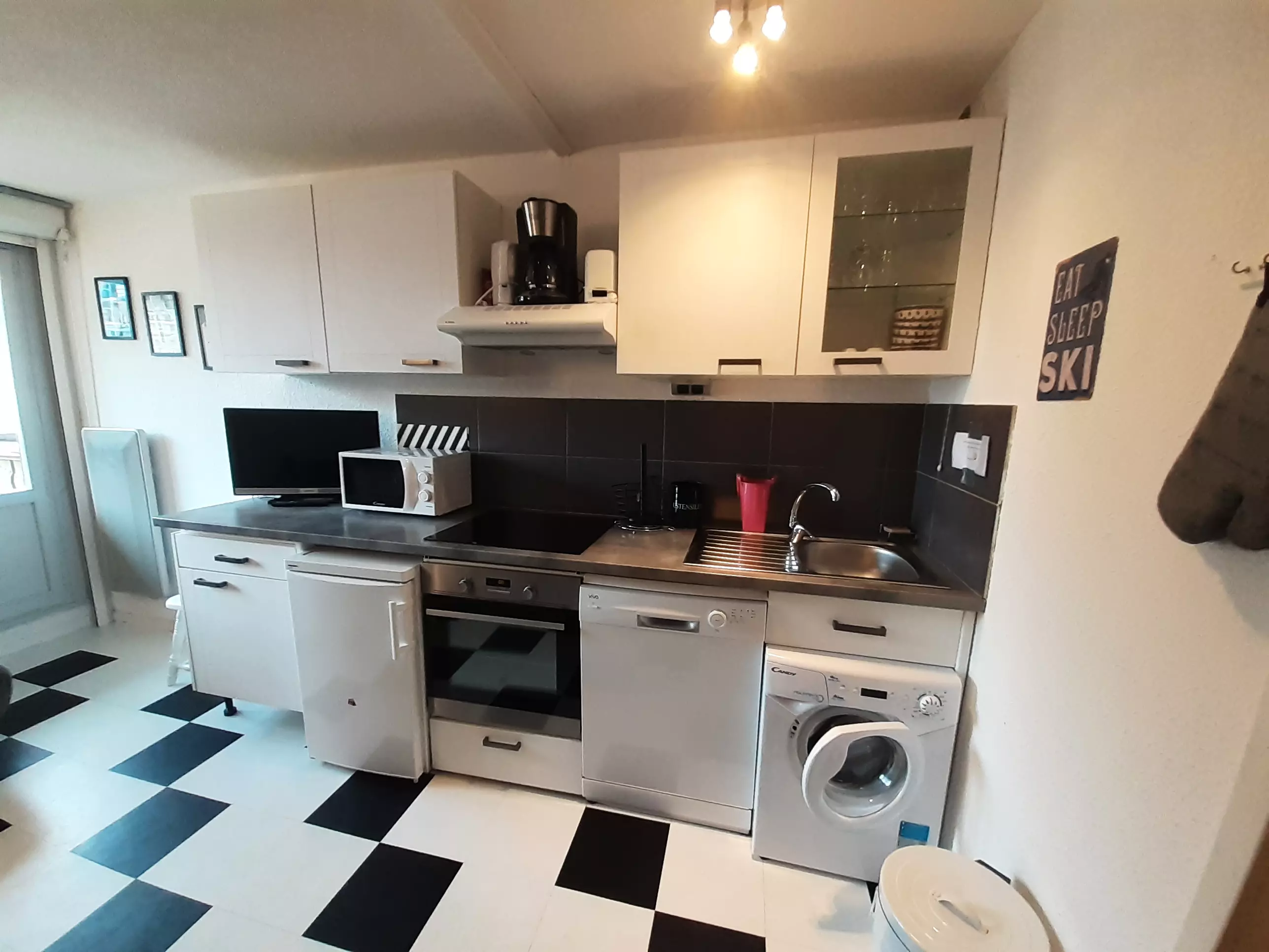 - Equipped kitchen area: 3-burner ceramic hob, extractor fan, oven, microwave, refrigerator, filter coffee maker, toaster, kettle, waffle maker/croque monsieur