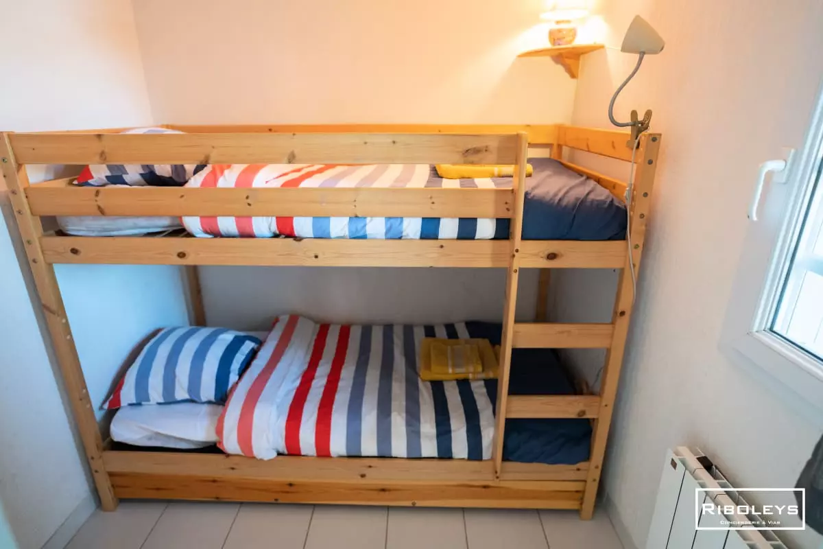 The bright living room includes a sofa bed (140x190 cm), a television, a dining table, and a fully equipped kitchen to meet your needs. The bathroom has a shower and a washing machine, while the toilet is separate for added convenience. You will find a comfortable bedroom with a double bed (140x190 cm) and a second bedroom with two bunk beds (90x190 cm).
