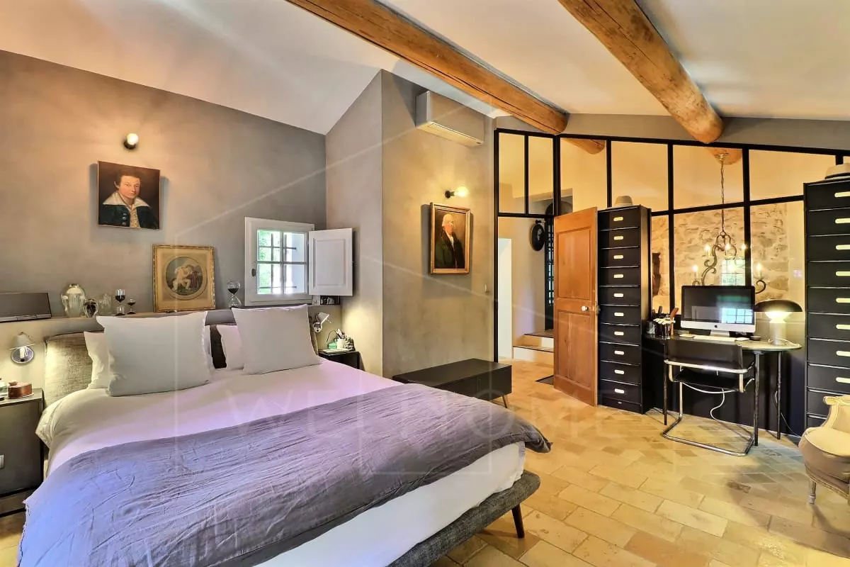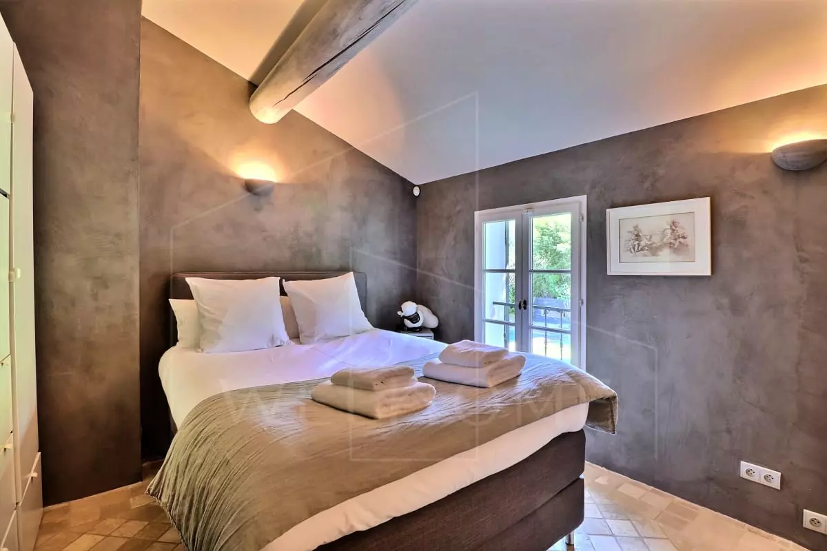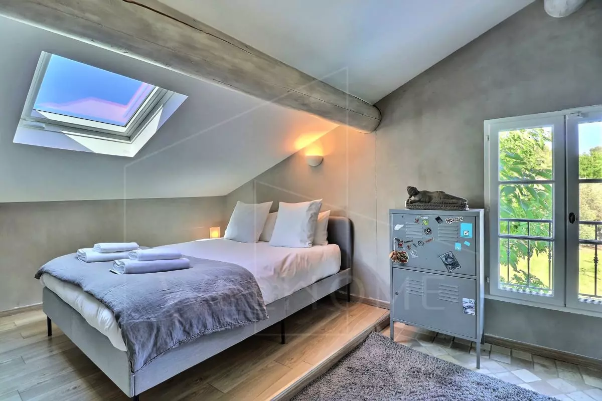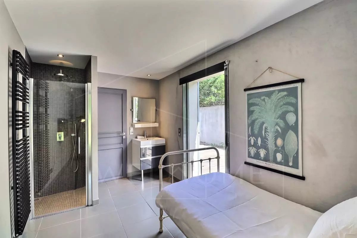 Outside, in the heart of the 2,500 m² landscaped garden, is a separate bedroom located on the pool side. Accessible only from the outside, it is a true cocoon of tranquility. This room, equipped with a 140 x 200 cm bed and a private bathroom, is perfect for a couple seeking more privacy or for guests seeking peace and quiet.