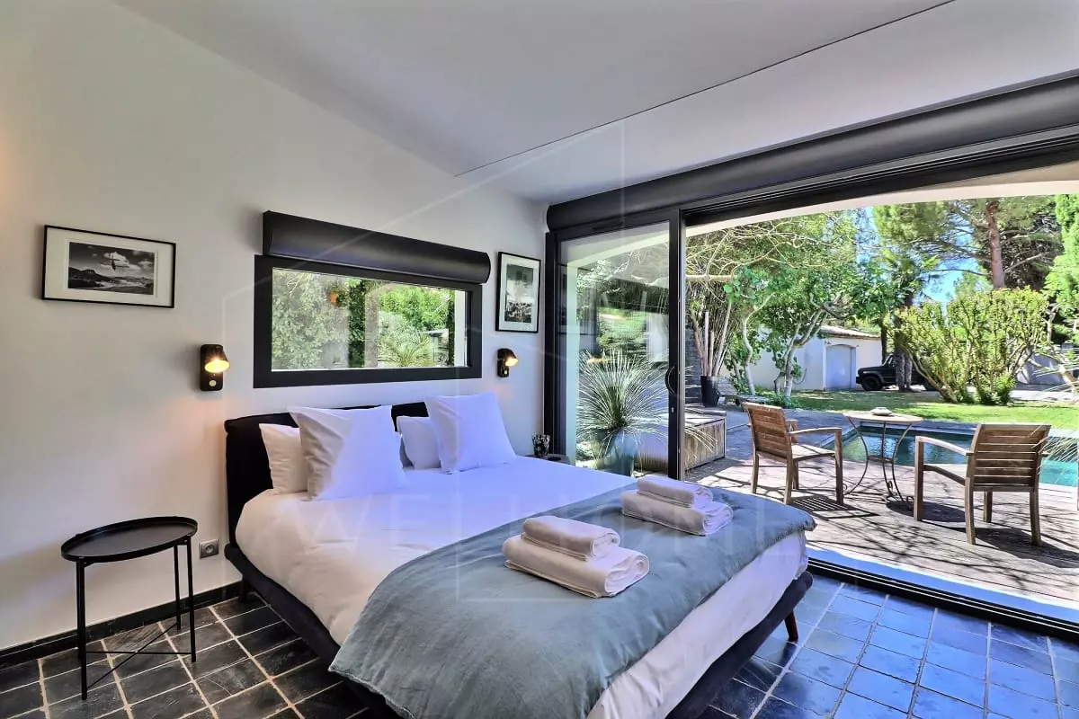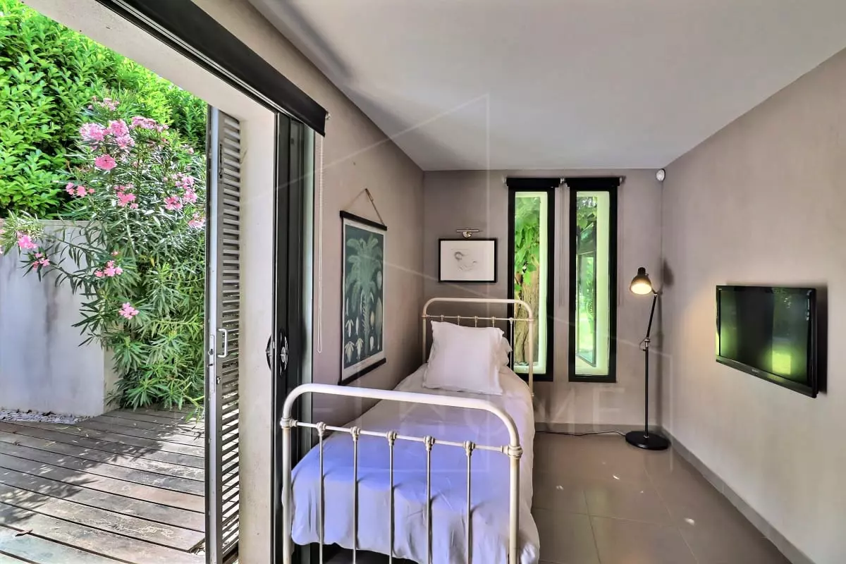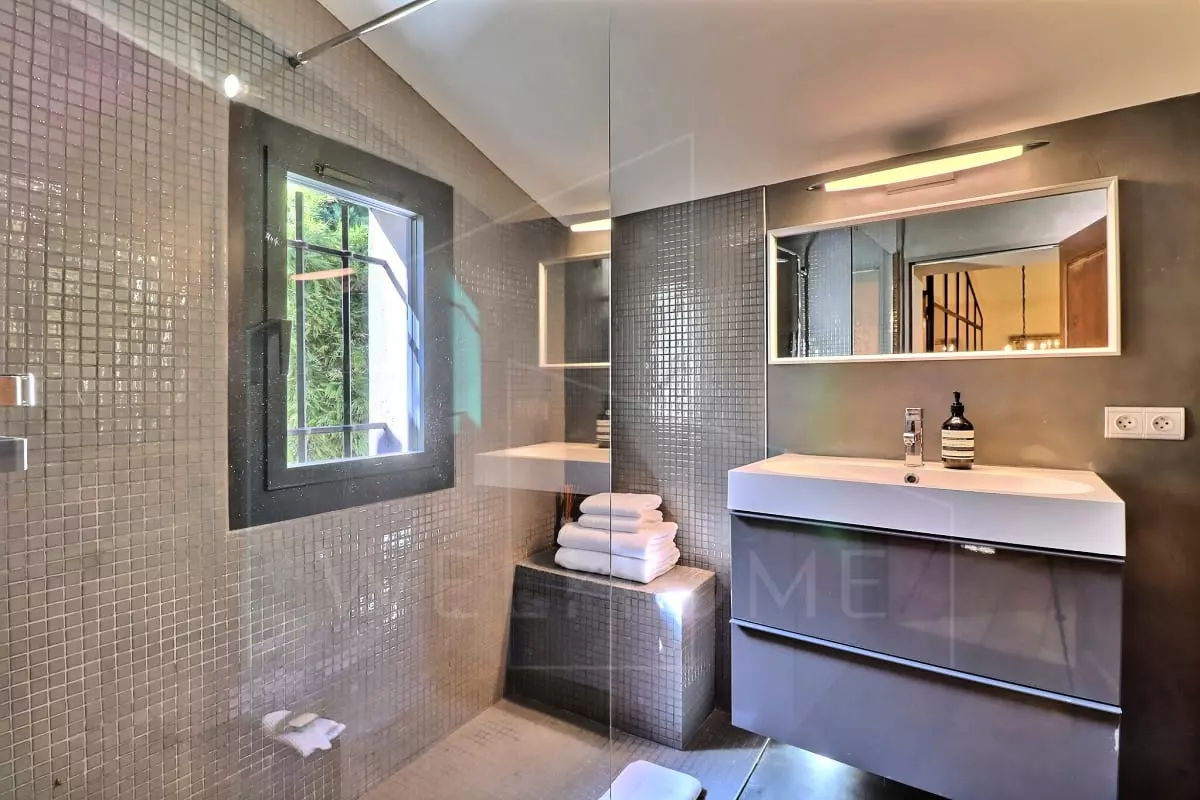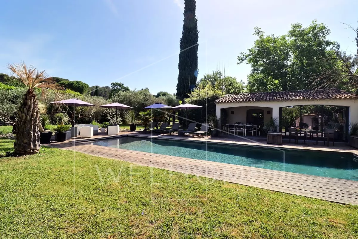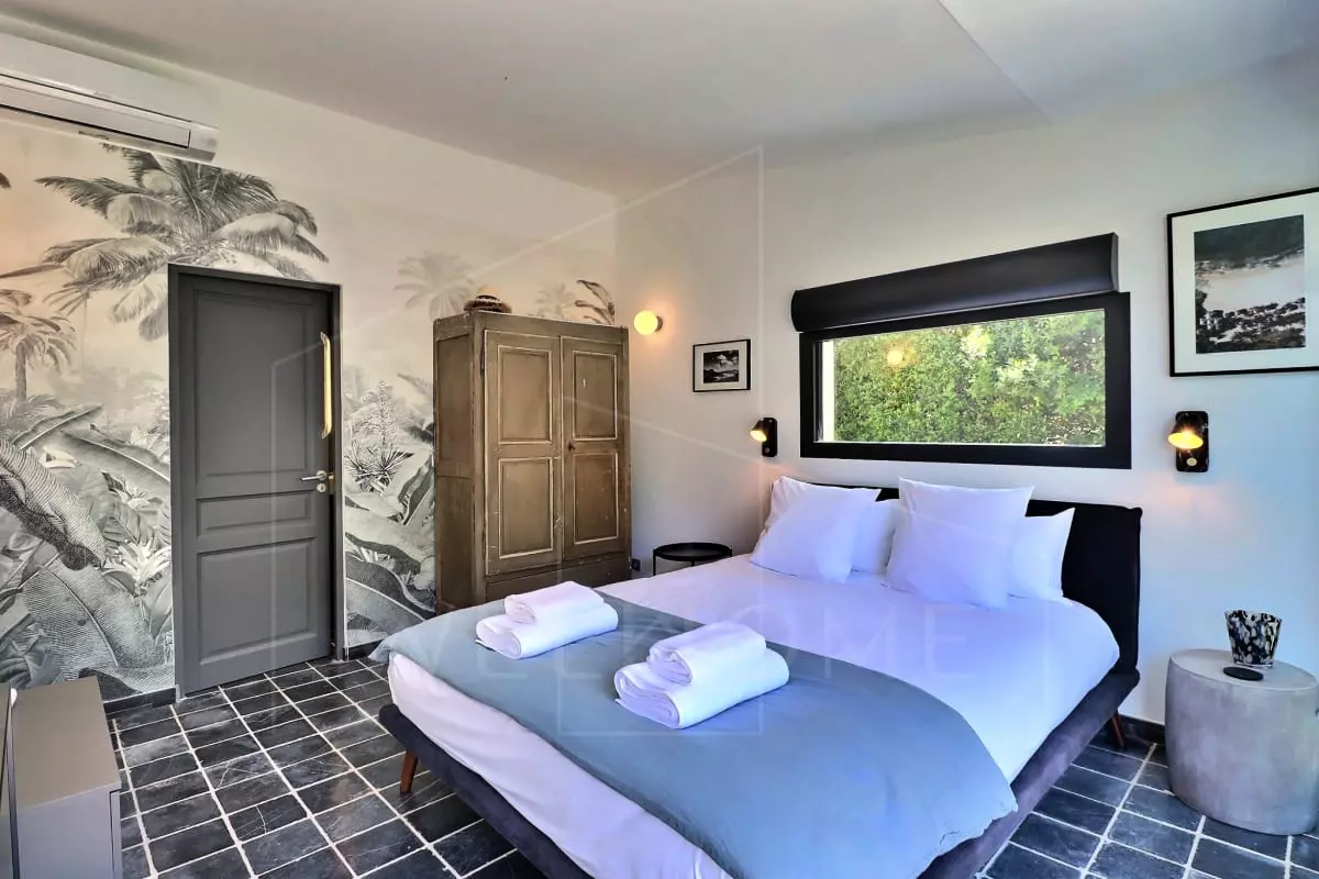 The garden, a veritable haven of greenery dotted with Mediterranean plants, features a beautiful wood-lined swimming pool, a landscaped pool house, and several shaded areas ideal for relaxation. Each outdoor space has been designed to offer an immersive experience, combining nature, refinement, and the good life.