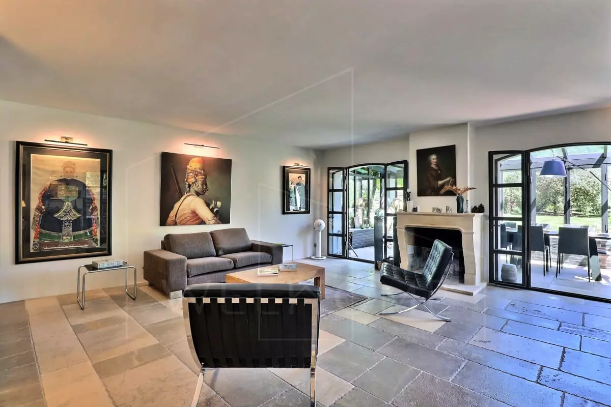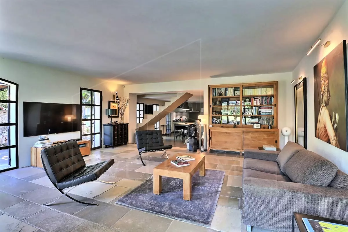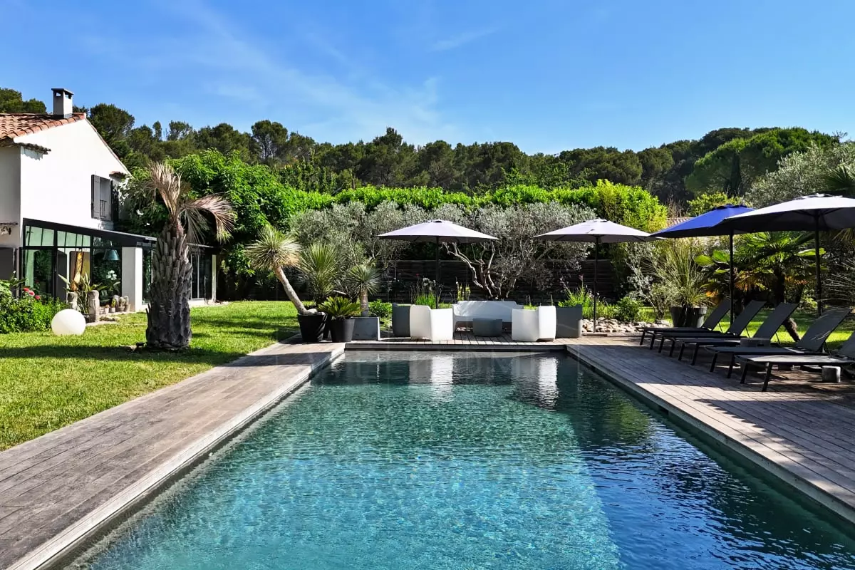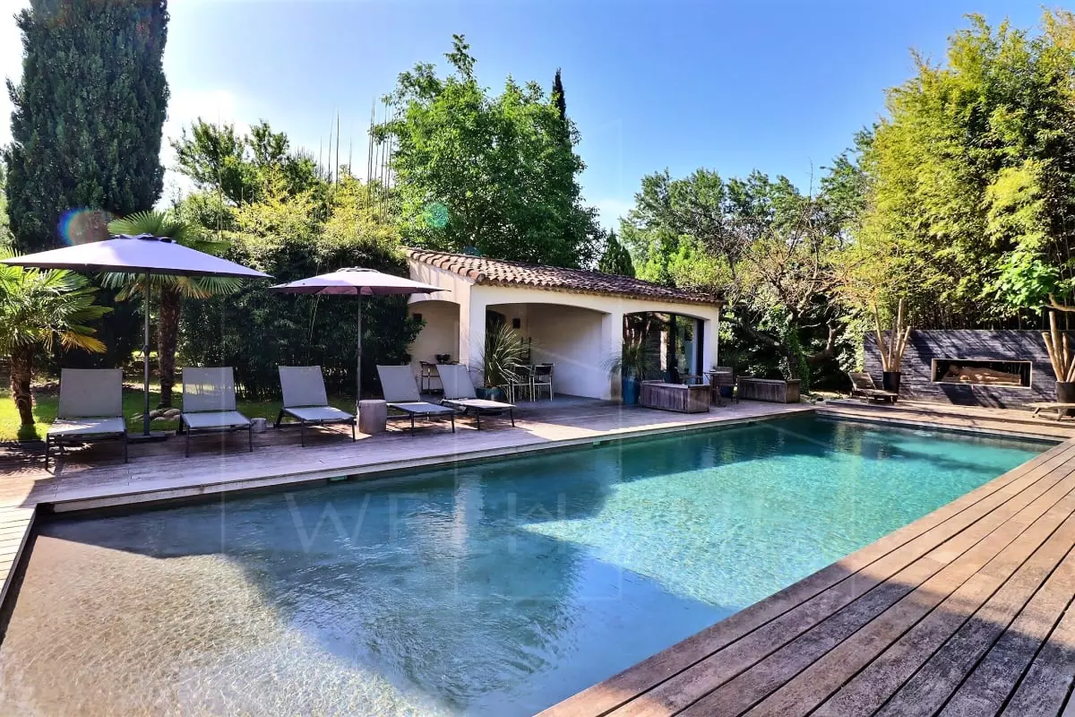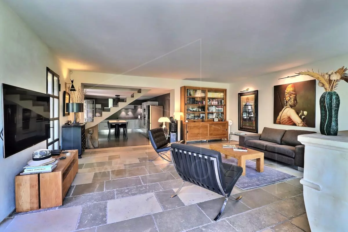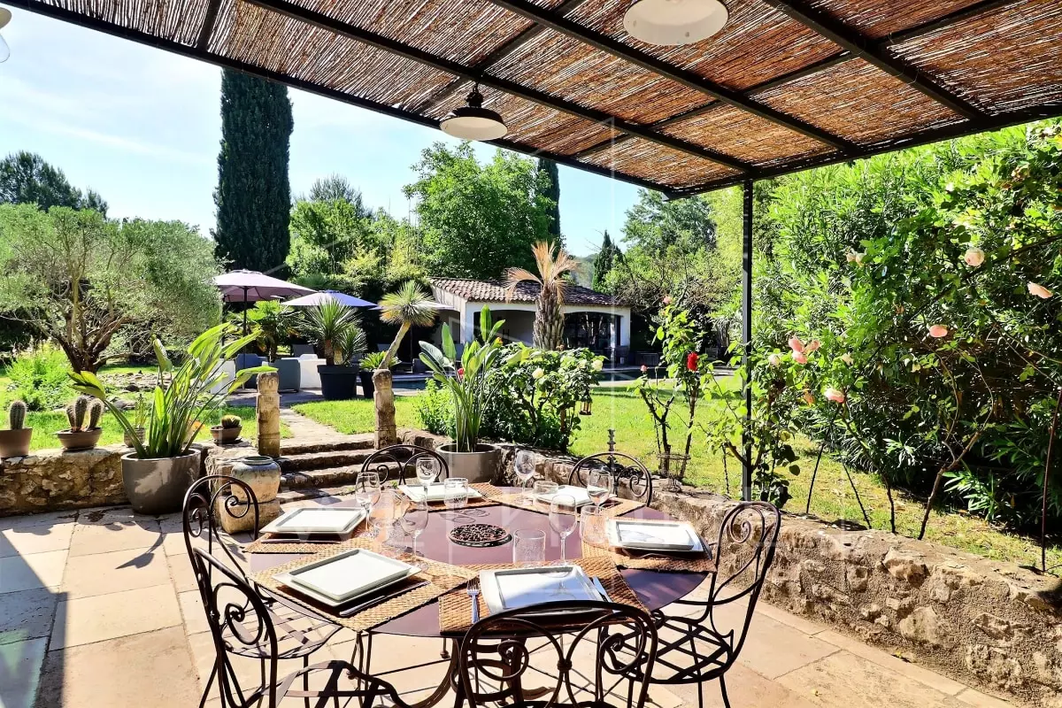 The garden, a veritable haven of greenery dotted with Mediterranean plants, features a beautiful wood-lined swimming pool, a landscaped pool house, and several shaded areas ideal for relaxation. Each outdoor space has been designed to offer an immersive experience, combining nature, refinement, and the good life.