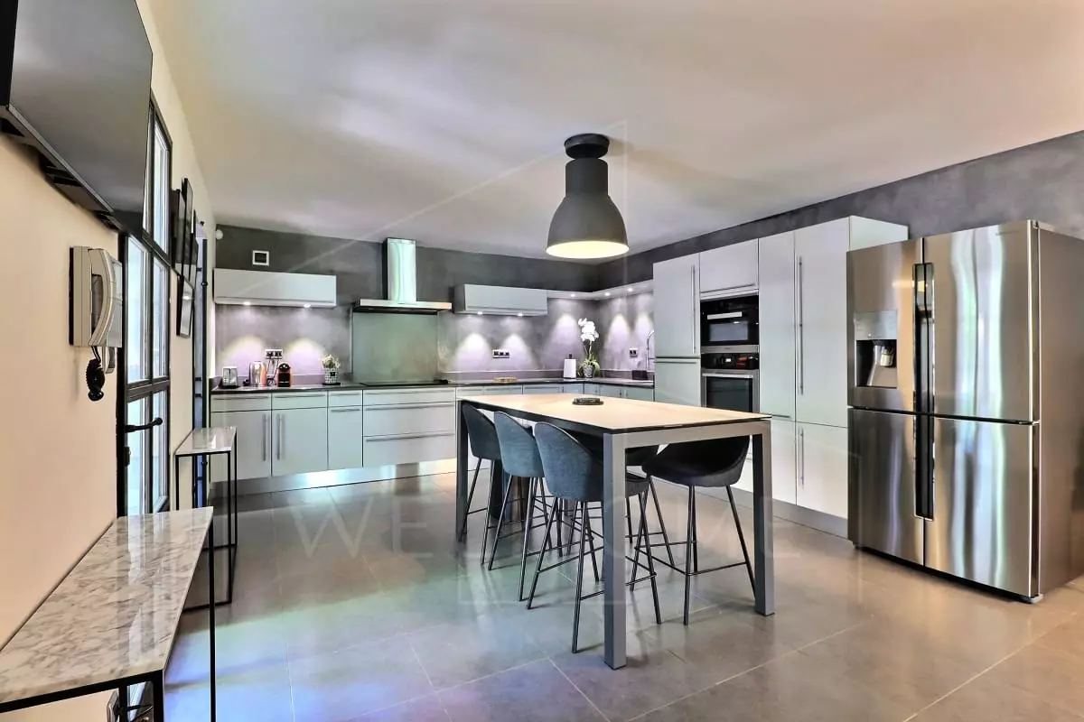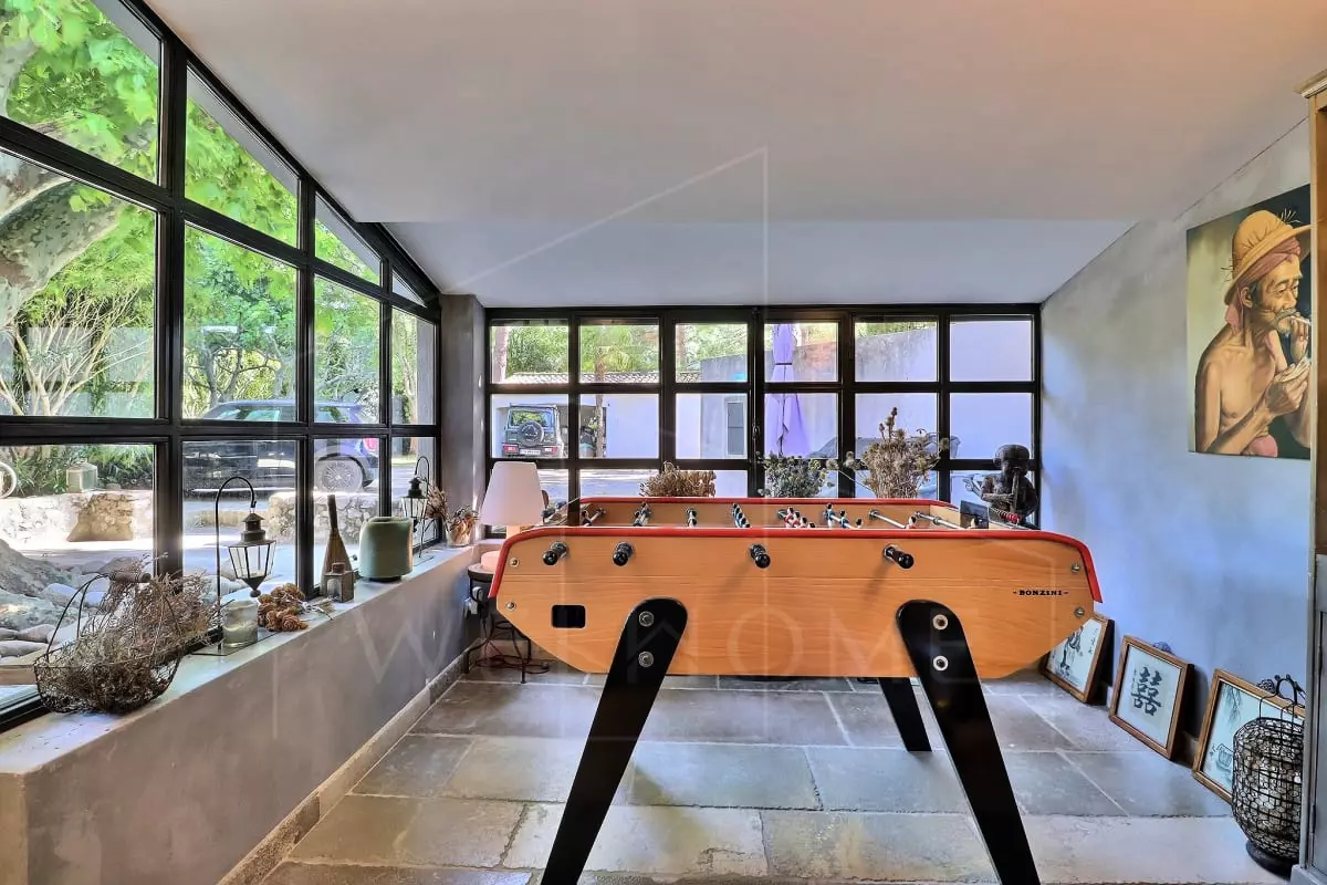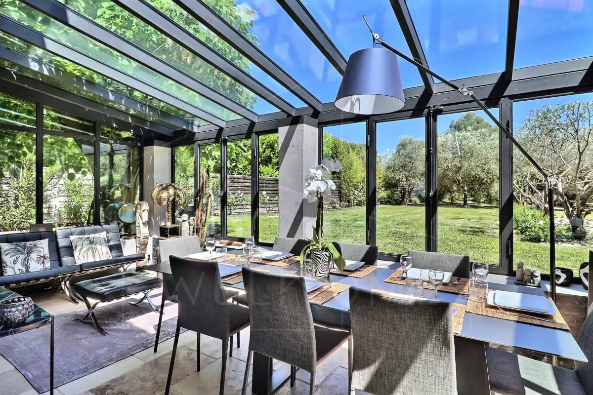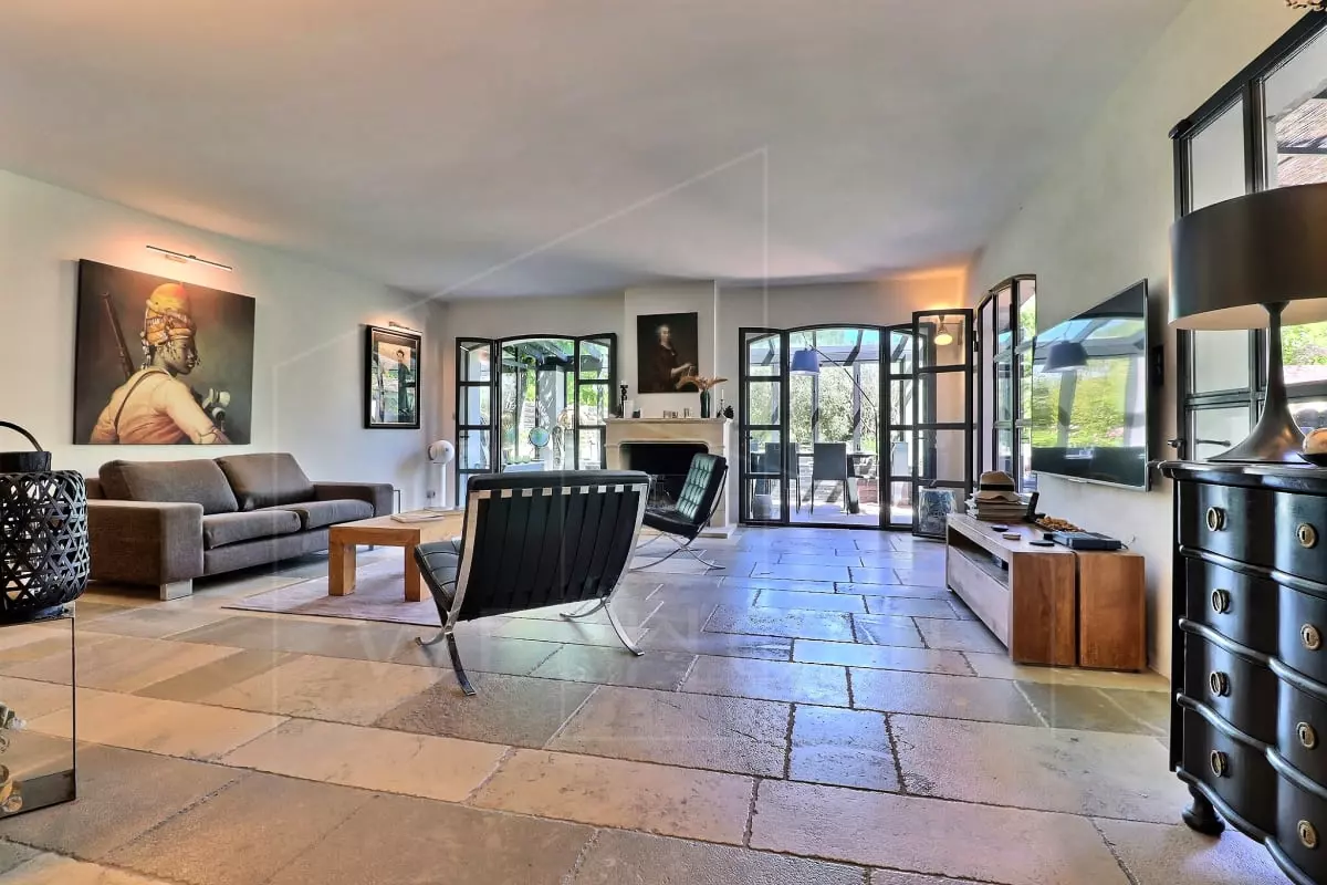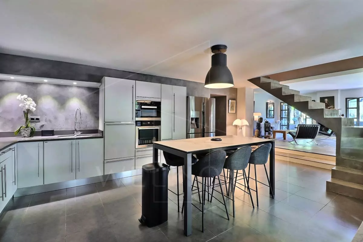 The garden, a veritable haven of greenery dotted with Mediterranean plants, features a beautiful wood-lined swimming pool, a landscaped pool house, and several shaded areas ideal for relaxation. Each outdoor space has been designed to offer an immersive experience, combining nature, refinement, and the good life.