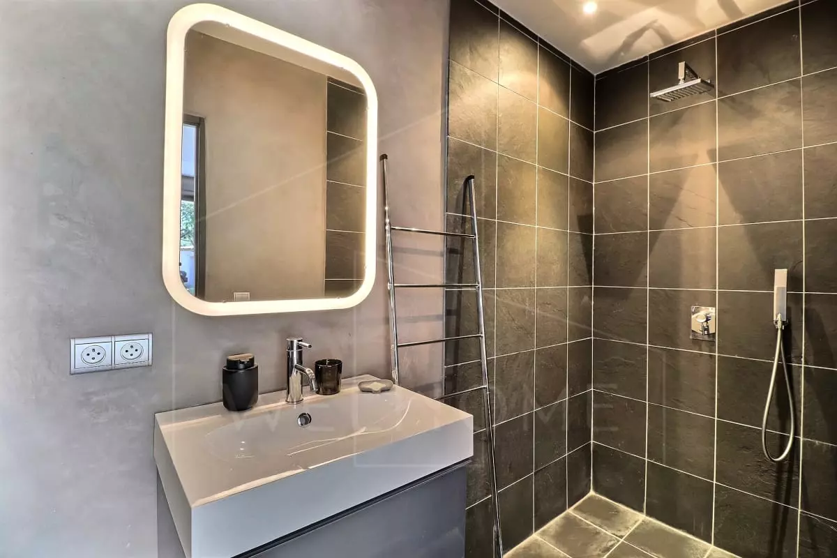 From the entrance, one is seduced by the generous volumes, the noble materials and the meticulous finishes. The main house consists of a vast living room, bathed in light, including a warm living room with fireplace, a fully equipped open kitchen with its central island, and a convivial dining room suitable for meals with family or friends. Still on the ground floor, a small bedroom with a single bed offers an ideal additional sleeping solution for a child or a guest. It has its own bathroom, with shower and sink, integrated into a separate and functional volume.