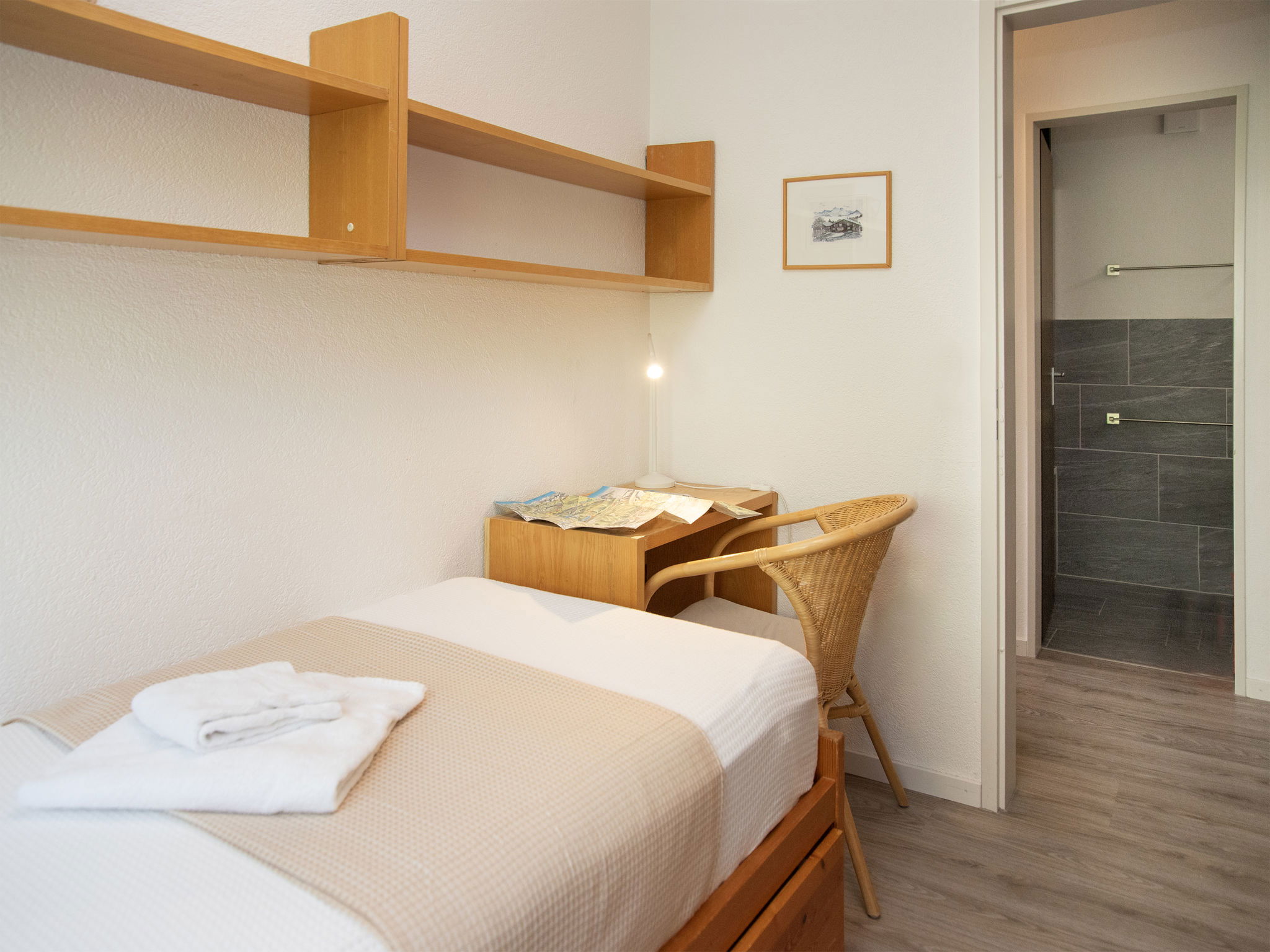 "La Siala Apt.51", 4-room apartment 58 m2 on 1st floor. Comfortable and cosy furnishings: living/dining room with cable TV (flat screen). Exit to the balcony. 1 double bedroom. 1 room with 1 bed and 1 pull-out bed. 1 room with 1 bed. Kitchen (oven, dishwasher, kettle, electric coffee machine, raclette grill, fondue Set (cheese)) with hatch. Bath/WC, sep. WC. Balcony 8 m2, south facing position. Balcony furniture. Beautiful view of the mountains, the valley and the countryside. Facilities: hair dryer. Internet (WiFi, free). Parking space n 11, garage at the house. Please note: non-smokers only. Maximum 1 pet/ dog allowed.