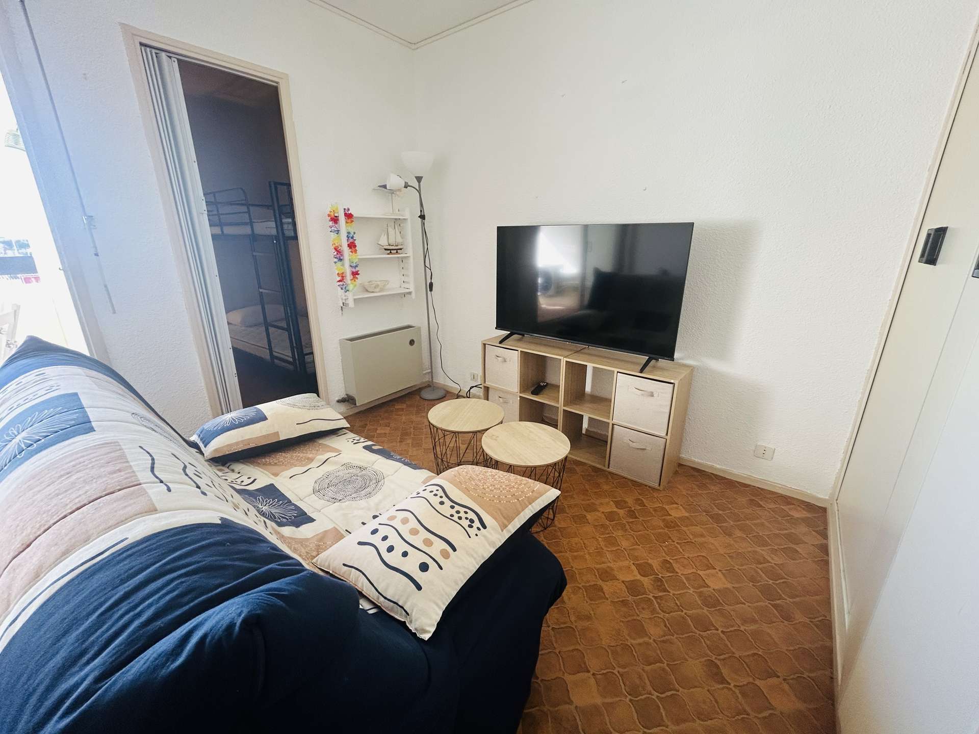 Cet appartement de vacances situé au 3ème étage avec ascenseur, comprend un séjour avec canapé convertible 2 places et télévision, une cabine avec un lit superposé, un coin cuisine équipé, une salle d'eau ainsi qu'un WC séparé.