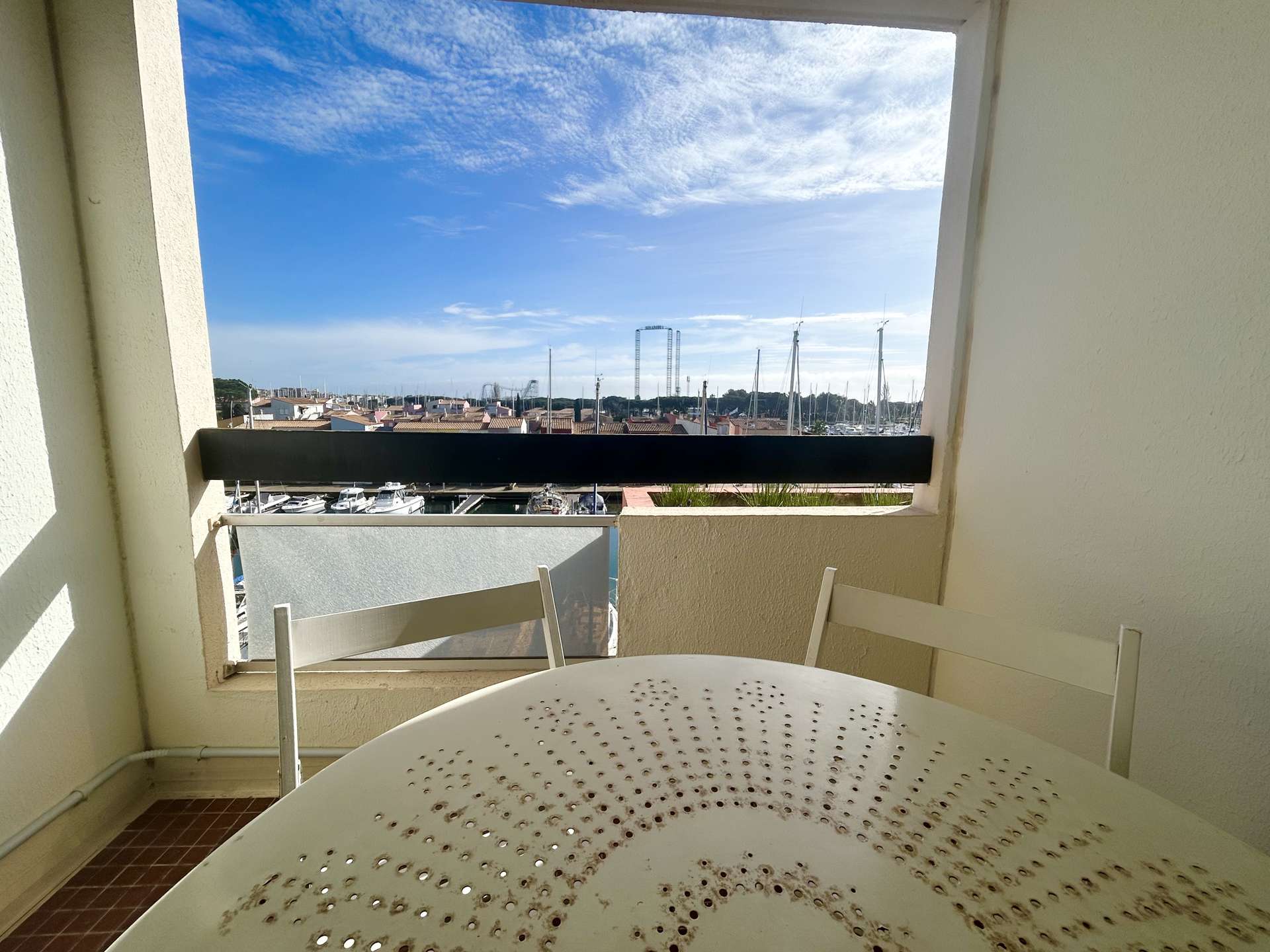 Les "Plus" de cette location à la mer : Une belle vue dégagé sur le port du Cap d'Agde, terrasse, parking privé.