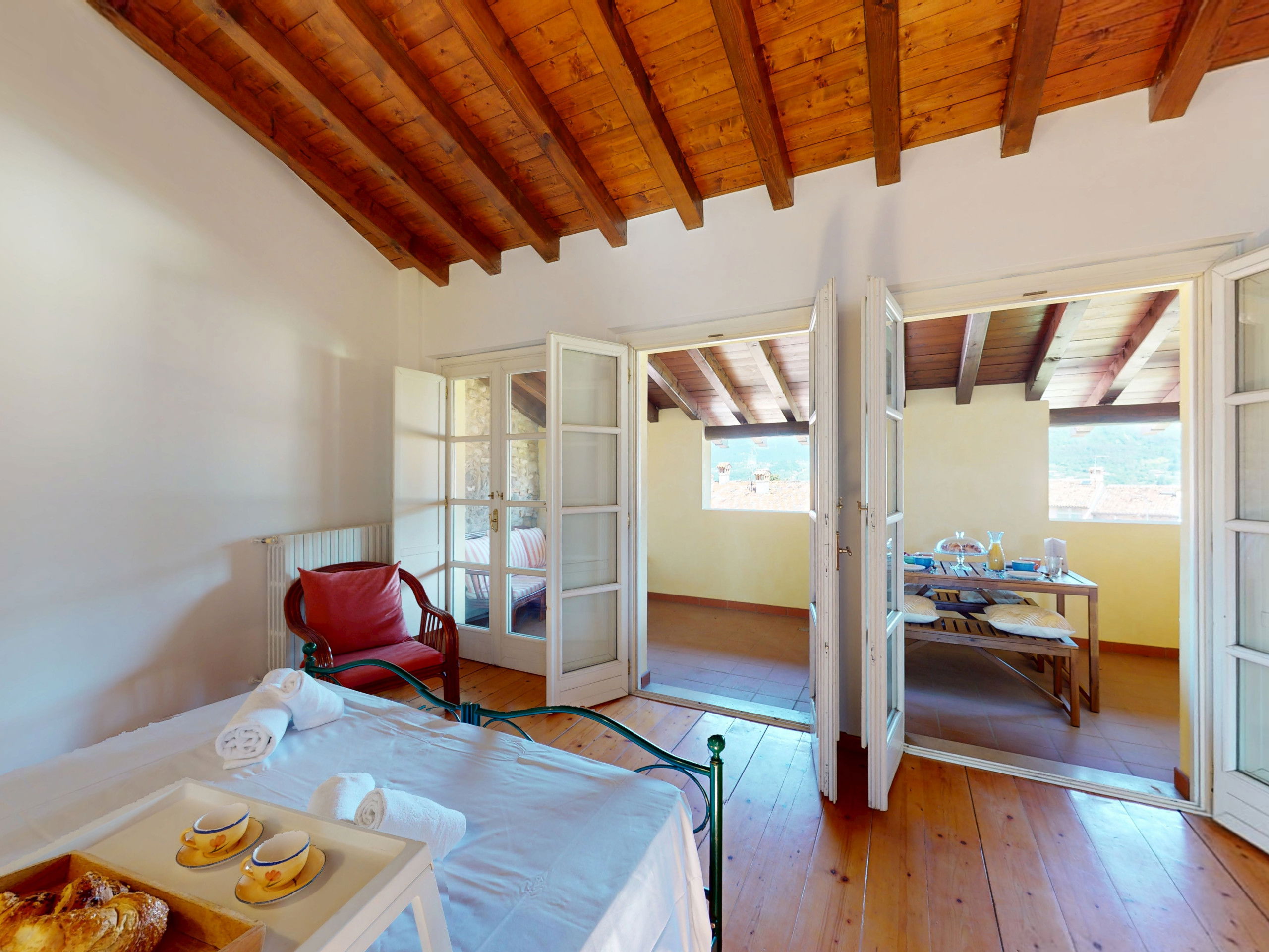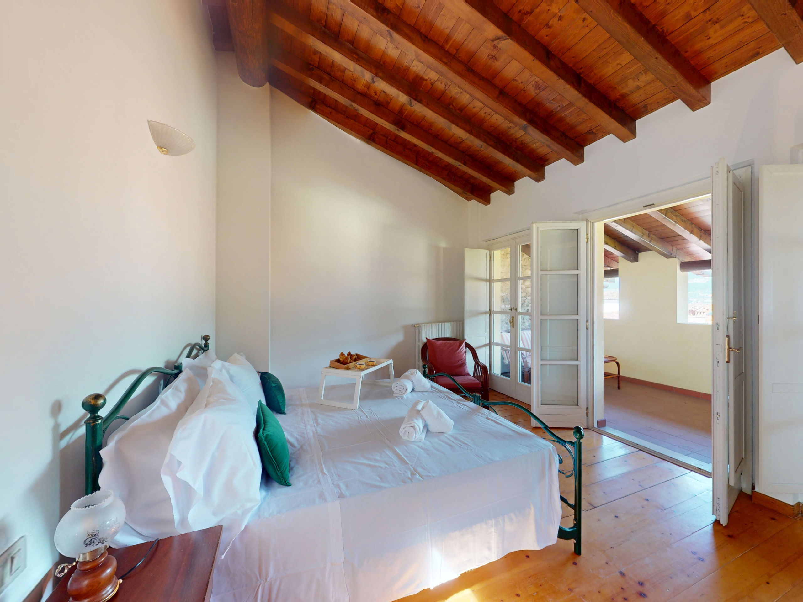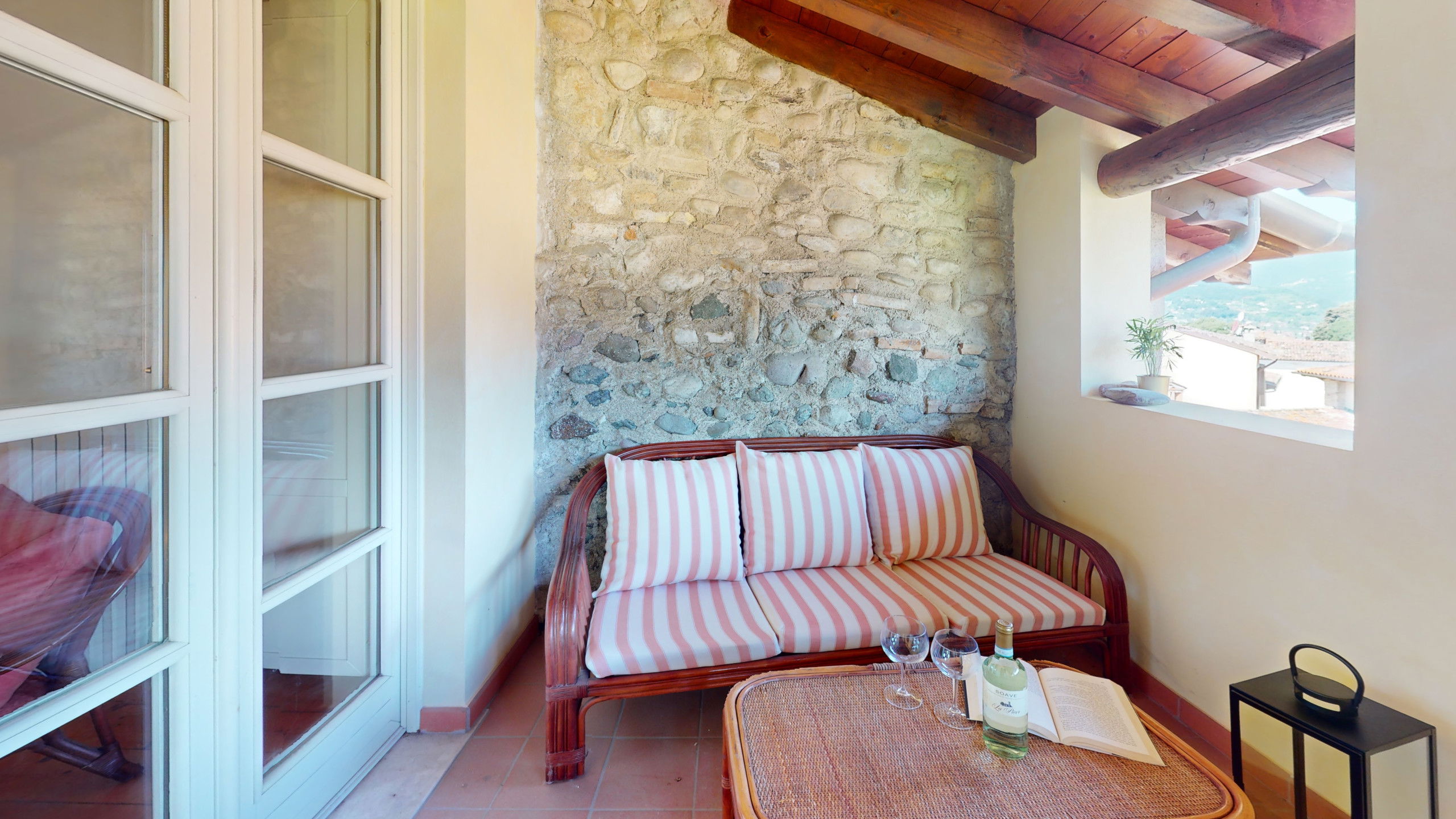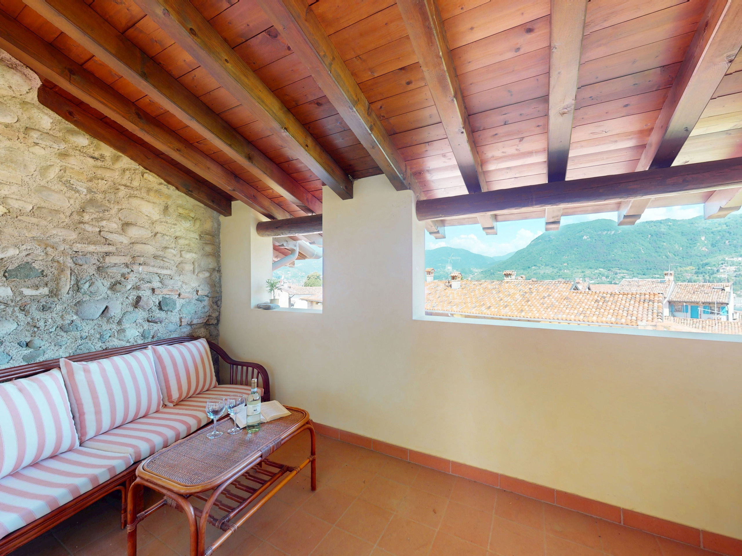 Going up to the upper floor, the space opens onto two bedrooms with suggestive exposed beams: the master bedroom, spacious and relaxing, opens onto a private terrace furnished with a table and chairs, offering a splendid view of the lake, perfect for an outdoor breakfast or a sunset aperitif.