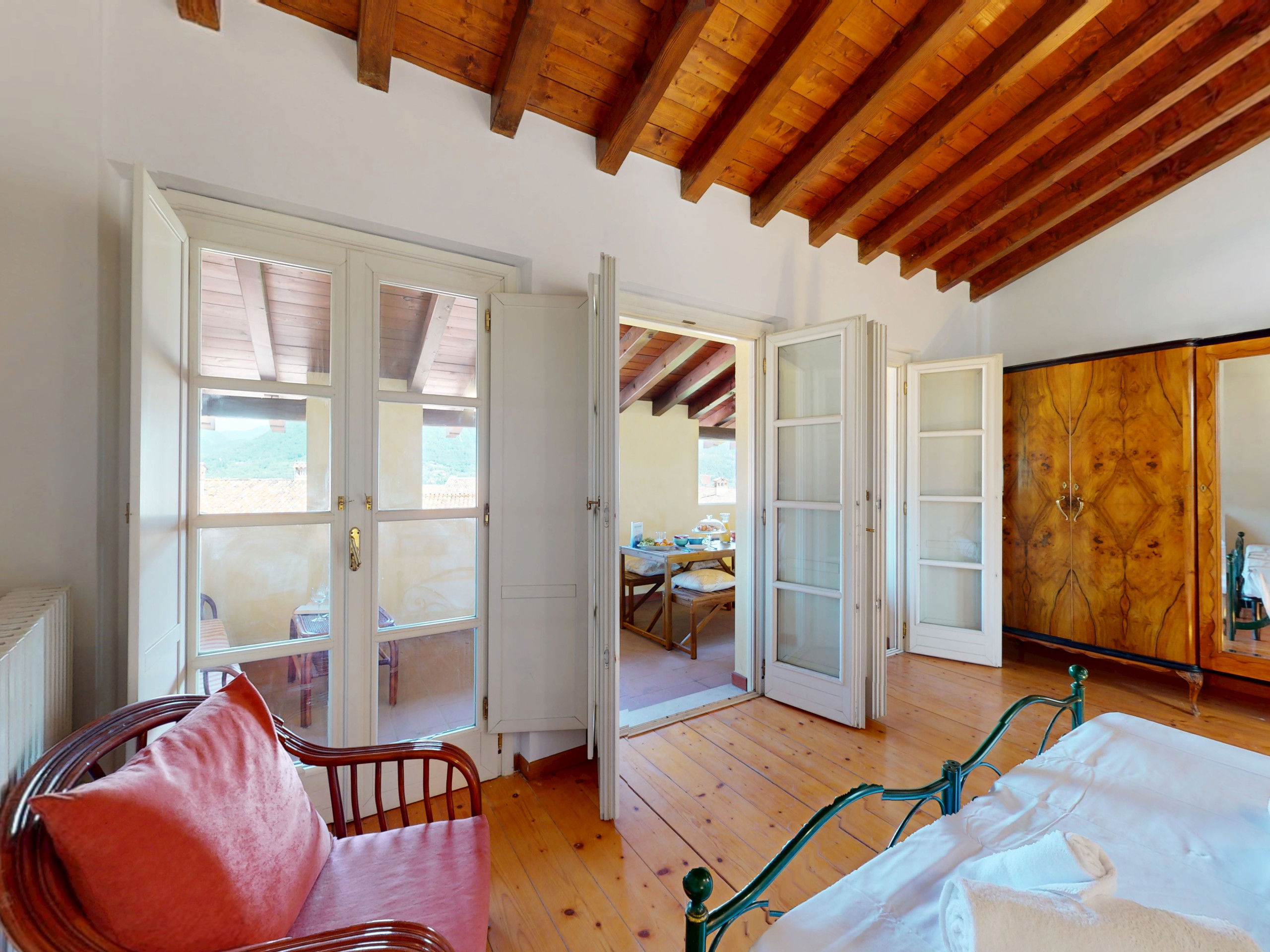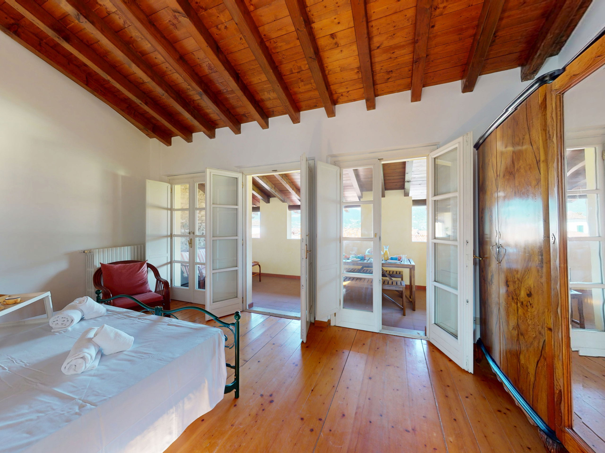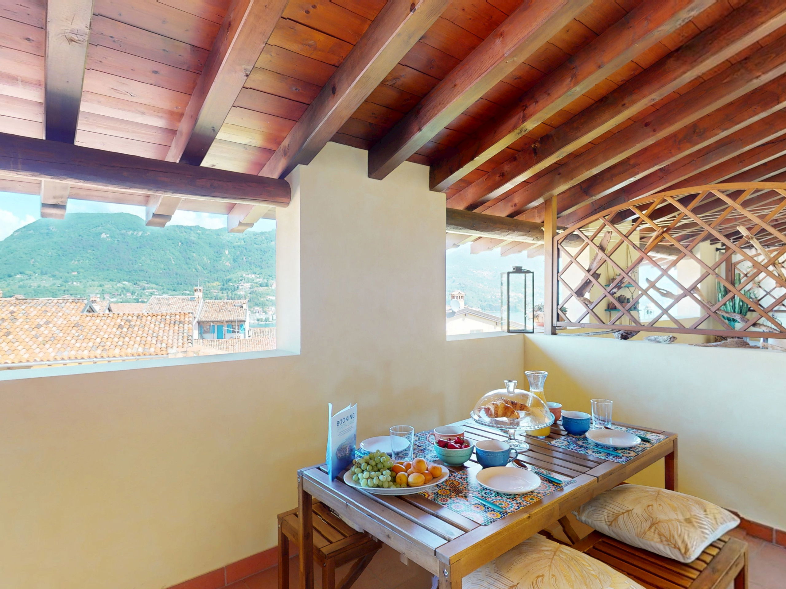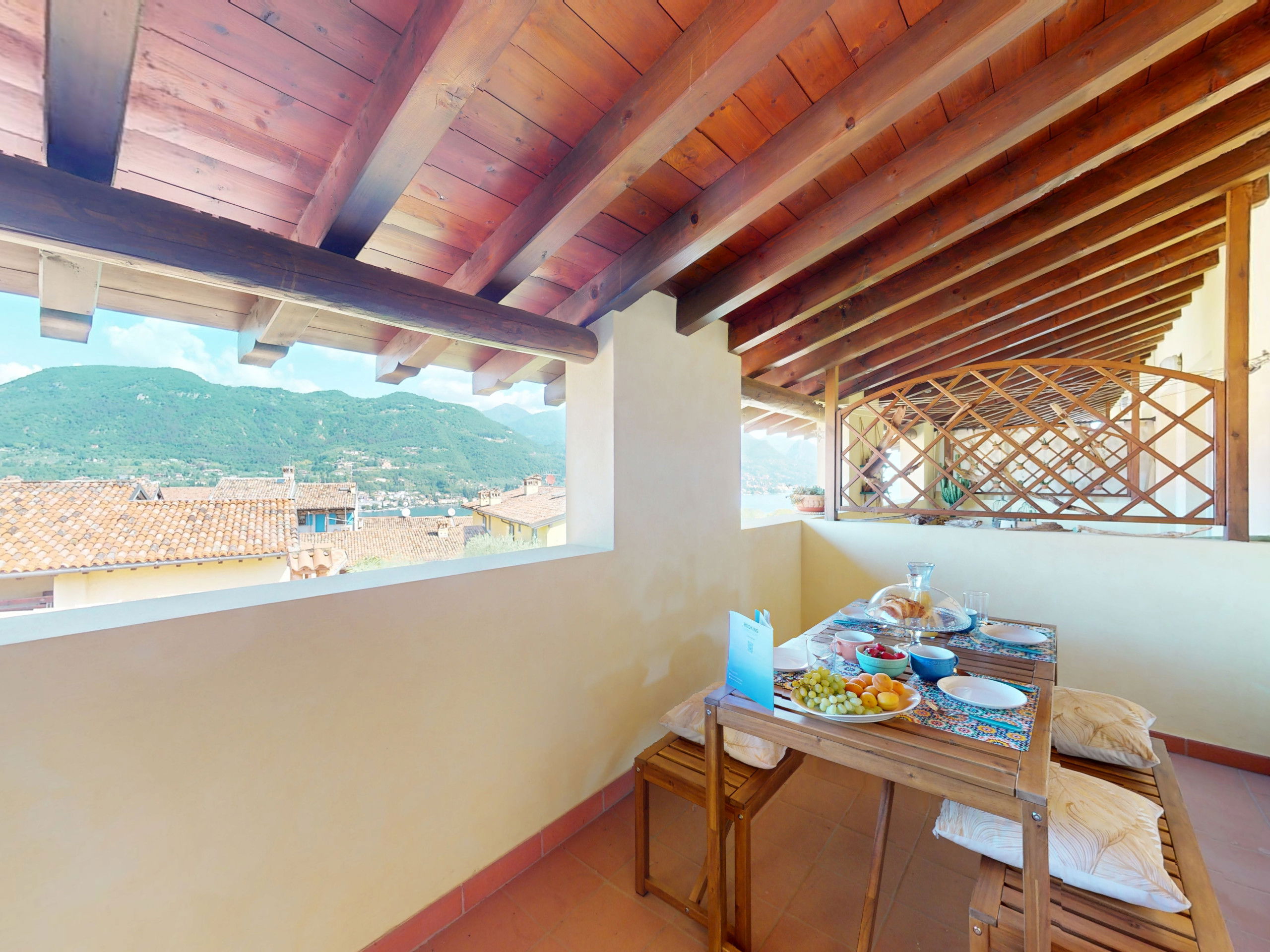 Going up to the upper floor, the space opens onto two bedrooms with suggestive exposed beams: the master bedroom, spacious and relaxing, opens onto a private terrace furnished with a table and chairs, offering a splendid view of the lake, perfect for an outdoor breakfast or a sunset aperitif.