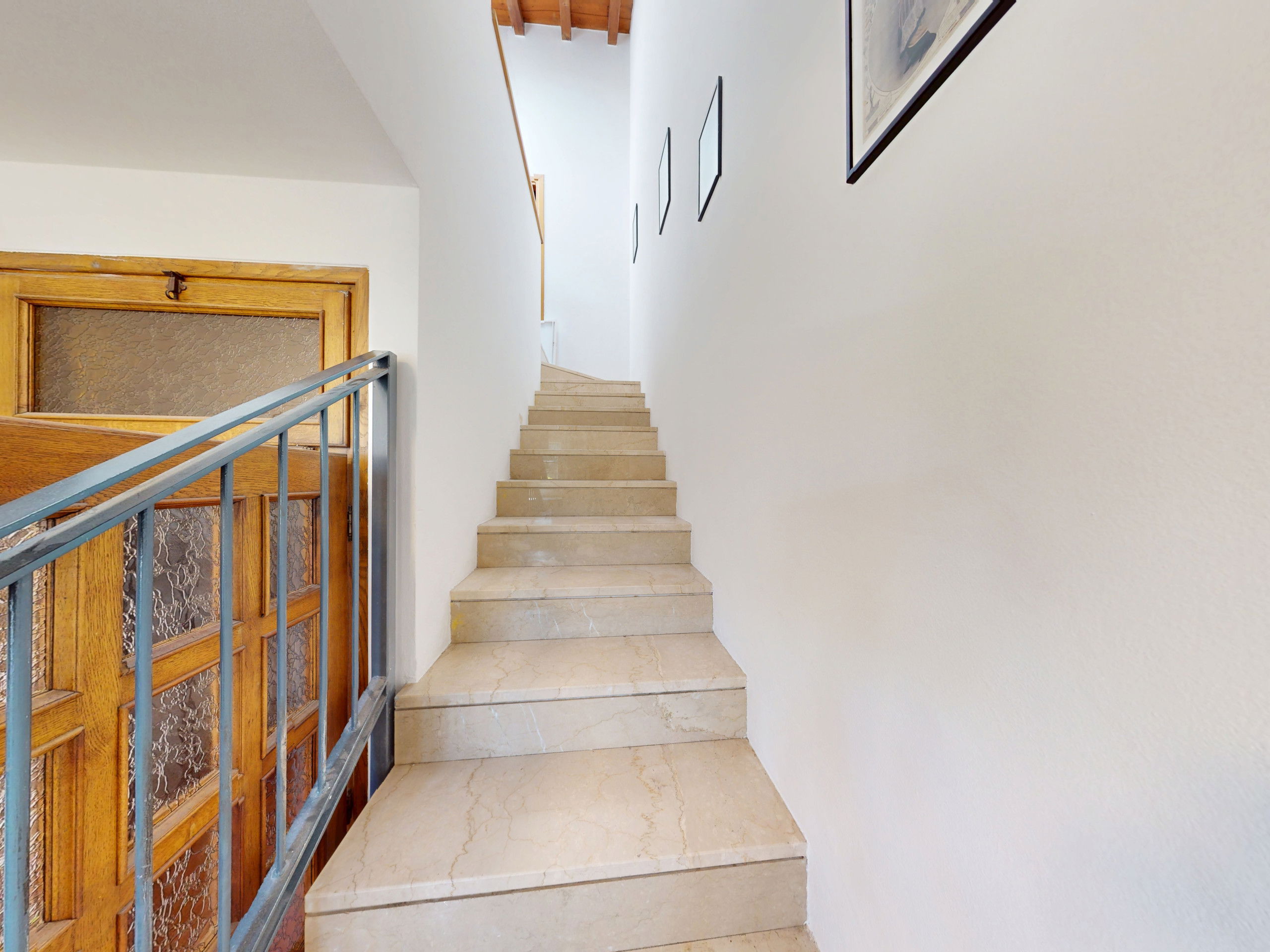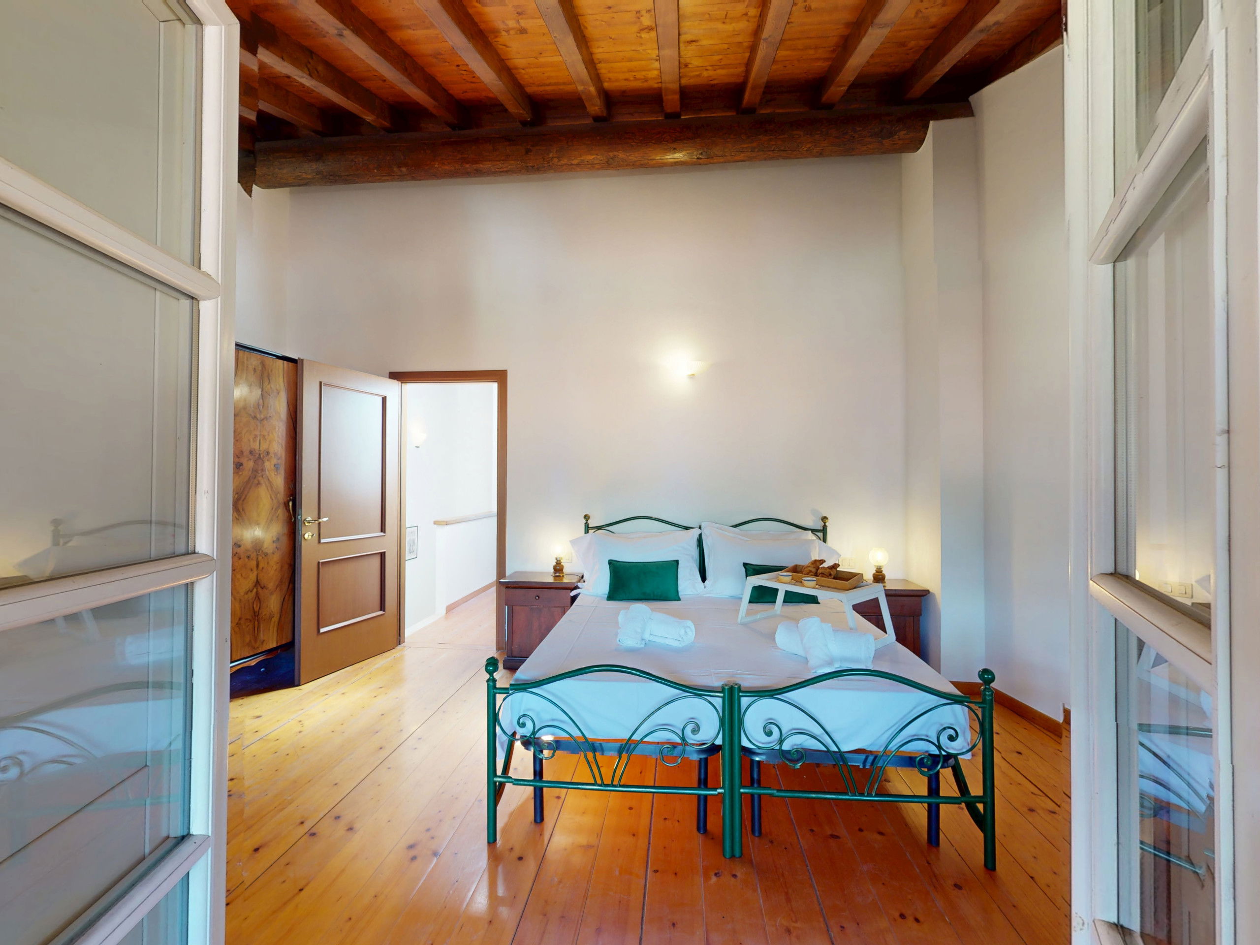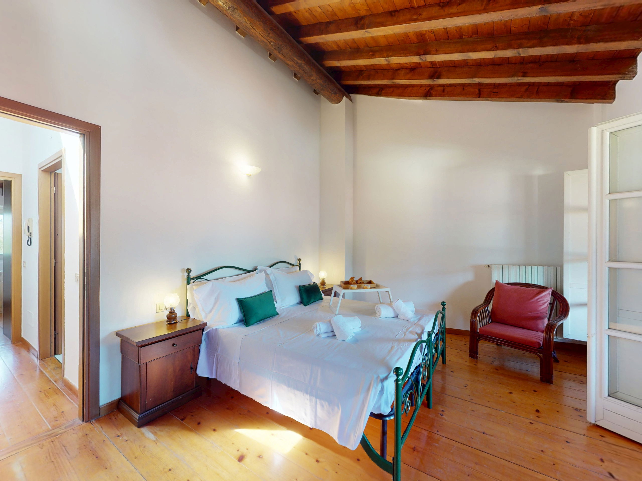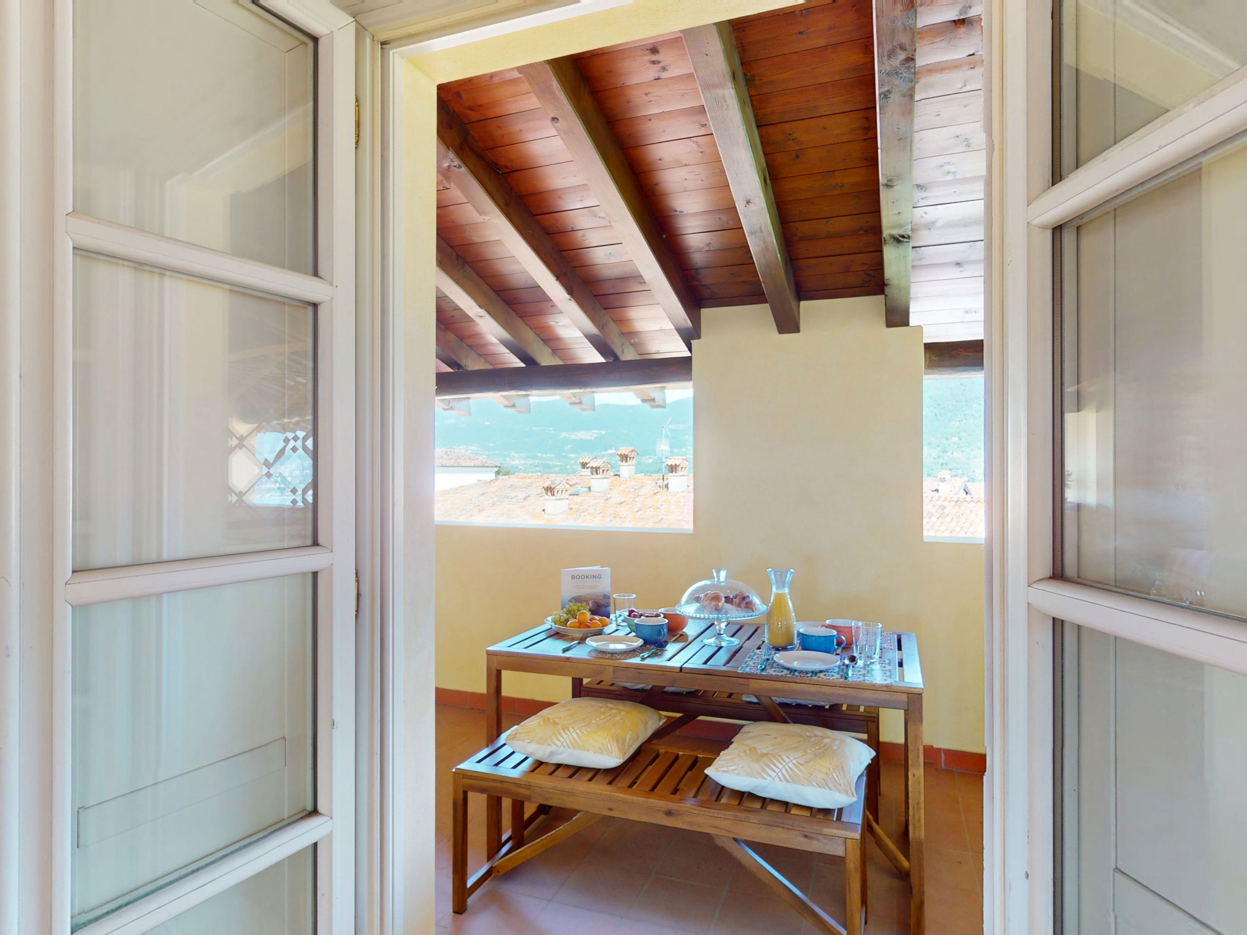 Going up to the upper floor, the space opens onto two bedrooms with suggestive exposed beams: the master bedroom, spacious and relaxing, opens onto a private terrace furnished with a table and chairs, offering a splendid view of the lake, perfect for an outdoor breakfast or a sunset aperitif.