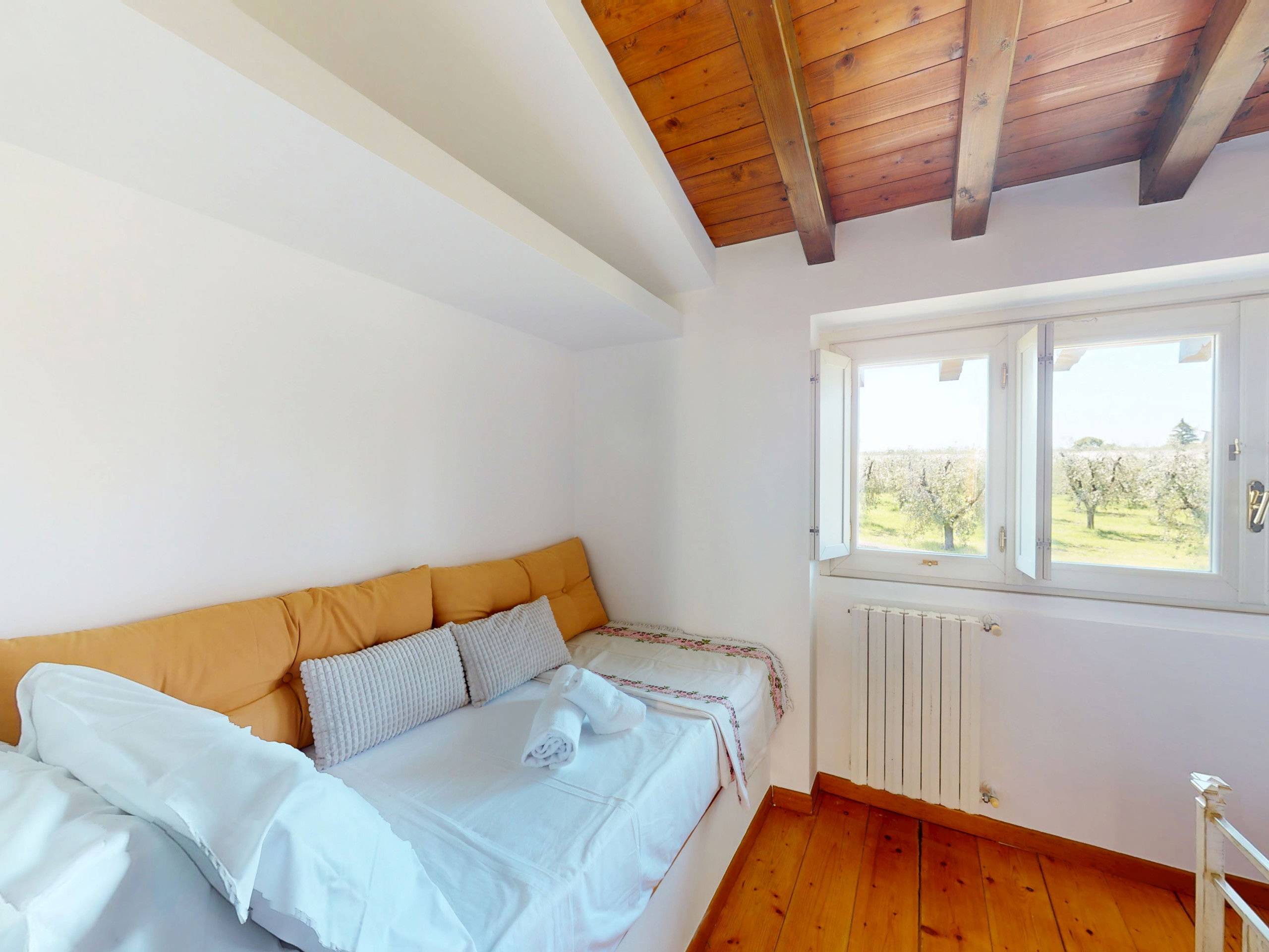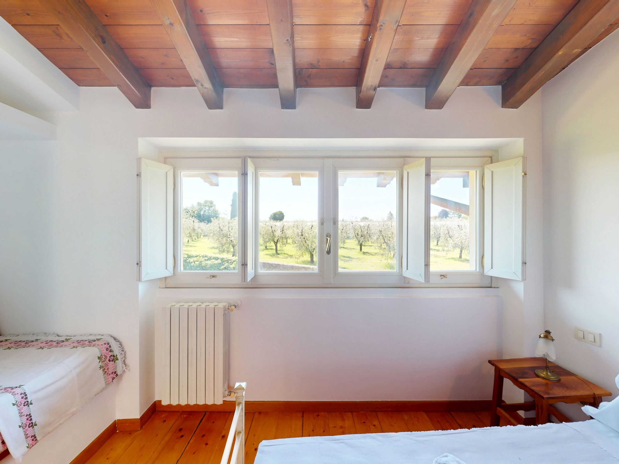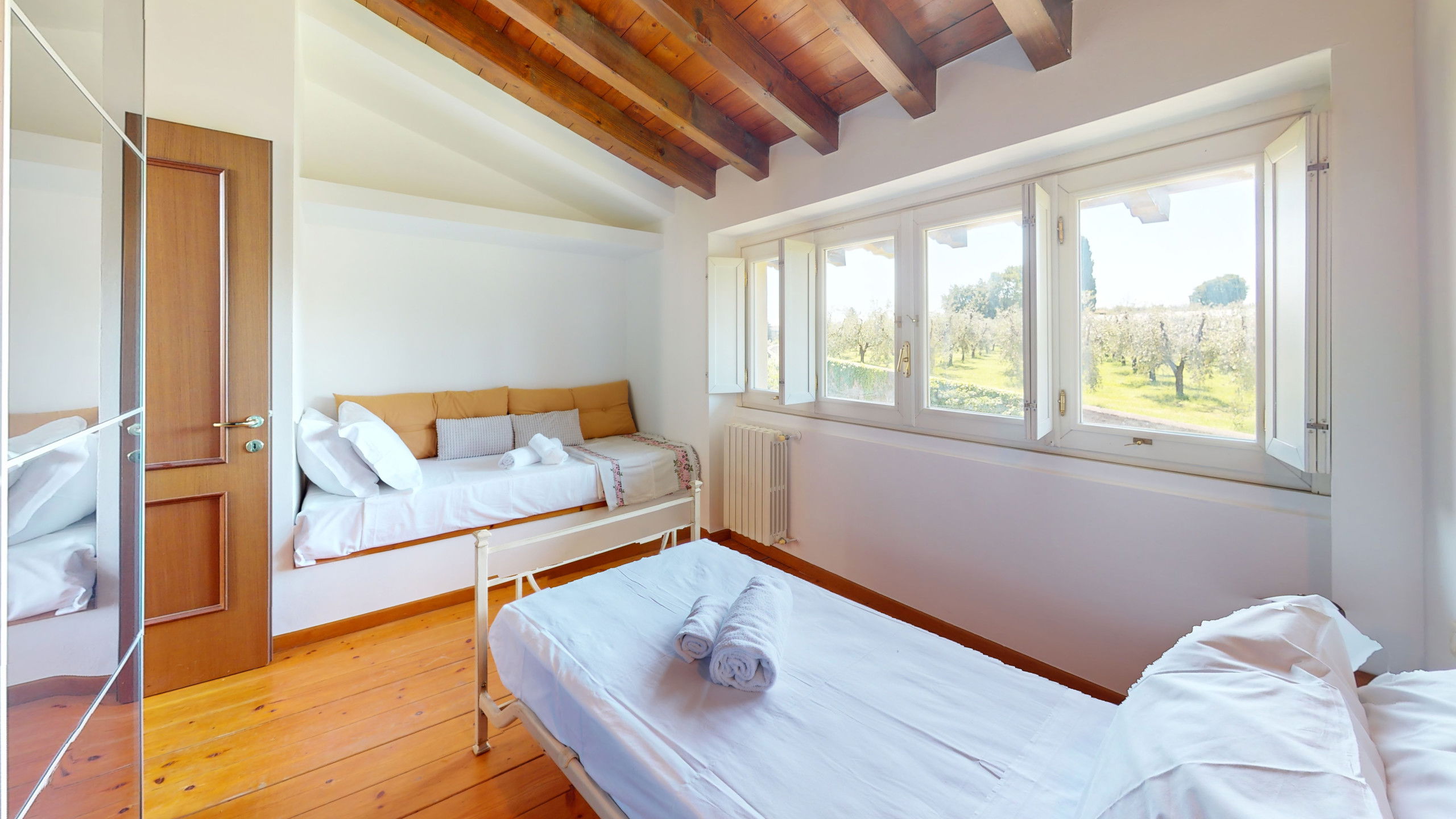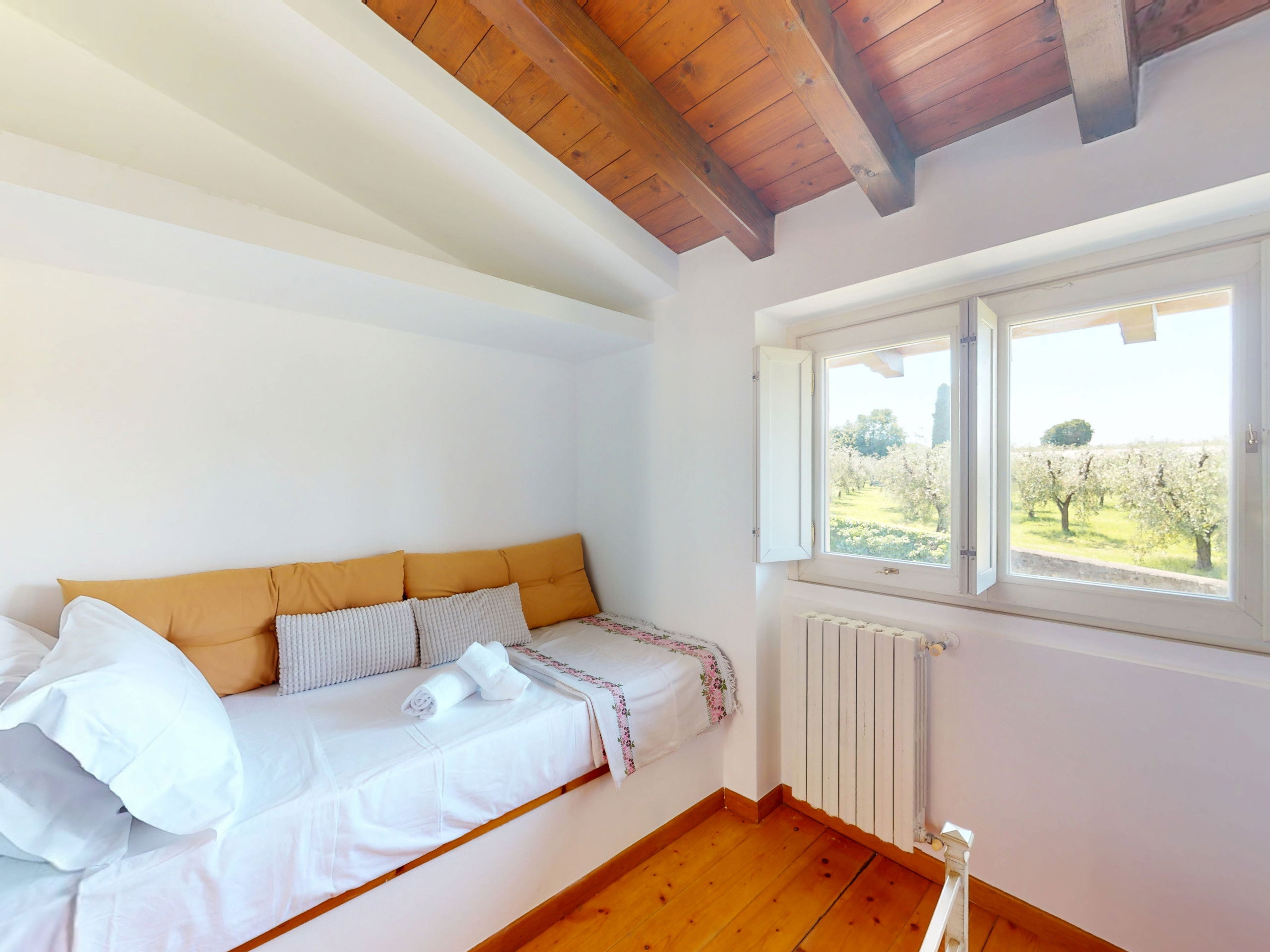The second bedroom, also bright and quiet, is furnished with two single beds and overlooks the green olive groves surrounding the area.