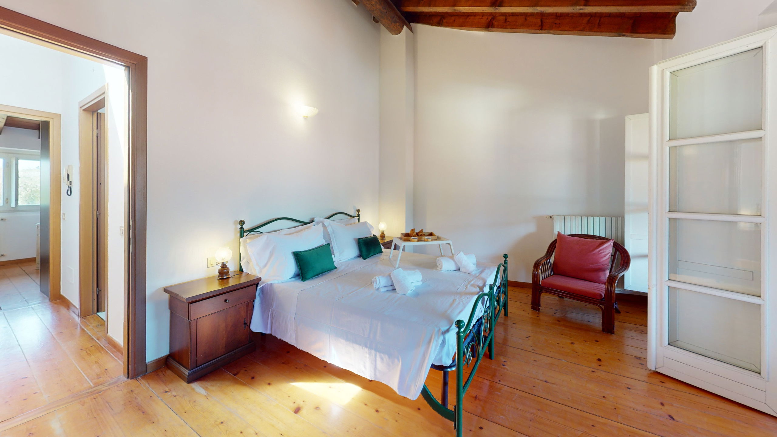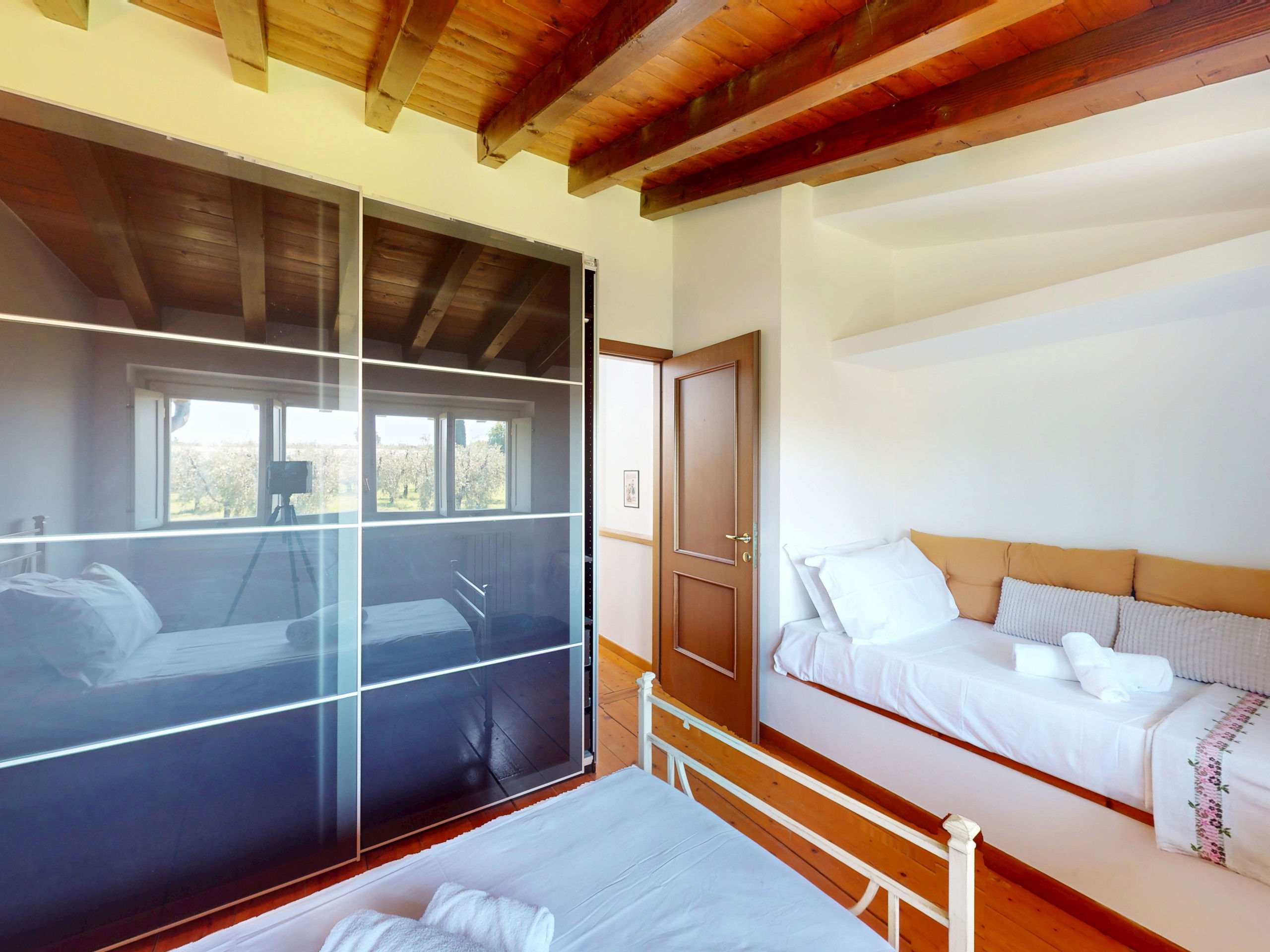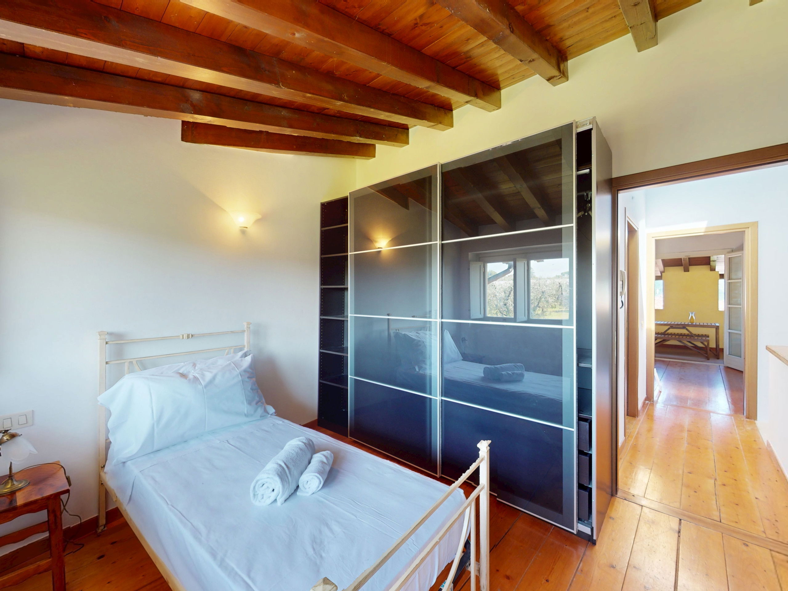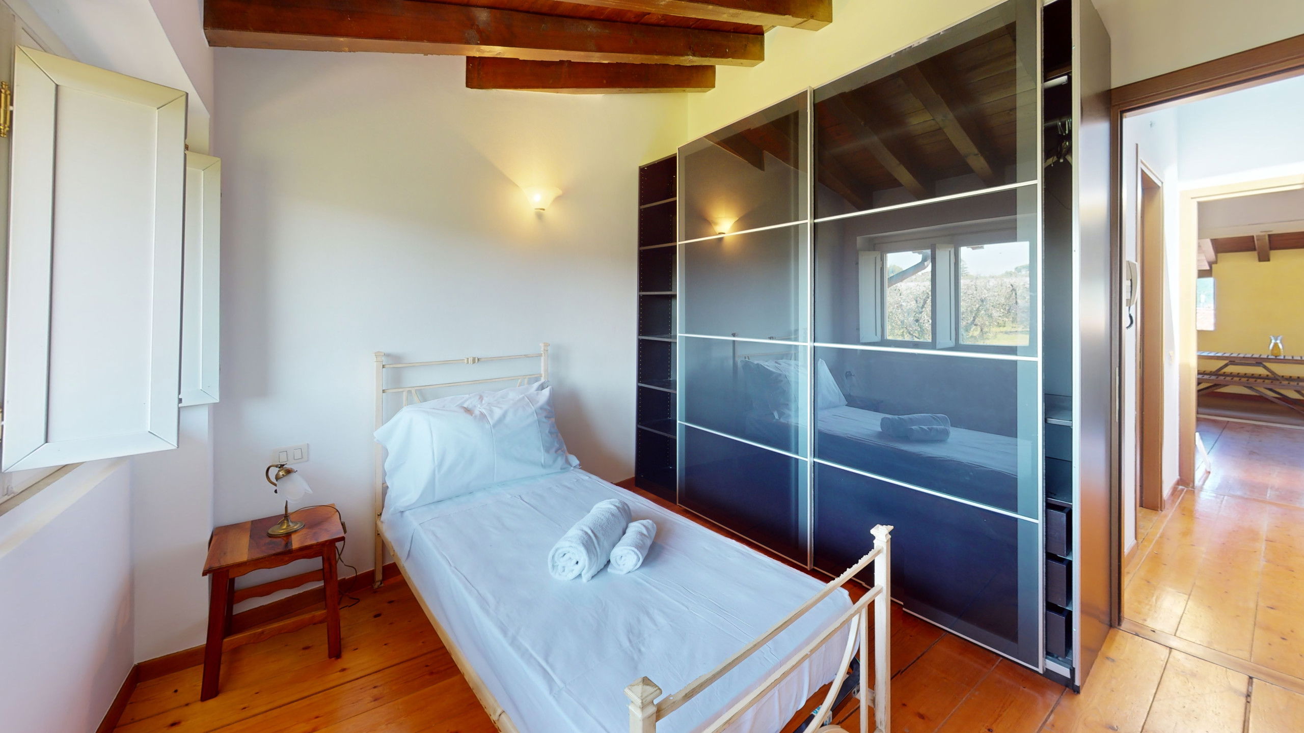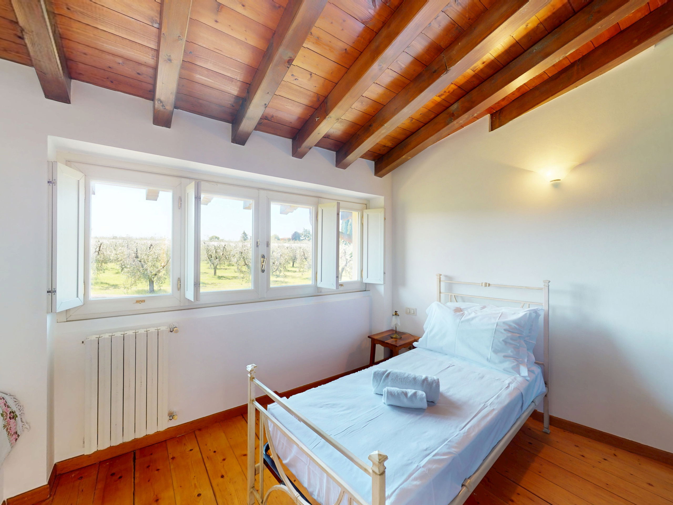 The second bedroom, also bright and quiet, is furnished with two single beds and overlooks the green olive groves surrounding the area.
