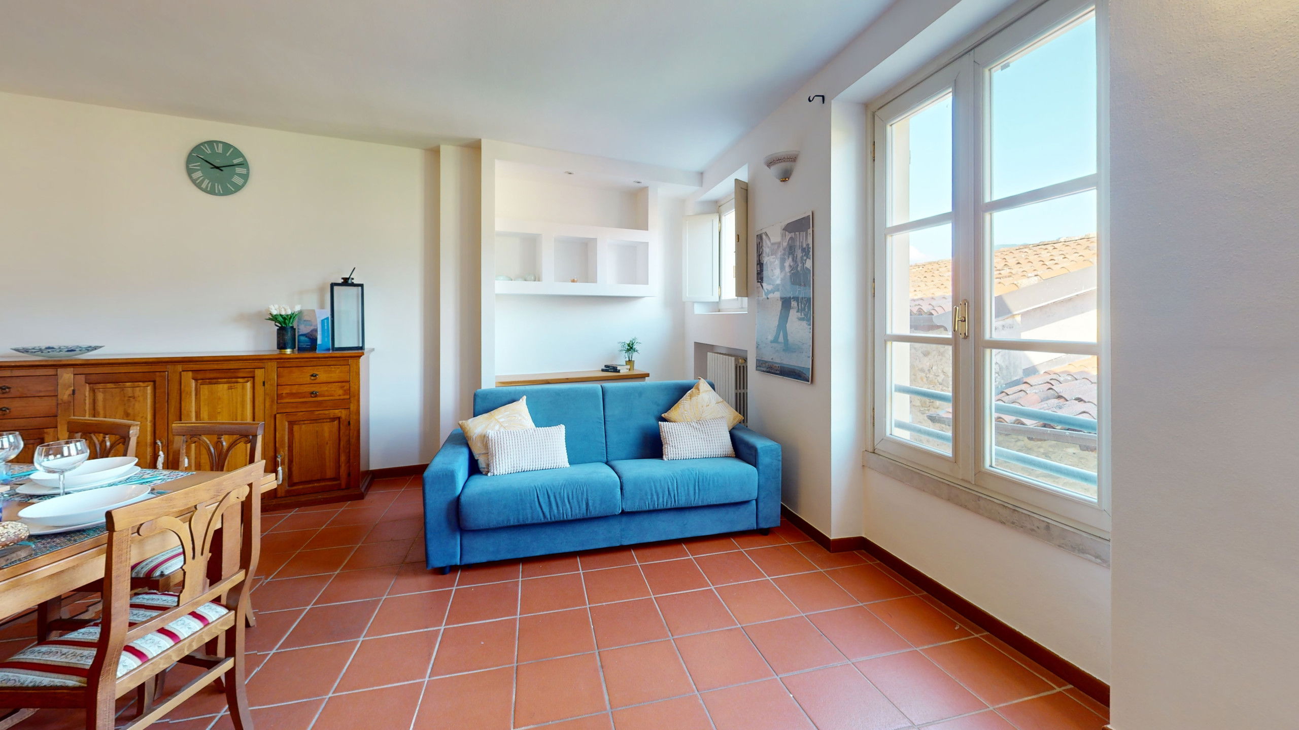 The living room, furnished with taste and attention to detail, features a comfortable sofa bed and Wi-Fi connection.
