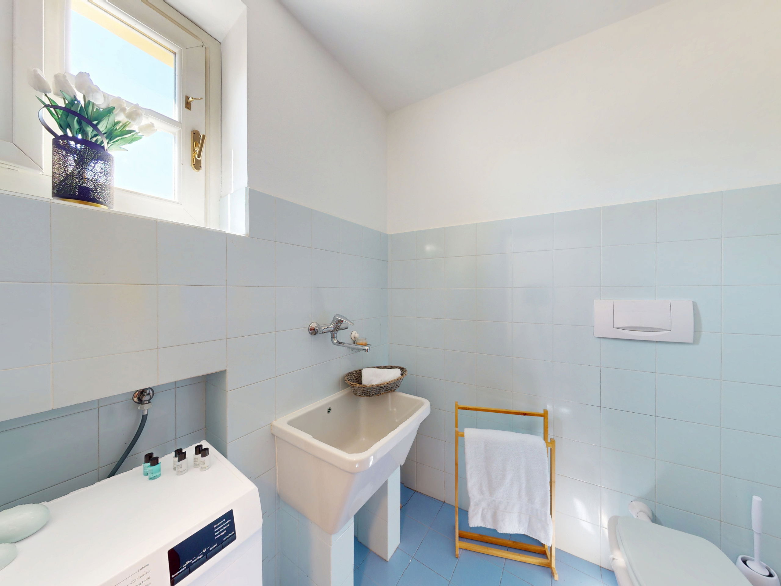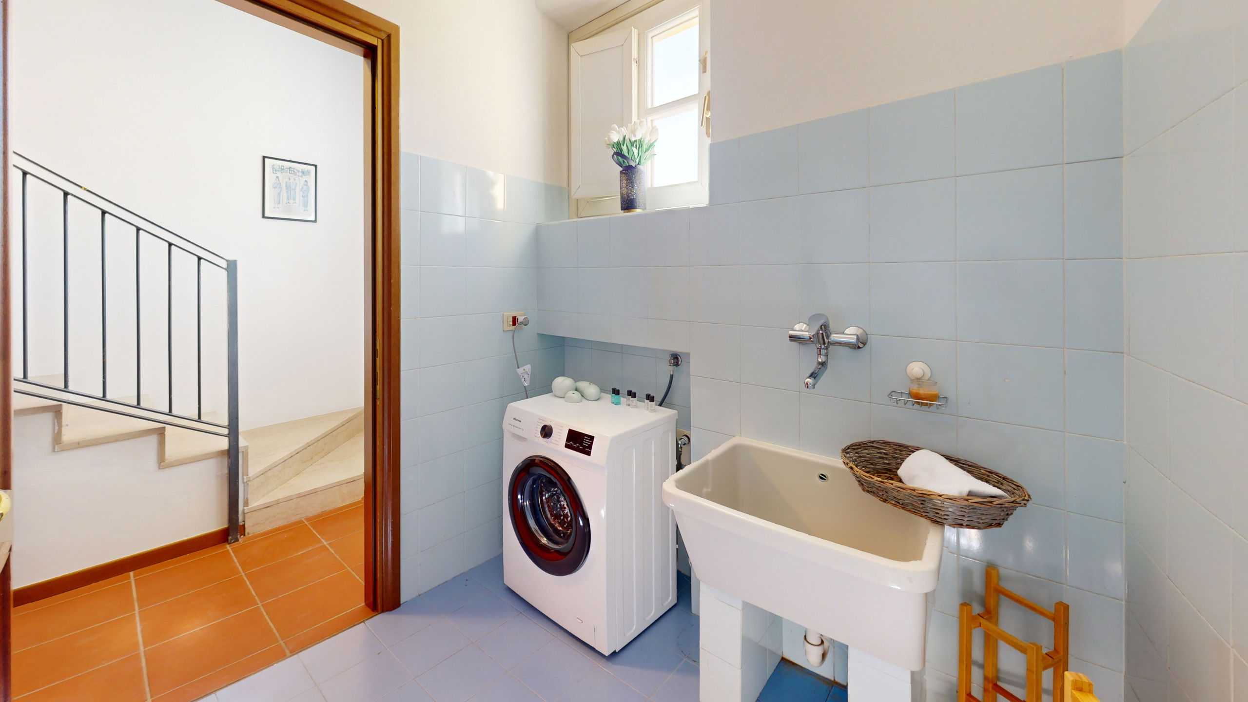 On the same floor, a practical bathroom with a washing machine.