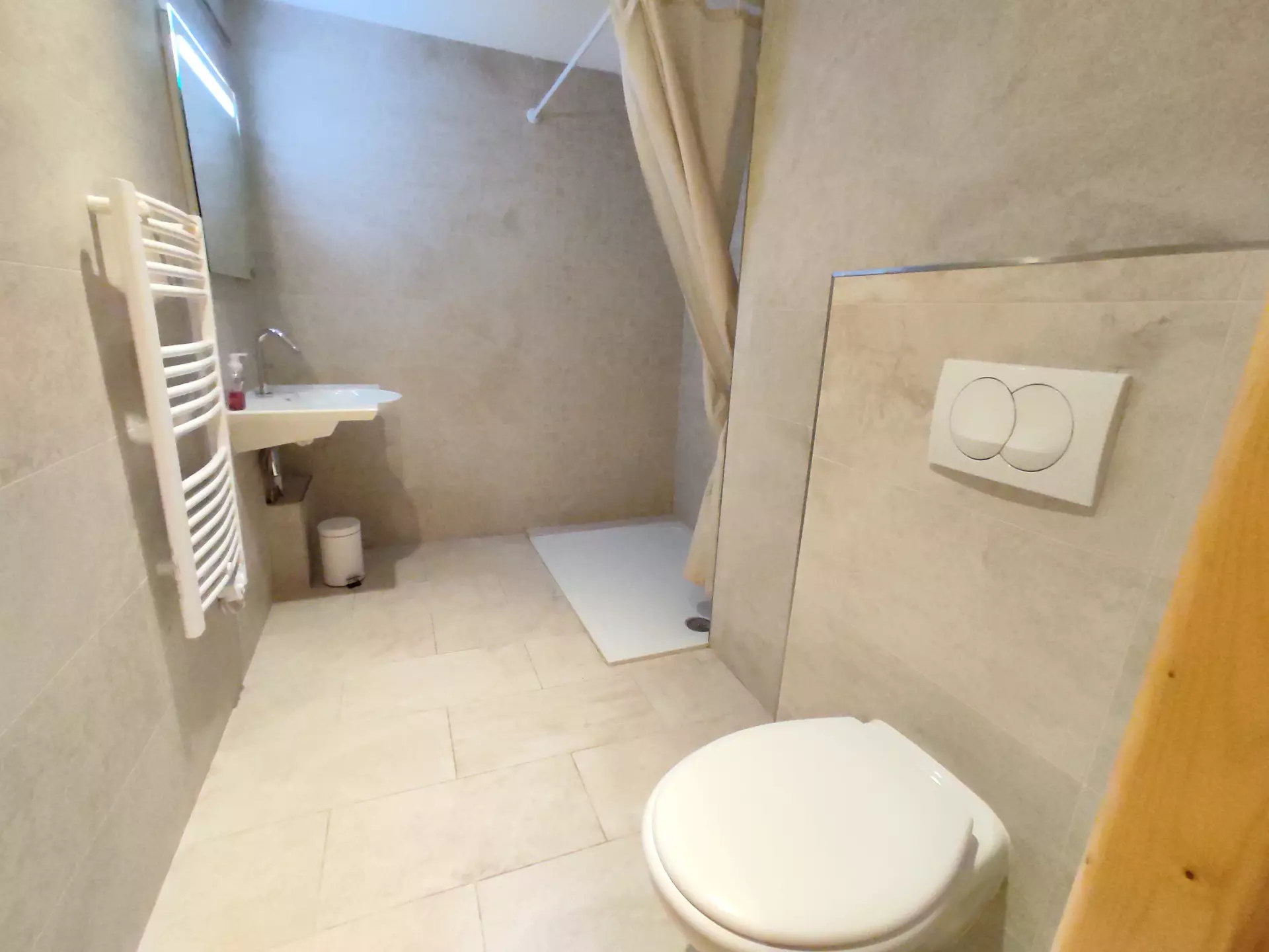 The ground floor bathroom is spacious and features a shower and toilet. Upstairs, you'll find a second bathroom with a bathtub and a separate toilet.