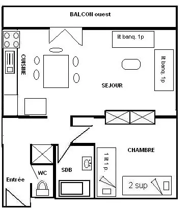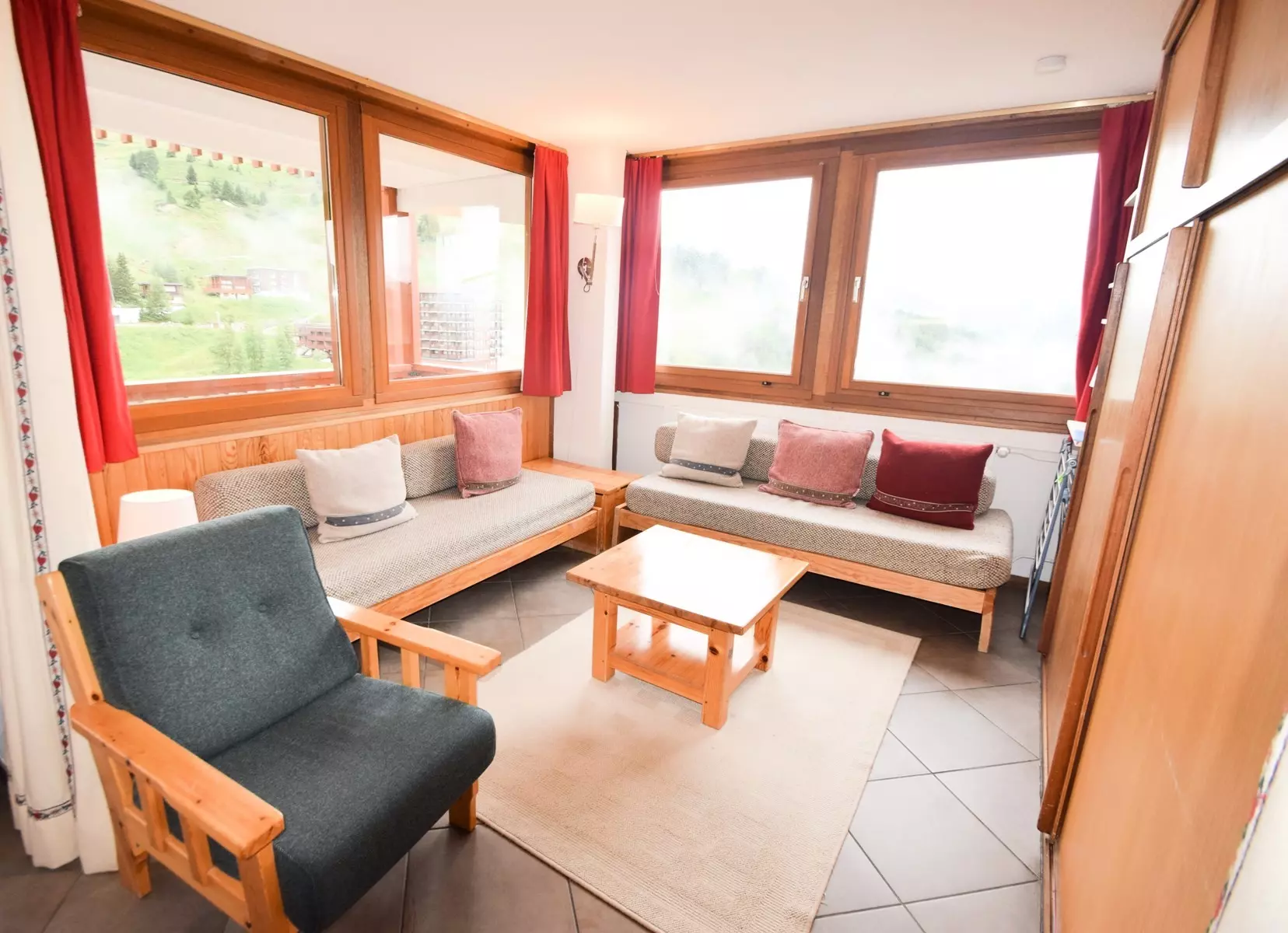 2-room apartment, 5 people, 41m2, West/North facing balcony, view of the resort - 7th floor with elevator Kitchen open to living room: 2 ceramic hobs, refrigerator, oven and microwave/grill oven, dishwasher, electric coffee maker - Living room: 2 single beds, dining area, TV - Bedroom: 2 bunk beds, 1 single bed - Bathroom: bathtub - Separate WC - Bedding: blankets - Floors: carpet, bathroom/entrance/living room: tiled - Pets not allowed. Very bright apartment, located in the heart of the resort. NO SMOKING - End of stay cleaning, sheets, towels and ski passes optional. WIFI - Ski locker n°71 on the ground floor -